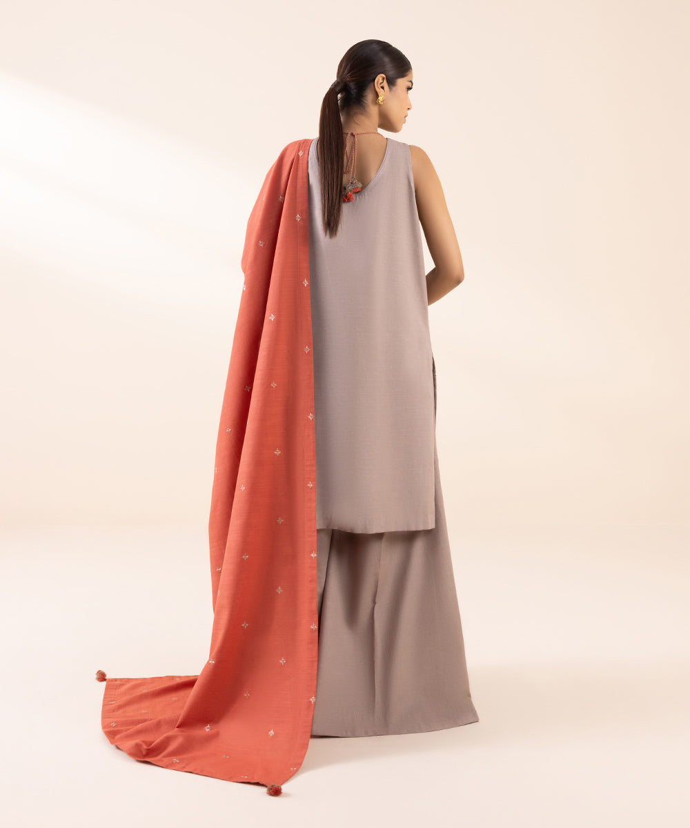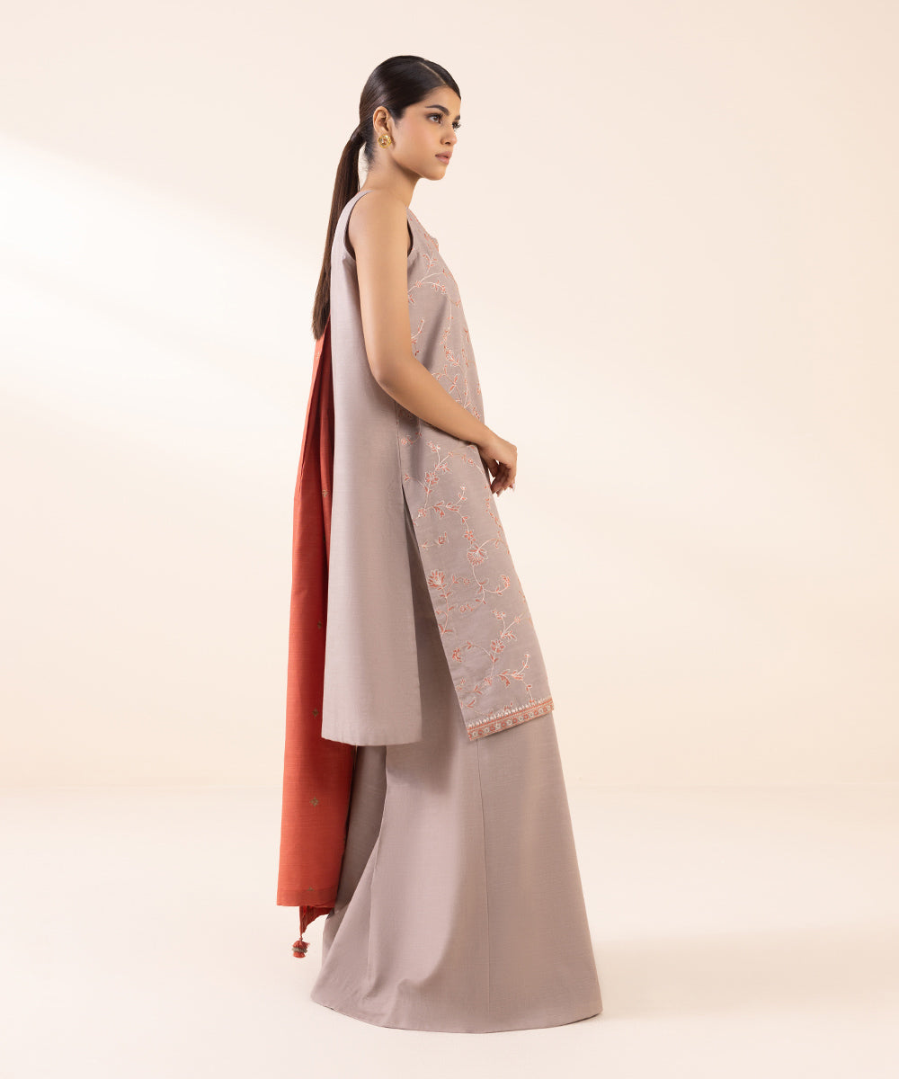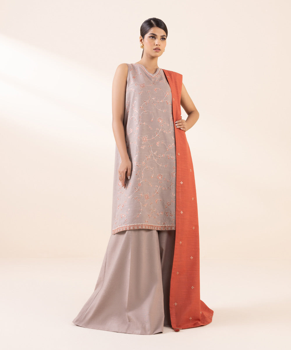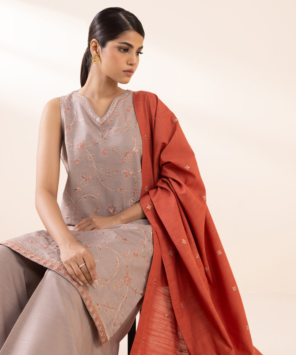 Step out confidently this fall in our mauve blush and orange two-piece including a light khaddar embroidered shirt and solid trousers.