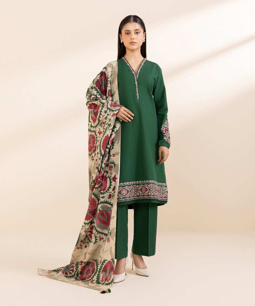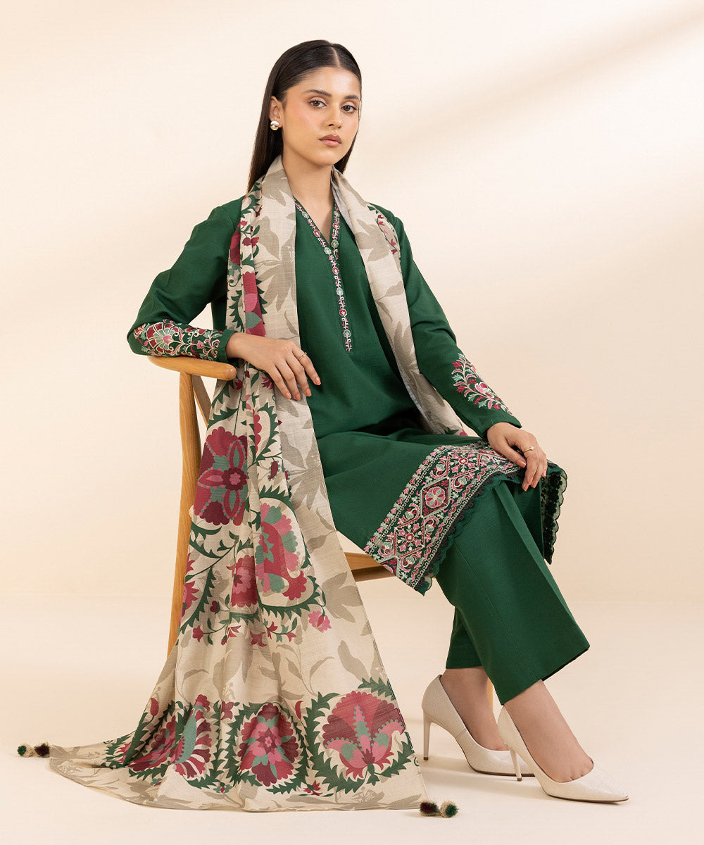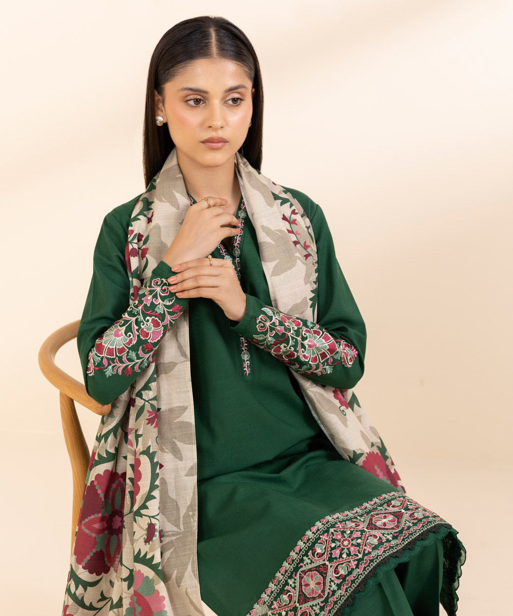 Make a statement this winter in our two-piece embroidered, green khaddar shirt with a Trouser
