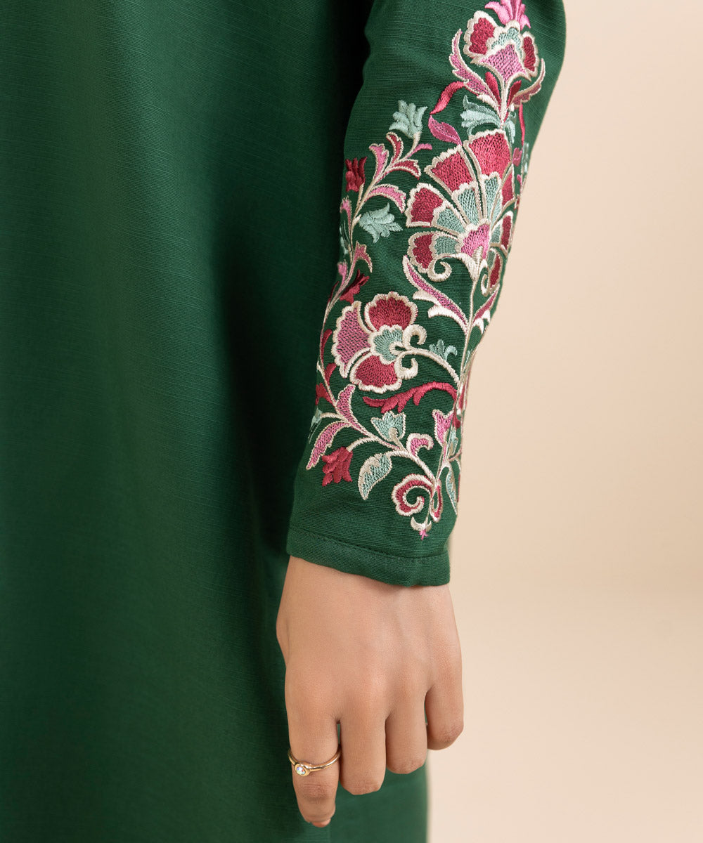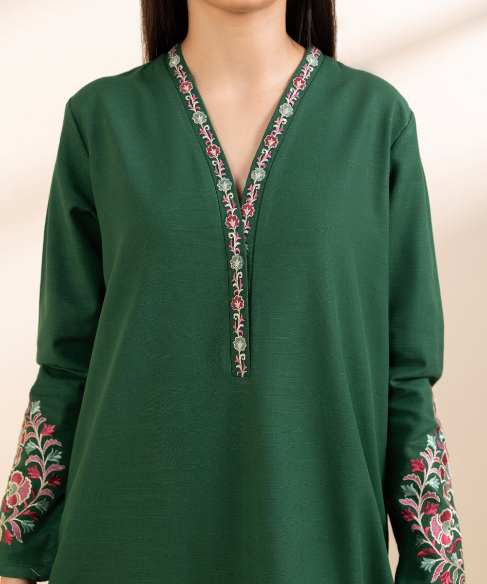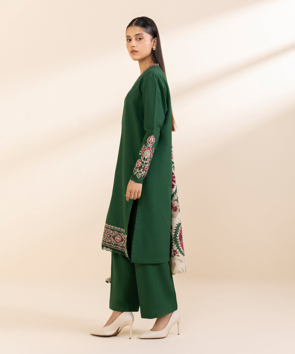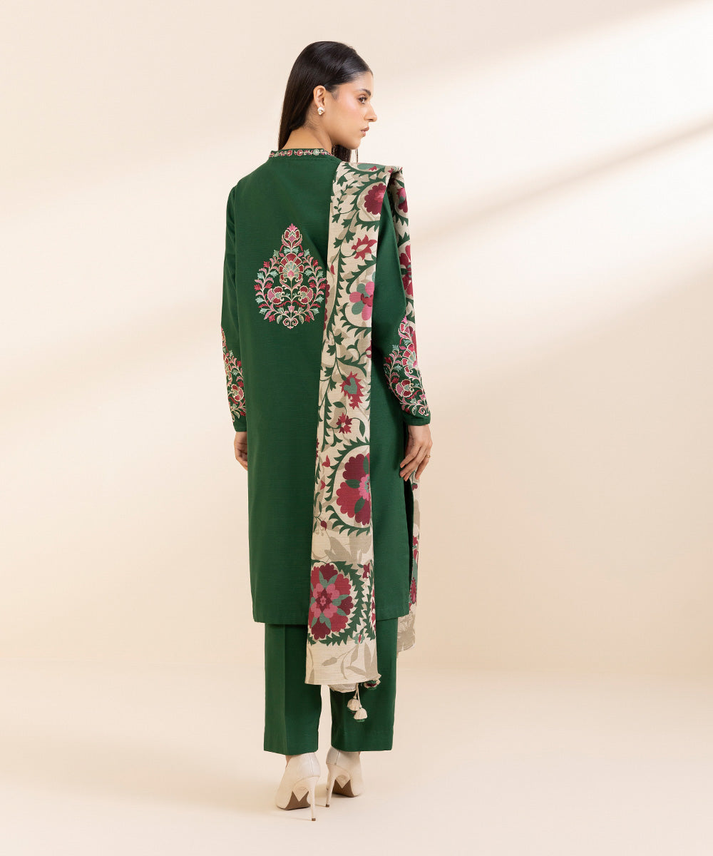 Make a statement this winter in our two-piece embroidered, green khaddar shirt with a Trouser