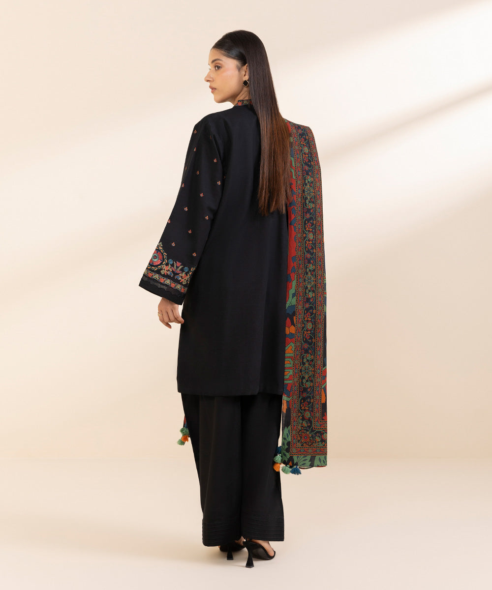 Embrace winter chill with our solid embroidered two-piece black and multi-coloured light khaddar shirt with trouser