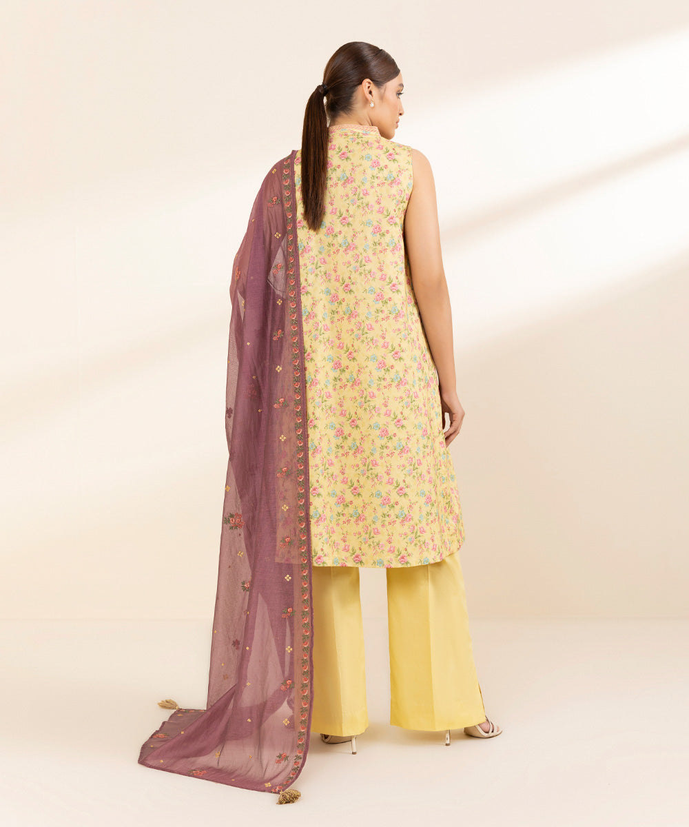 Make a statement in our yellow and pink lawn two piece Printed suit with a blended muslin dupatta.