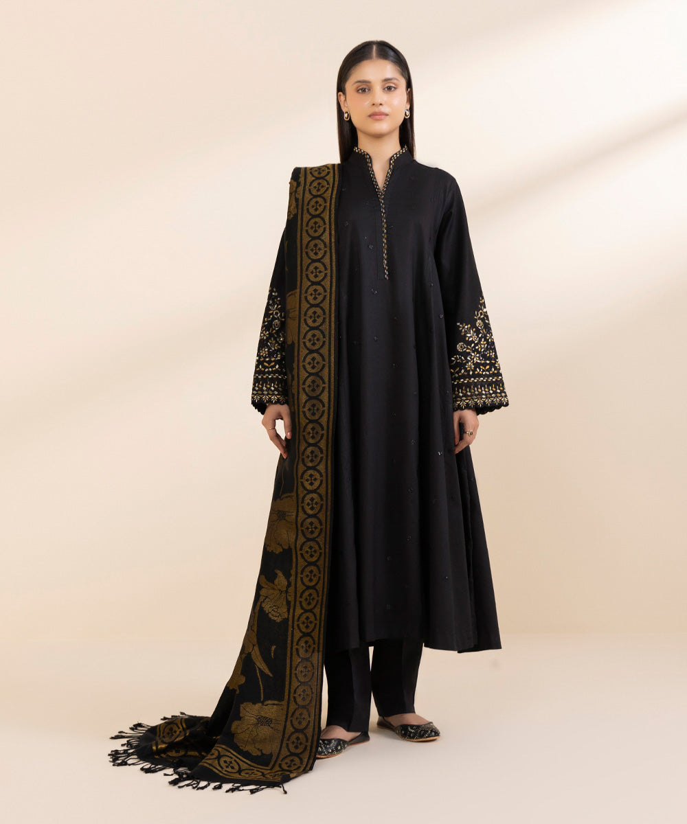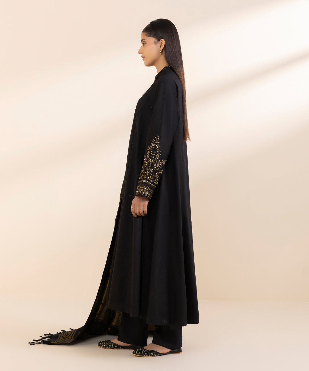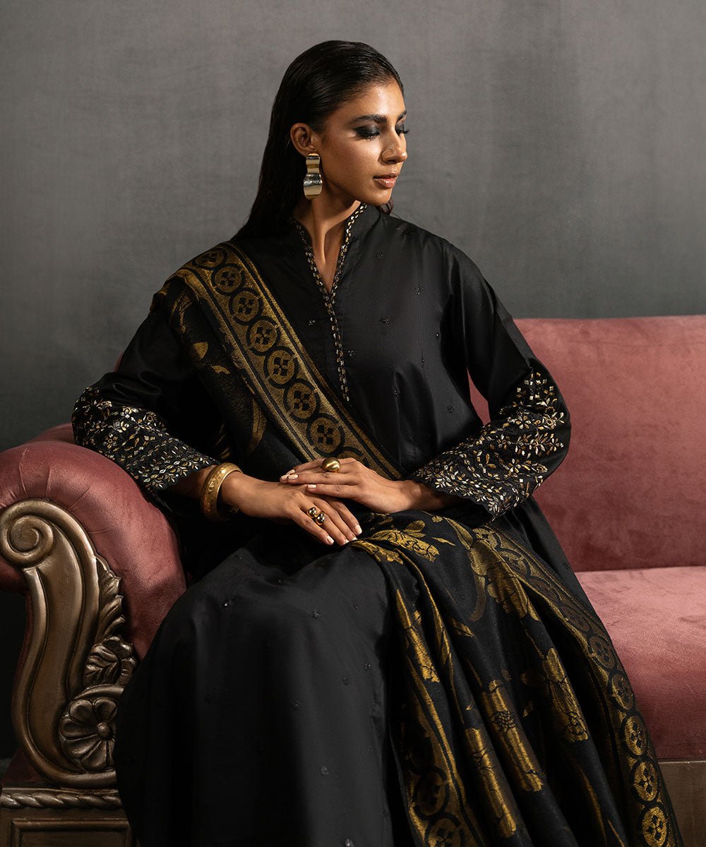 Make a statement this winter in our two-piece embroidered, black linen suit with a trouser