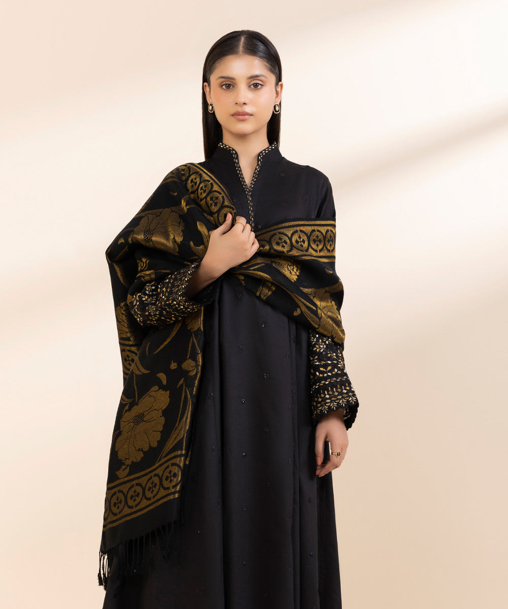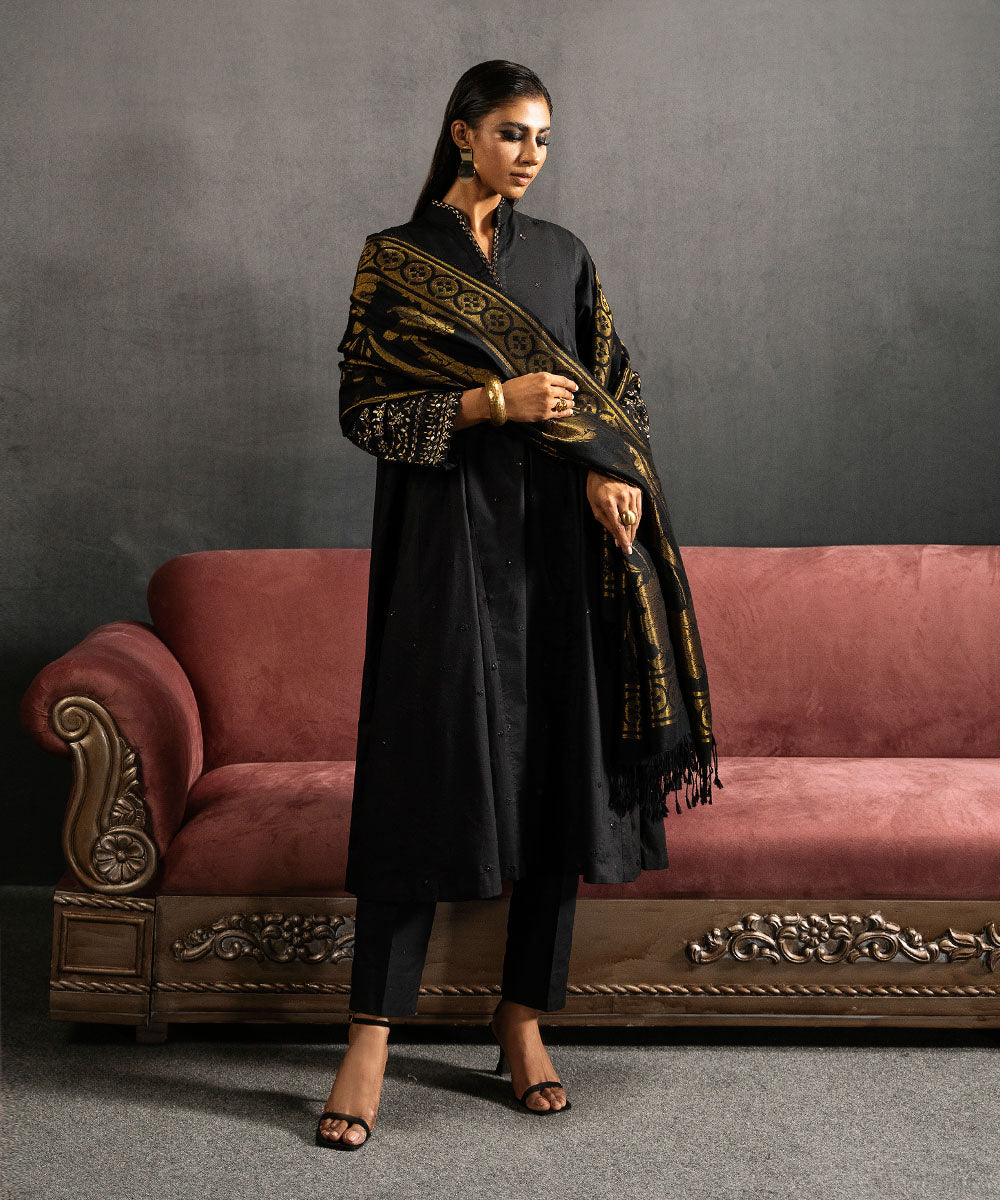 Embrace winter chill with our two-piece embroidered black light khaddar shirt with trouser.