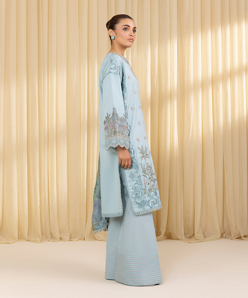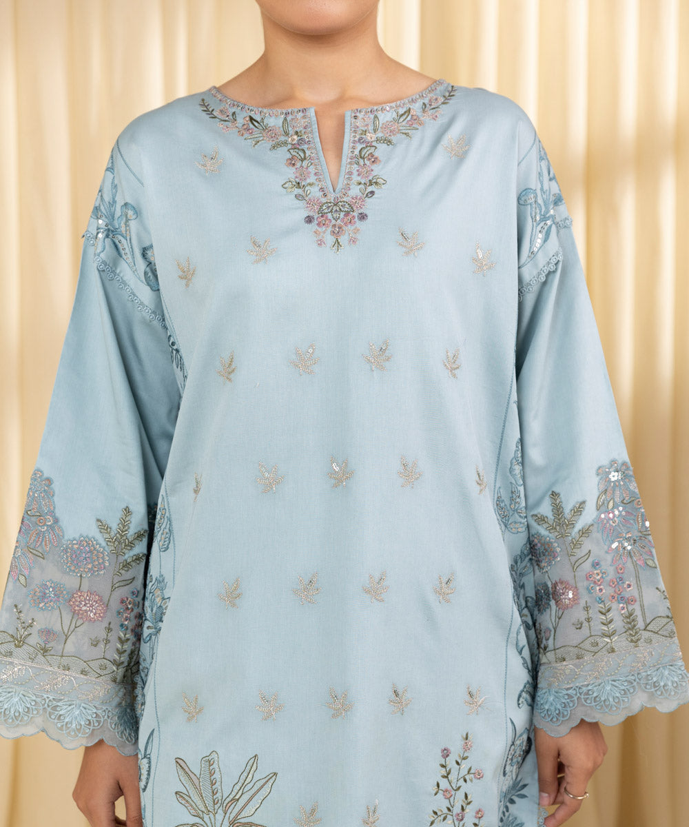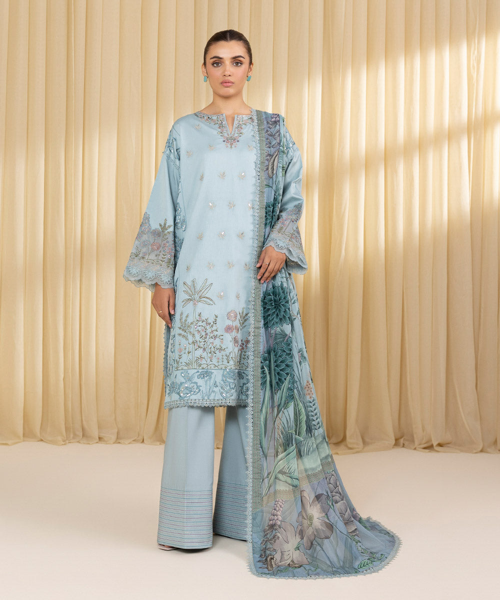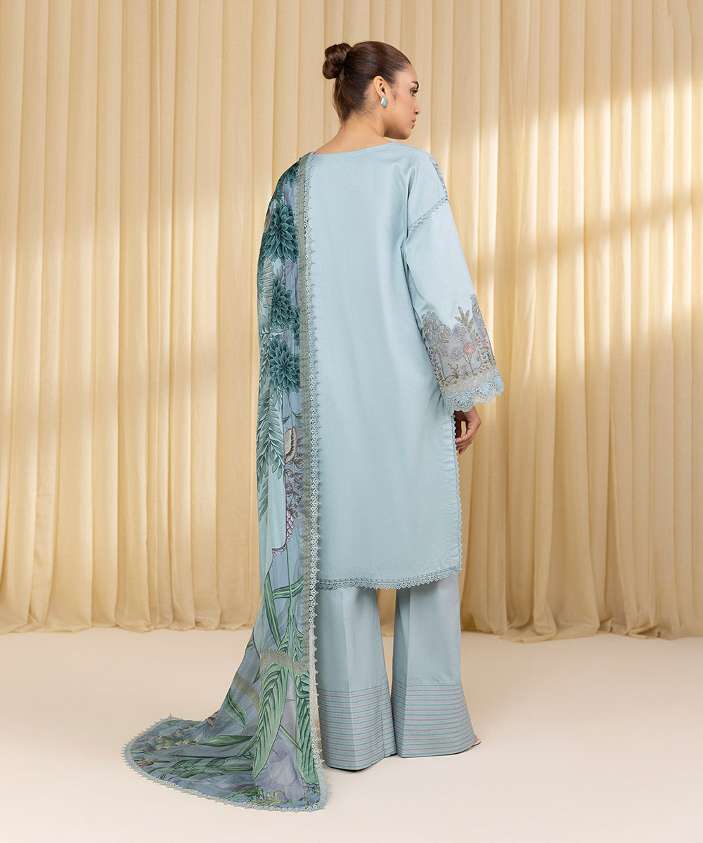 Make a statement in our embroidered aqua textured lawn shirt and cotton trousers ensemble with a bemberg tissue dupatta.