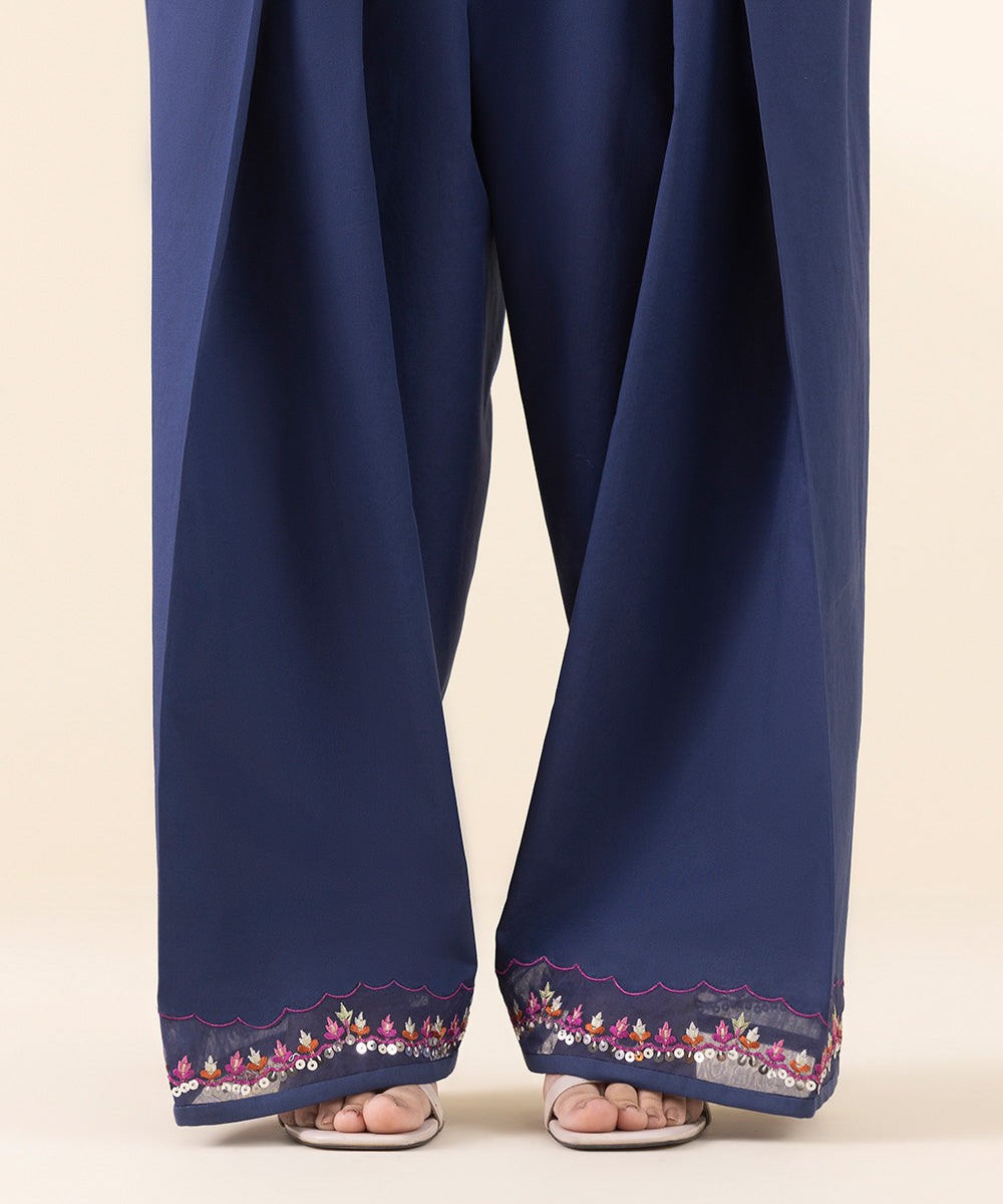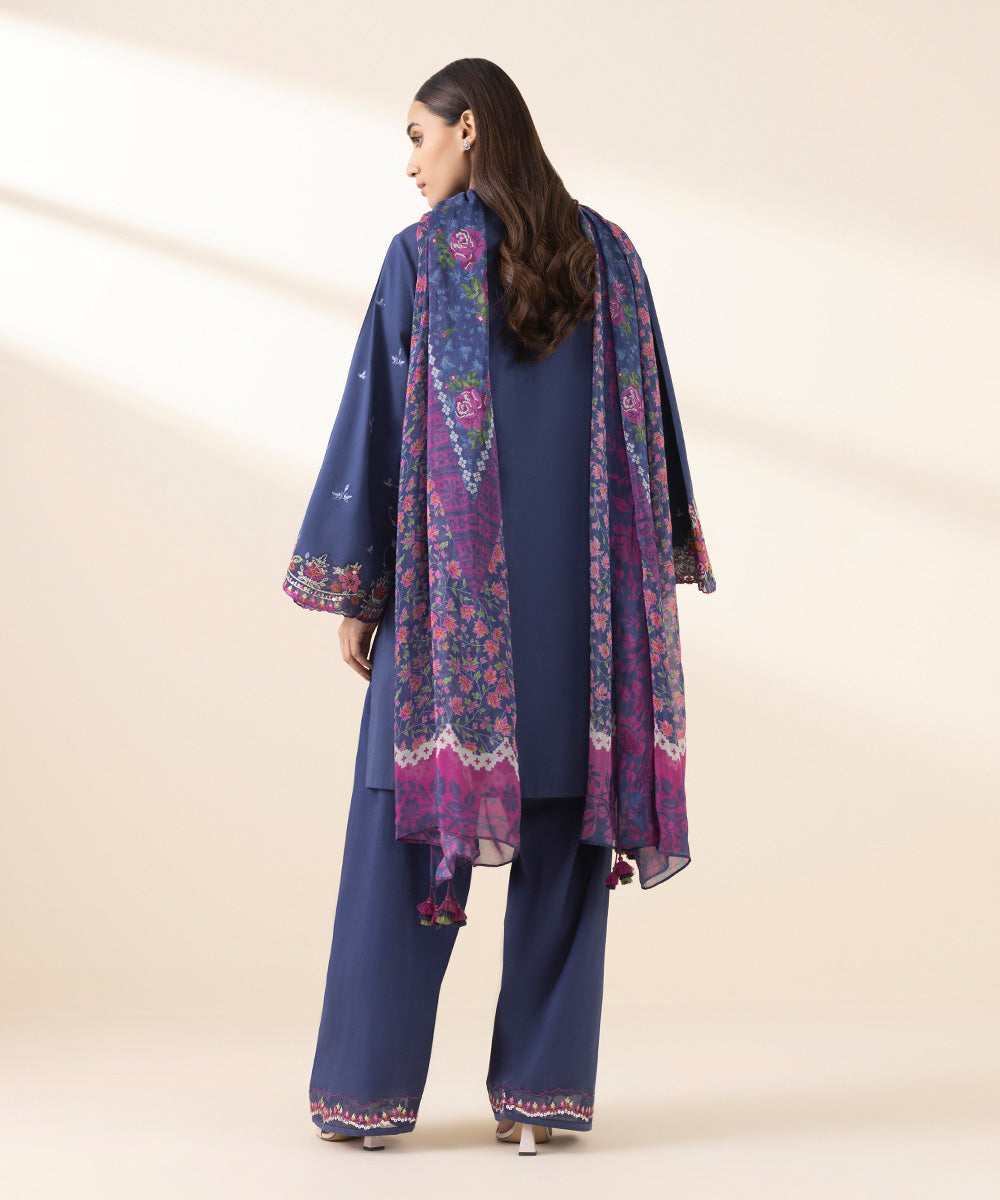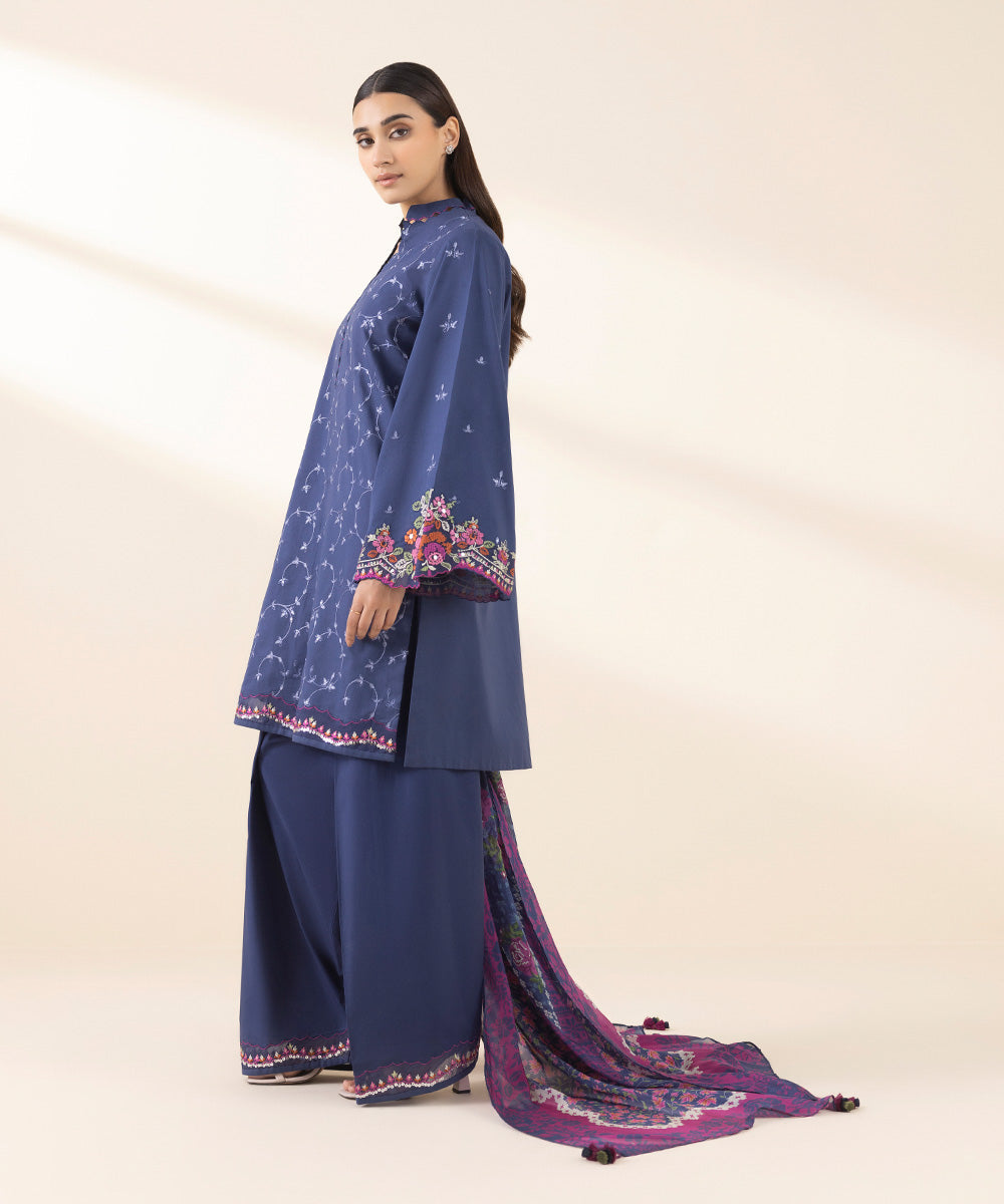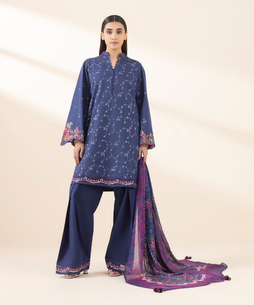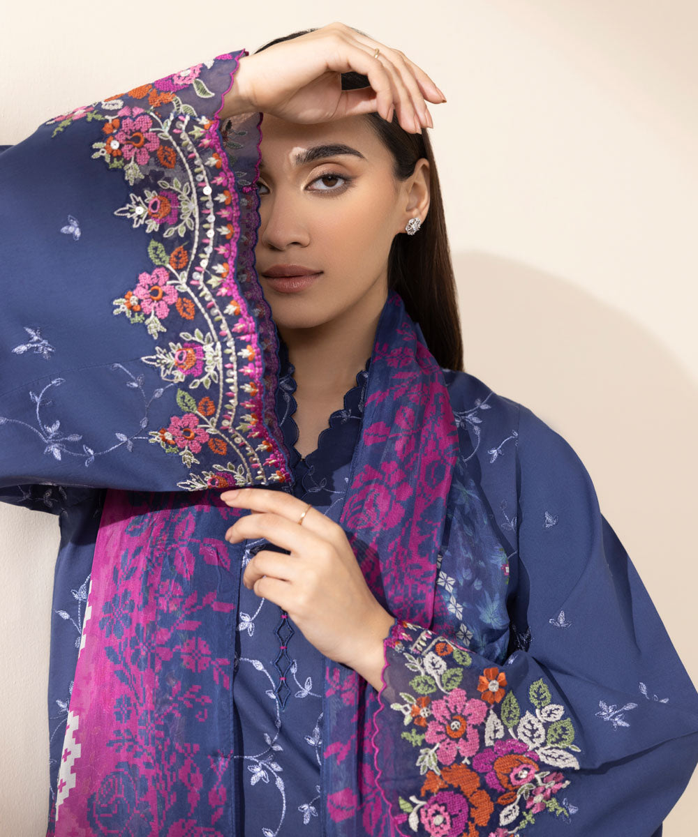 Make a statement with our two-piece embroidered ensemble in blue and pink featuring a textured lawn shirt paired with cotton trousers.
