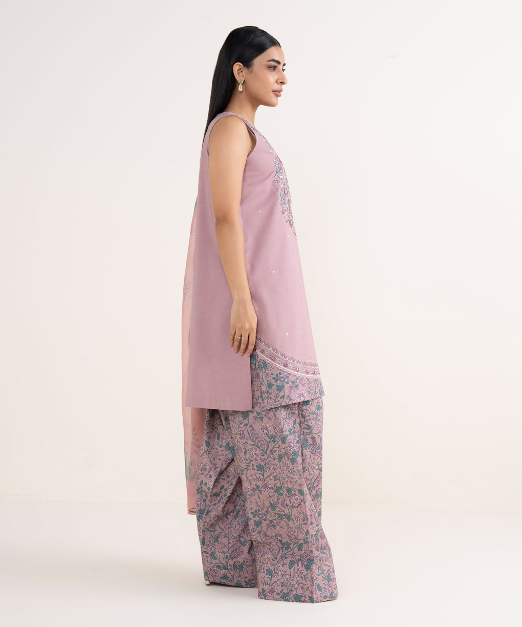 Elevate your style with our light mauve three-piece embroidered ensemble featuring a cotton viscose shirt paired with a blended chiffon dupatta and cotton trousers.