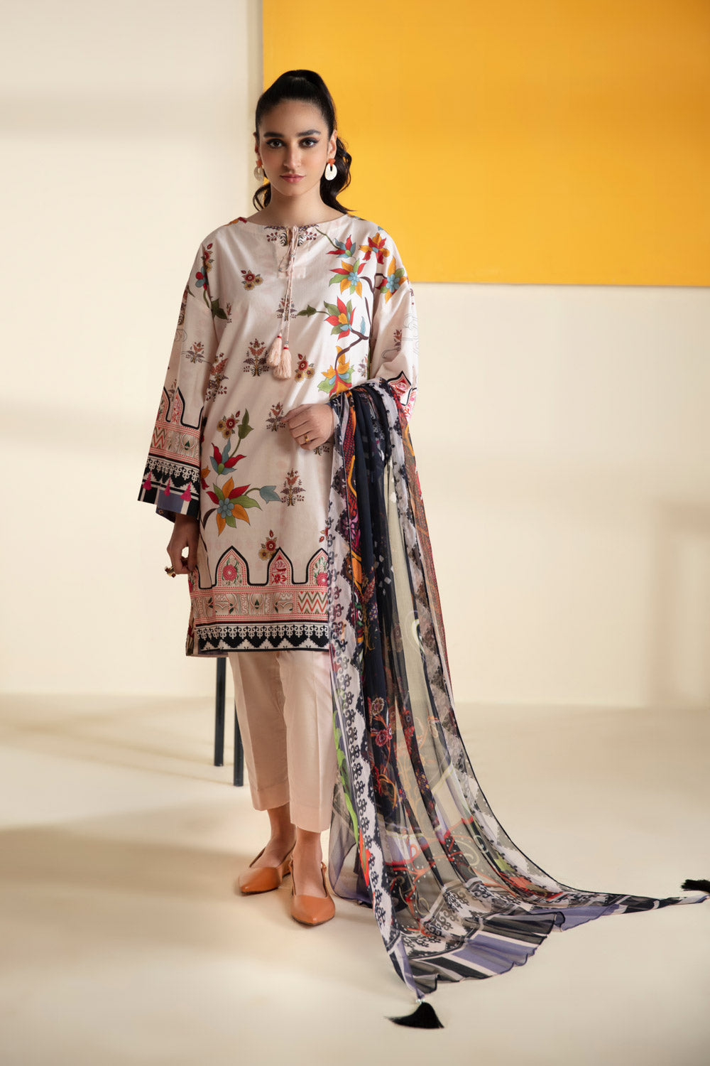 Revel in sophistication with this unstitched outfit, portraying a classic fusion of a traditional and floral print. This light pink three piece is paired with cotton trousers and a digital printed blended chiffon dupatta.