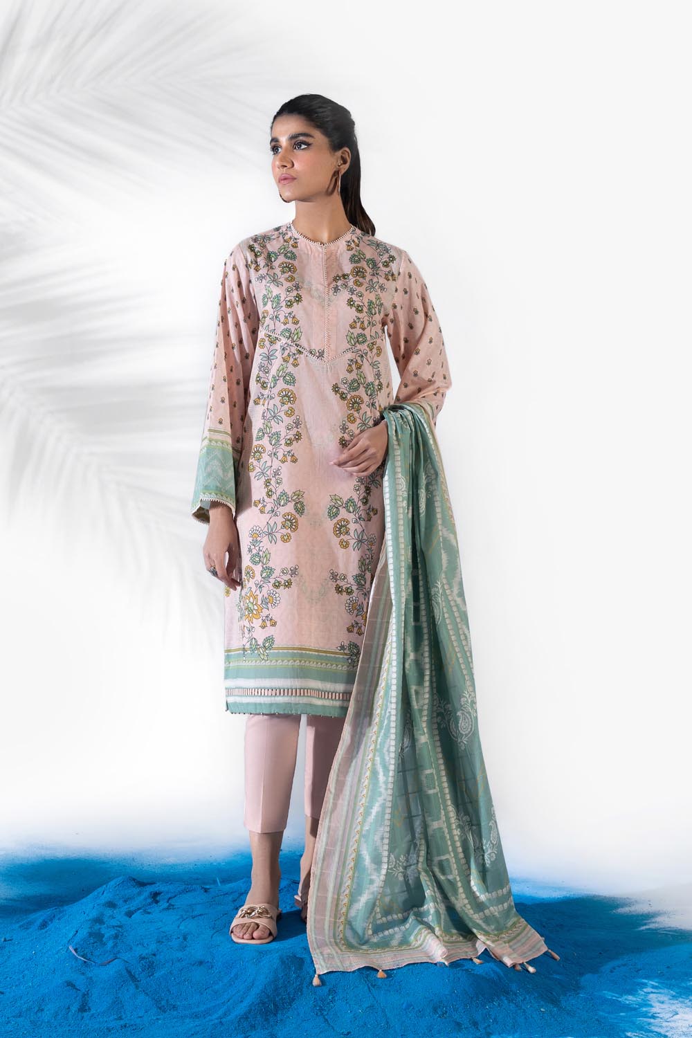 Enhance your chic style with this elegant unstitched peach three piece lawn suit with green accents, complemented by a matching textured voile dupatta and cotton trousers.