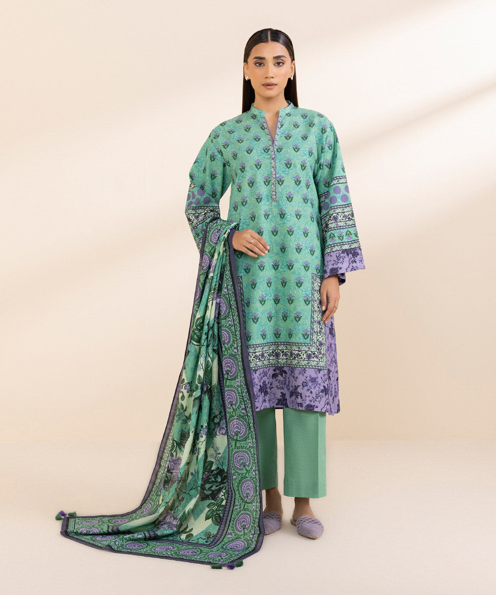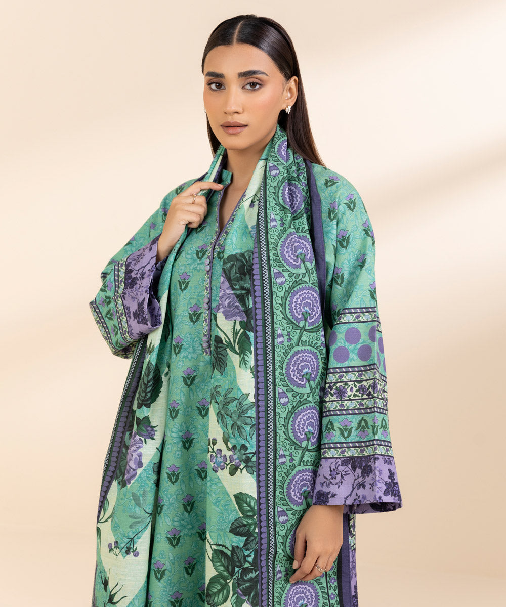 Perfect your winter style with our printed two-piece ensemble in Sea Green featuring a printed khaddar shirt paired with matching trousers