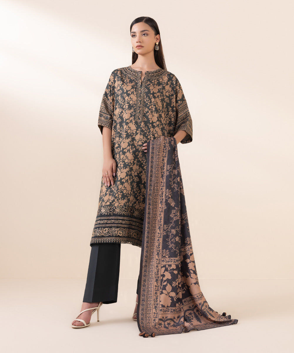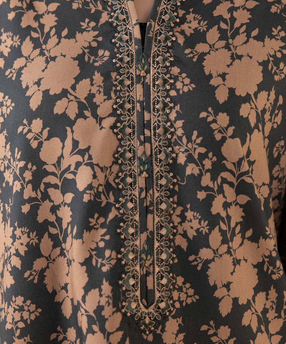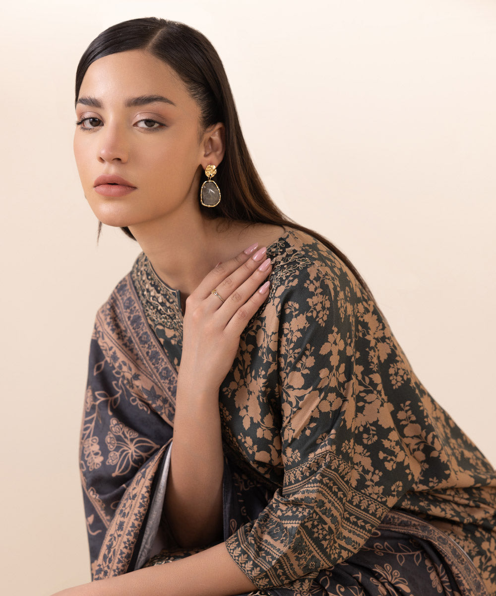 Embrace winter chic in our dusty pink and charcoal grey two-piece linen printed suit with solid trousers.