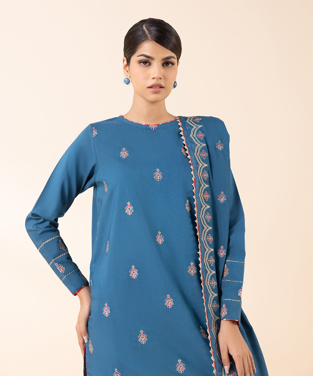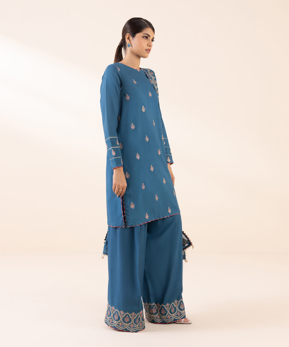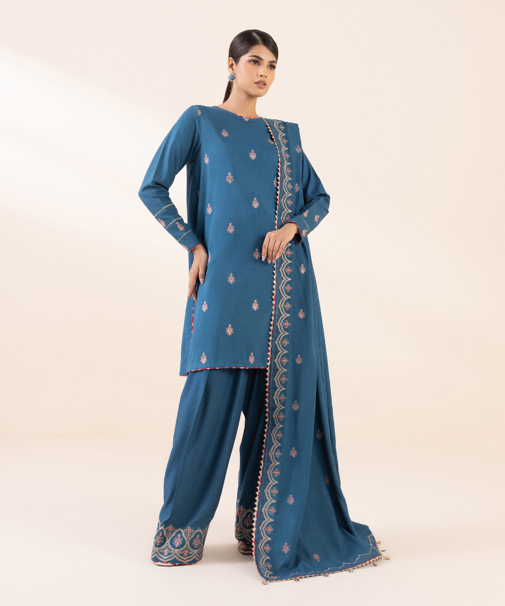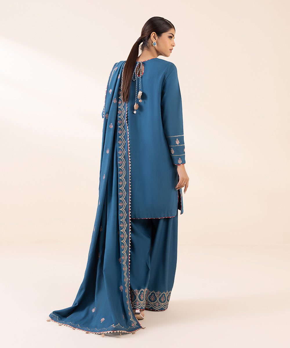 Embrace winter chic in our teal two-piece linen embroidered shirt with trousers.