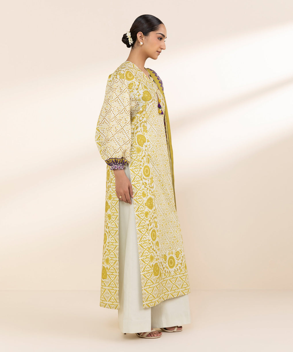 Refresh your wardrobe with our two-piece ensemble in mustard and off-white, featuring a printed lawn shirt paired with a voile dupatta