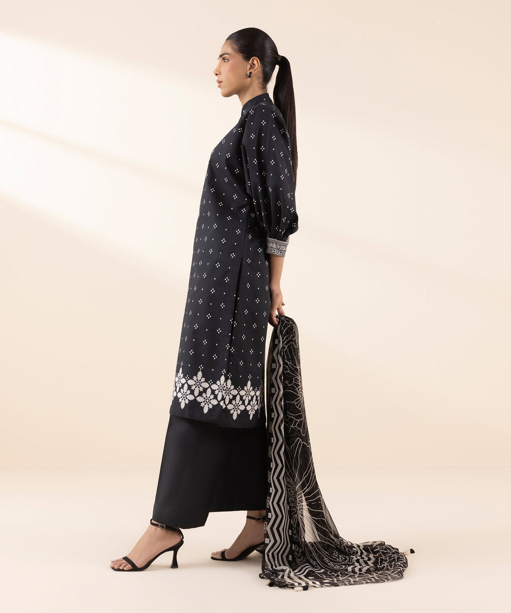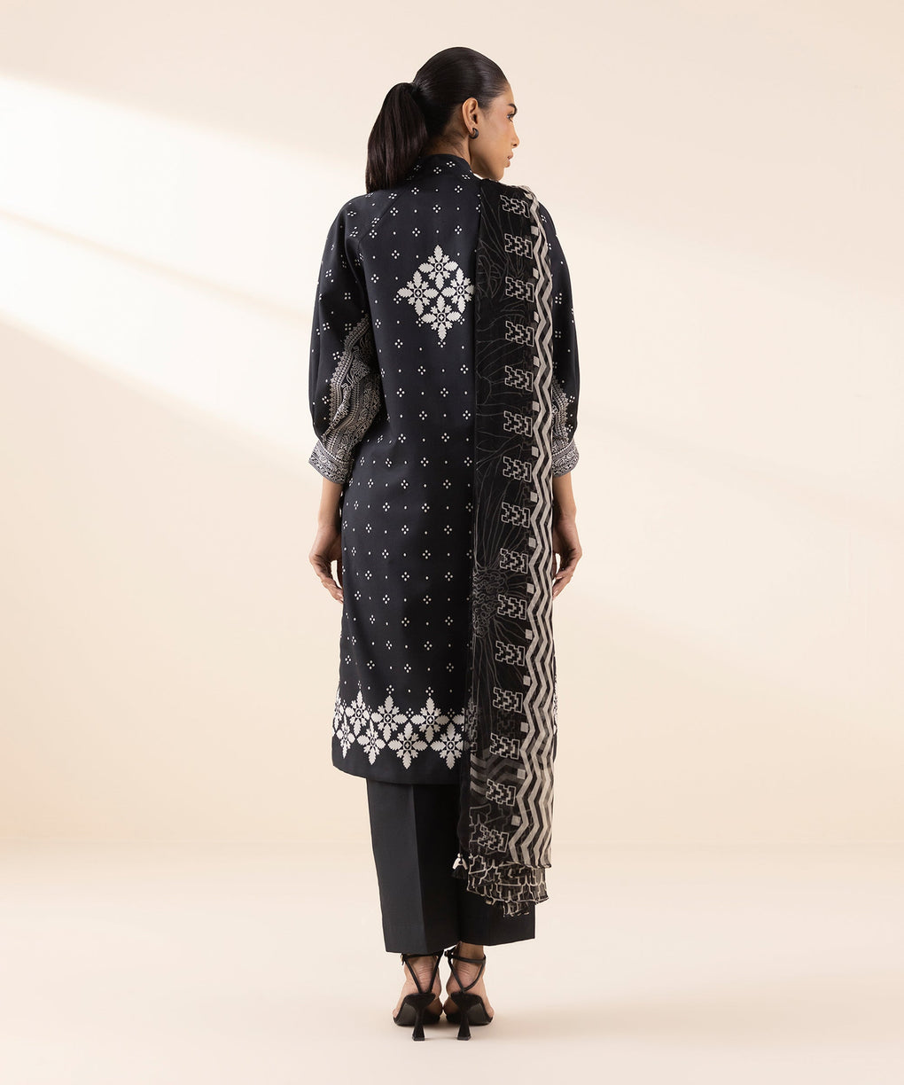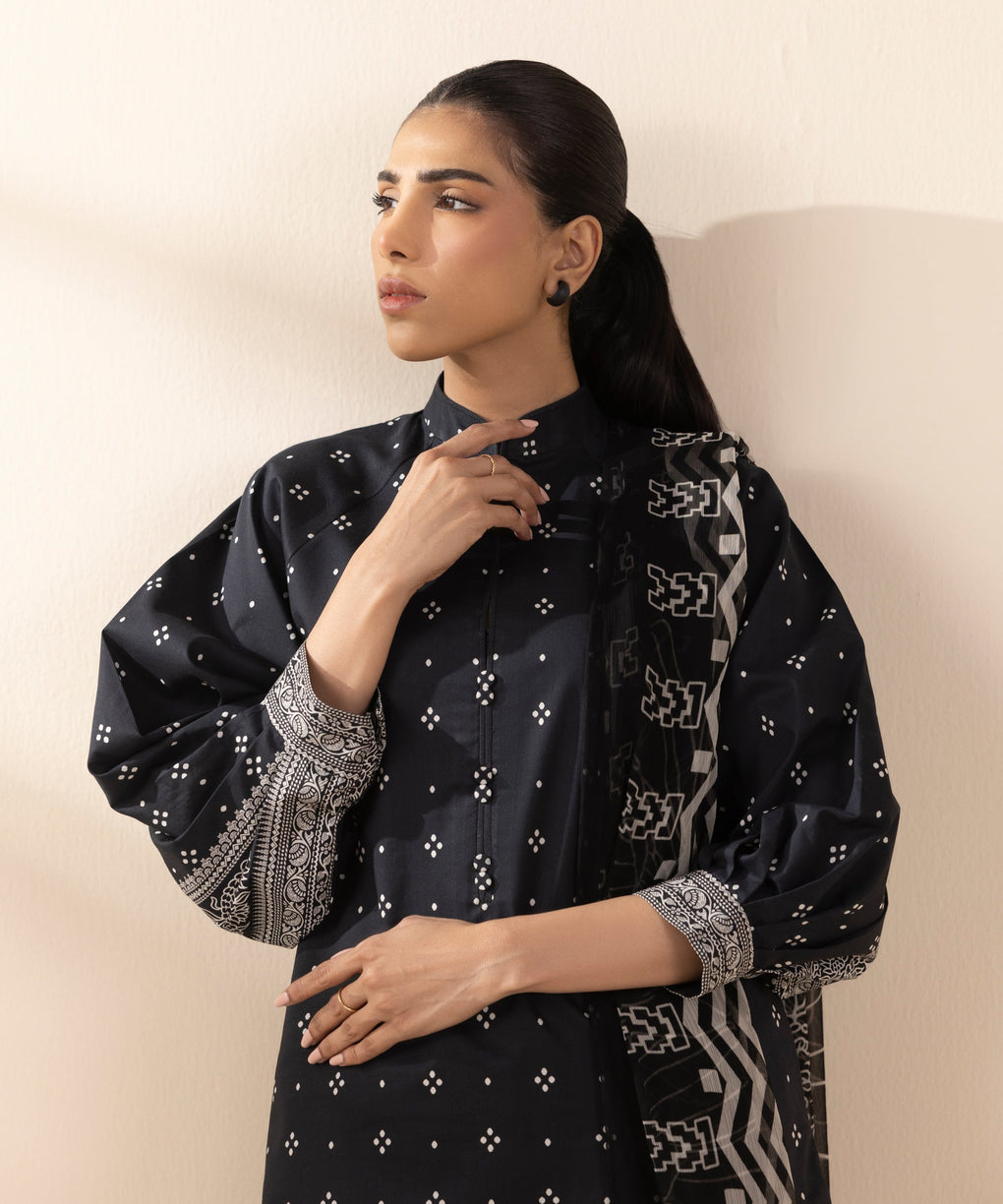 Make a statement with our three-piece printed black and off white ensemble featuring a lawn shirt paired with a blended chiffon dupatta and dyed cotton trousers.