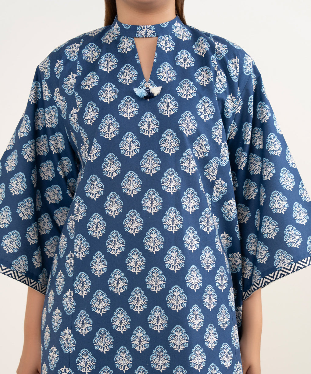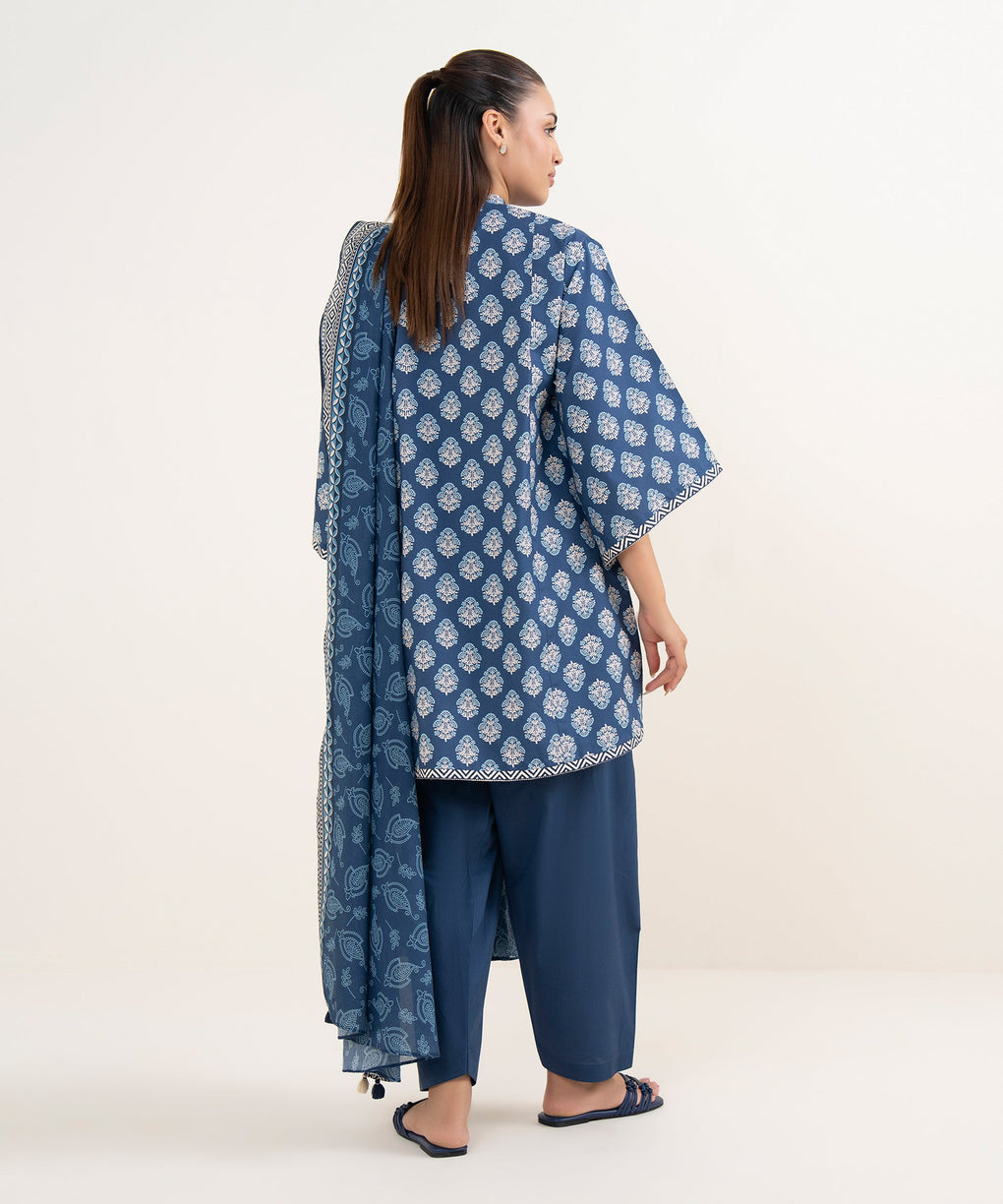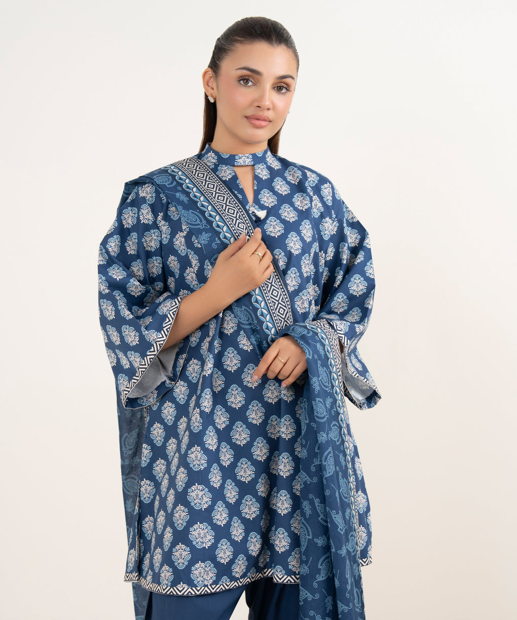 Elevate your style with our two-piece printed blue and off-white ensemble featuring a cotton shirt  paired with a voile dupatta.