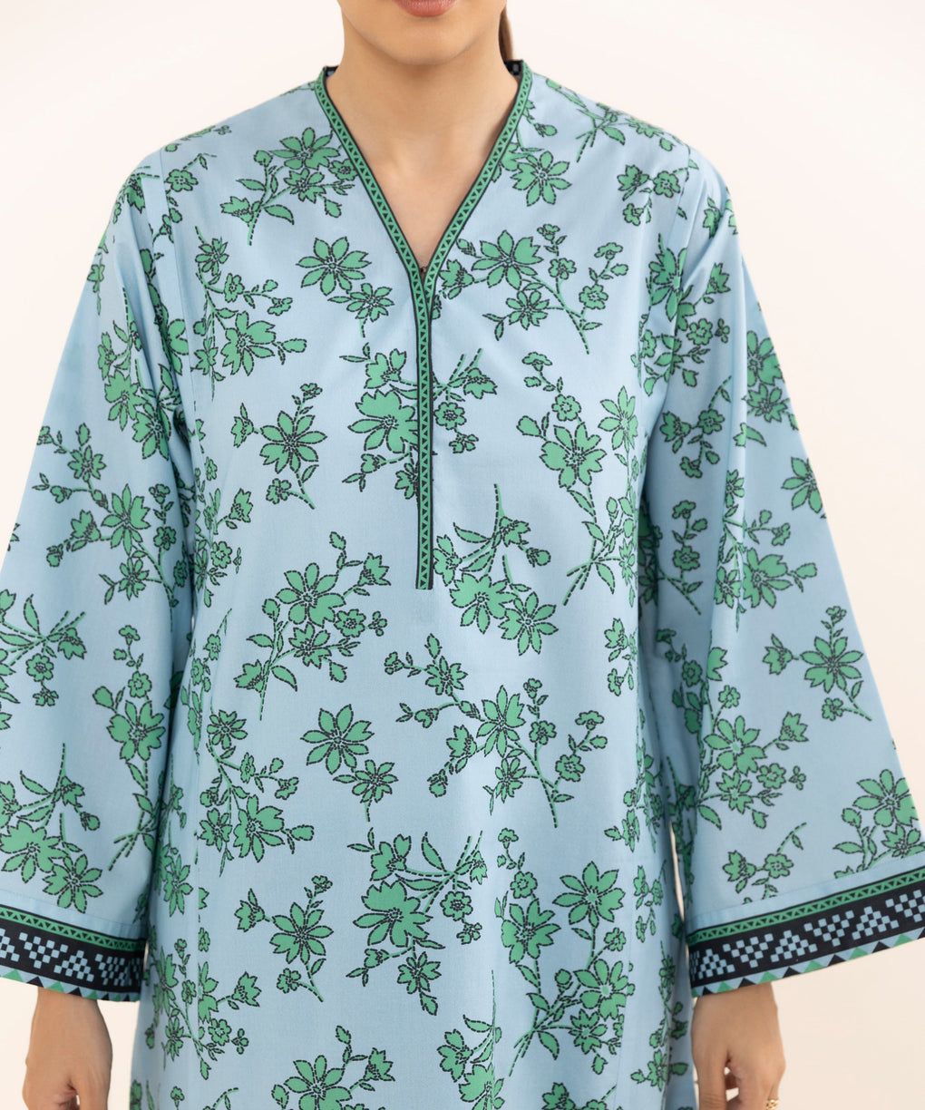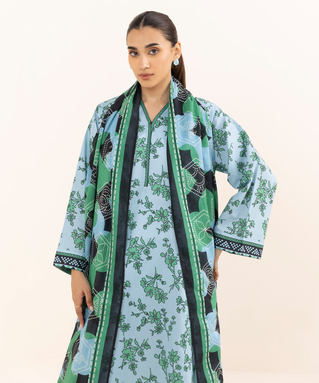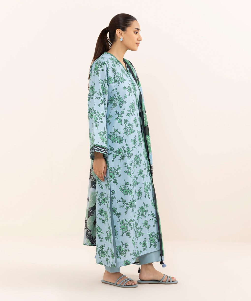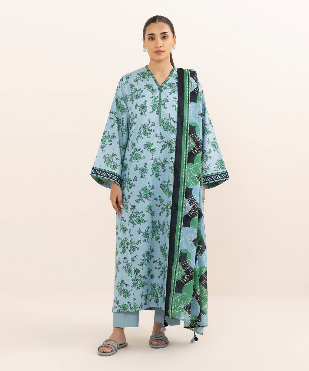 Make a statement with our three-piece printed blue ensemble featuring a lawn shirt paired with a multicoloured voile dupatta and dyed cotton trousers.