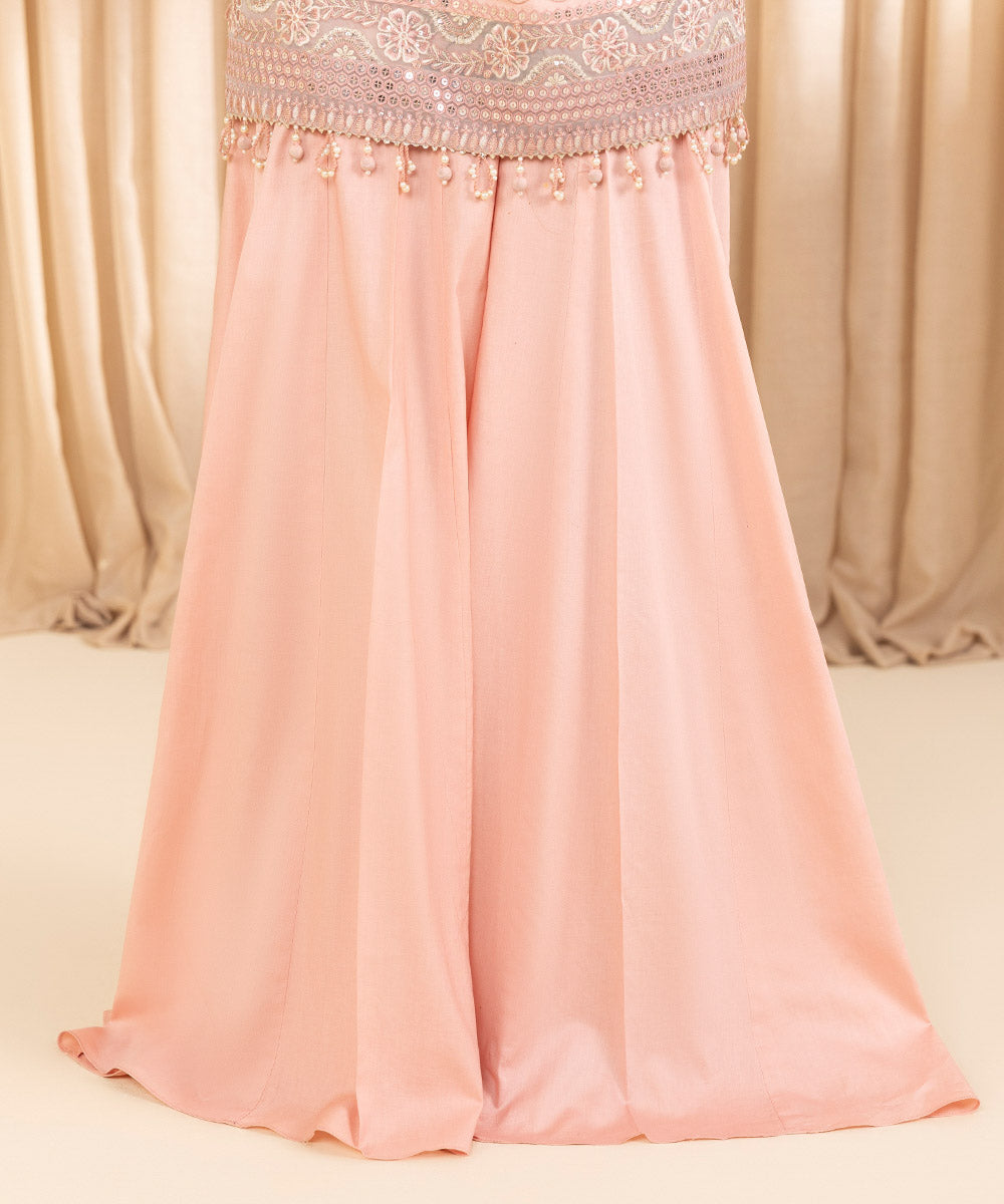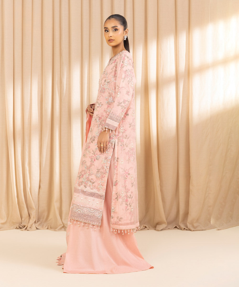 Make a festive statement in our embroidered tea pink crinkle chiffon shirt and viscose raw silk trousers paired with a fancy jacquard dupatta.