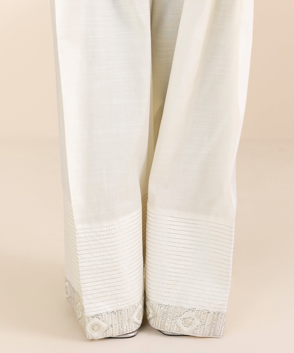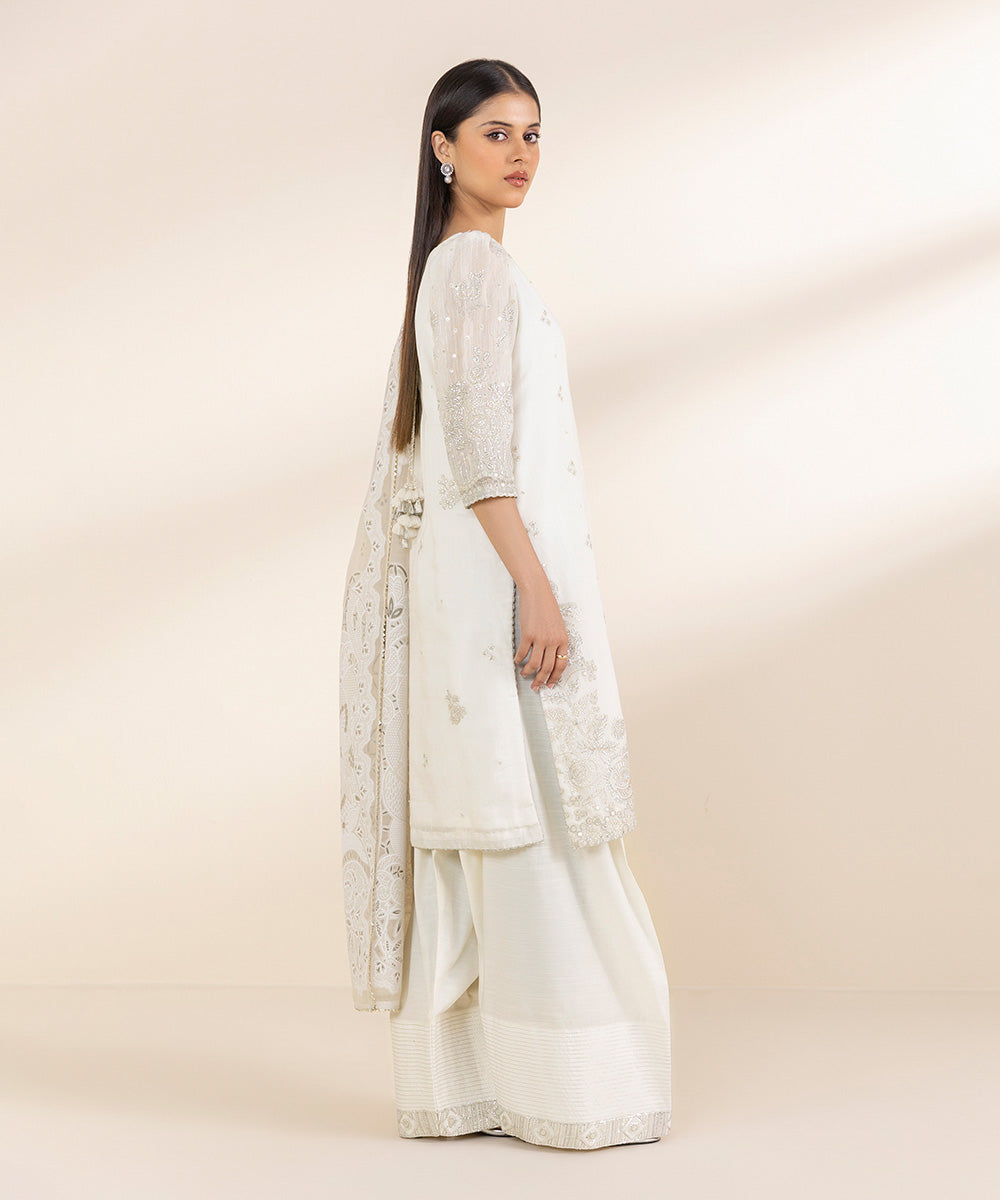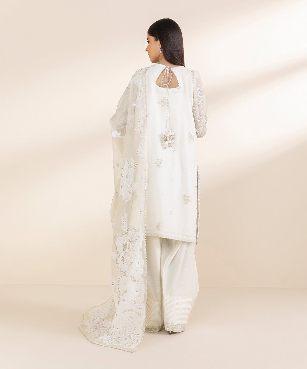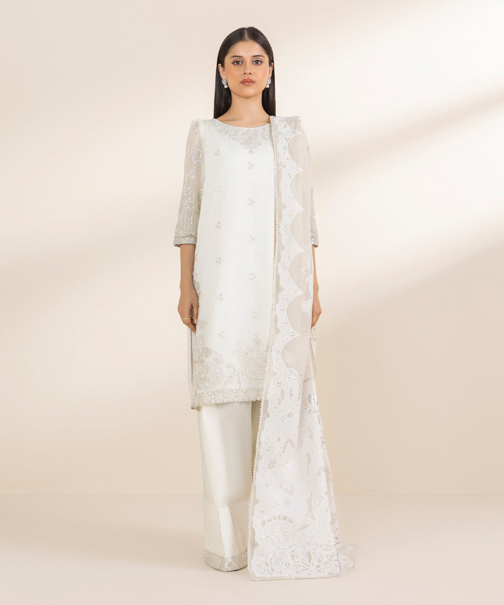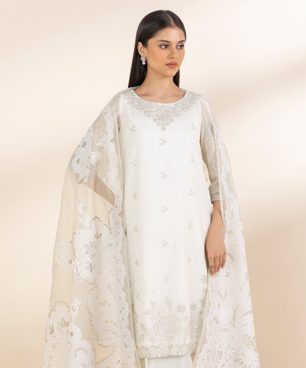Make a statement with our three-piece embroidered ensemble in off-white featuring a fine cotton satin shirt paired with a net burnout dupatta and cotton trousers.