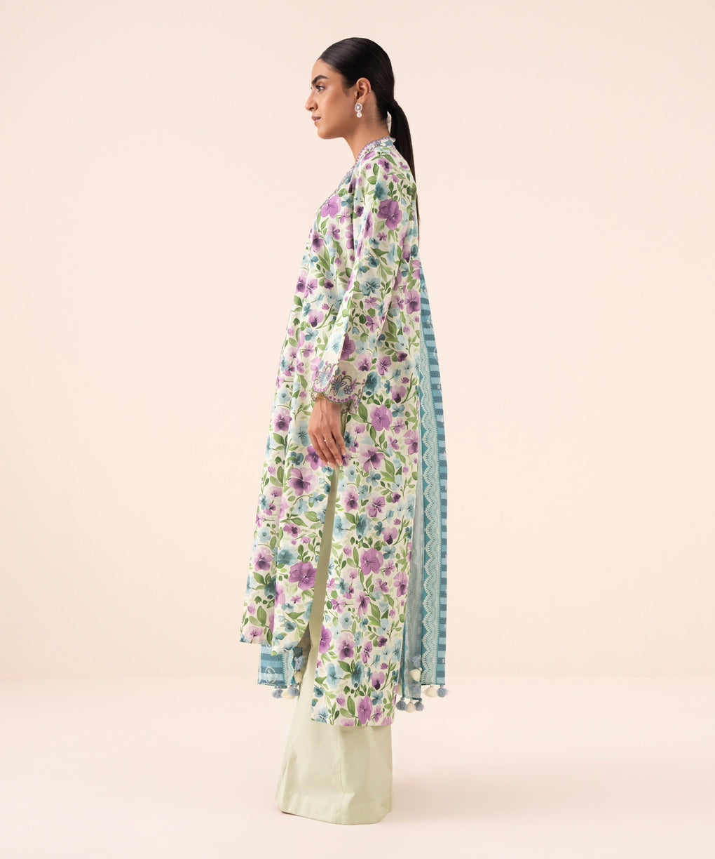 Make a statement with our multicoloured three-piece embroidered ensemble, featuring a cotton shirt and trousers paired with a light blue and ivory zari voile dupatta.