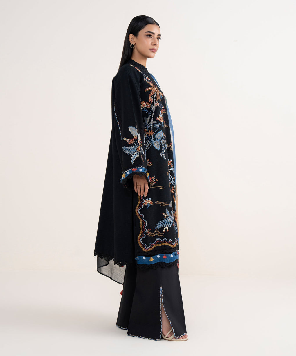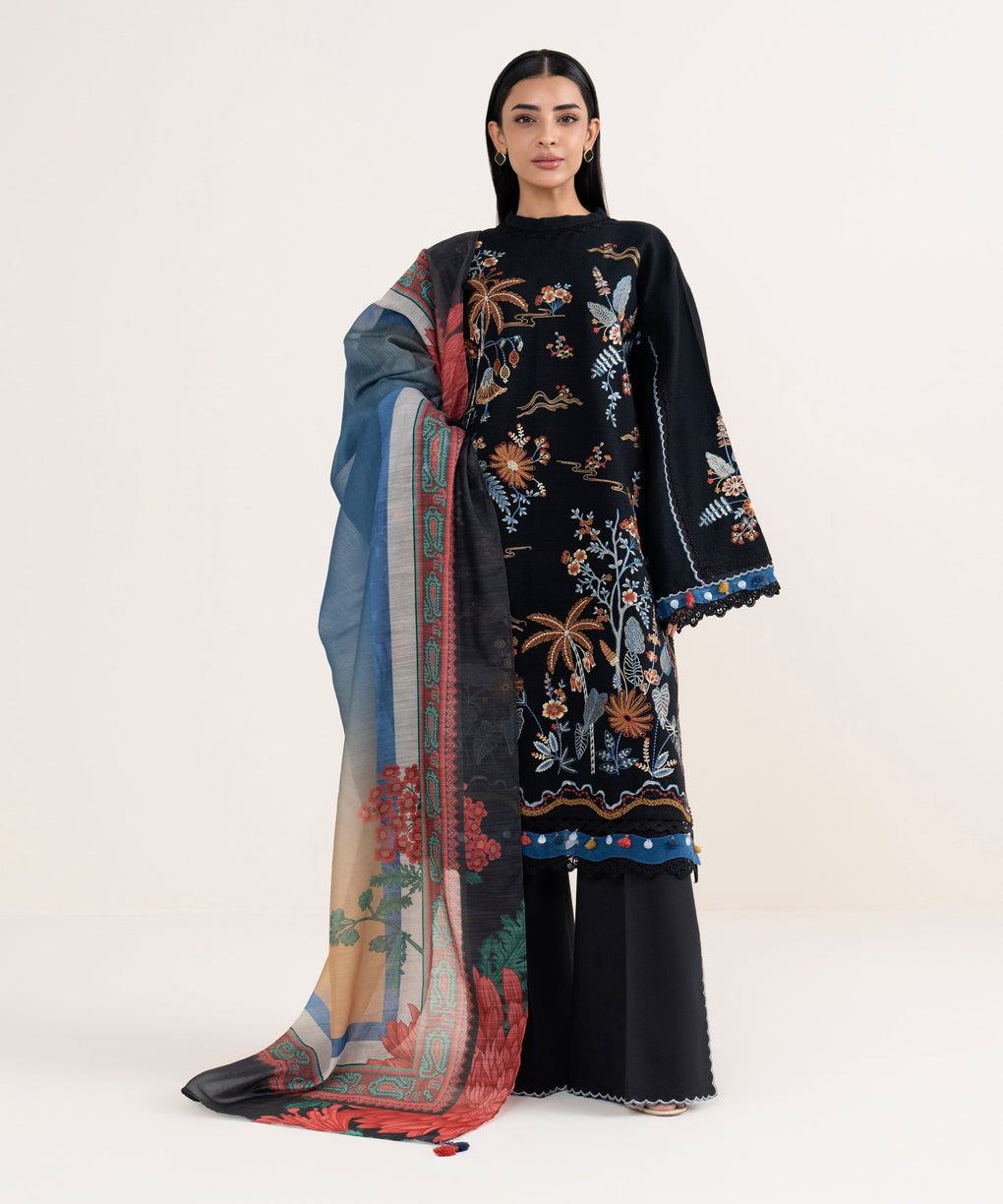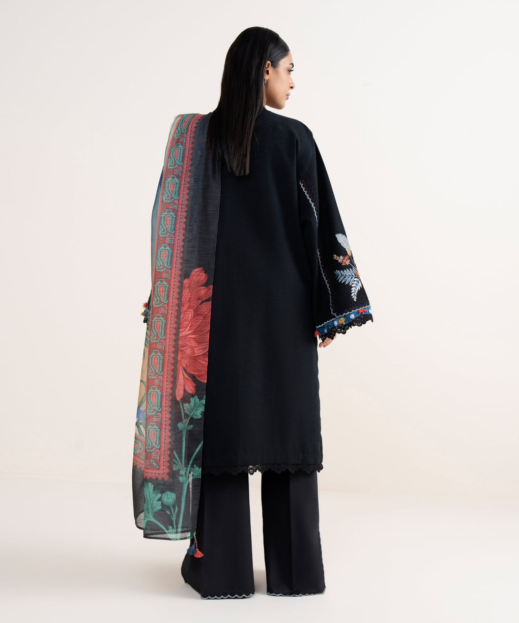 Elevate your style with our three-piece embroidered black ensemble featuring a dobby shirt paired with a manaar dupatta and cotton trousers.