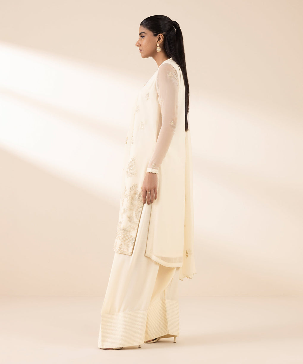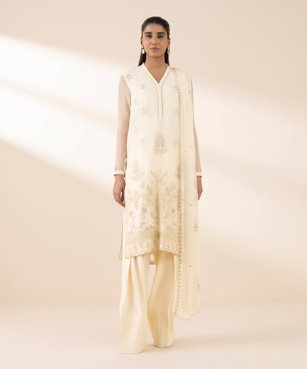 Make a standout statement with our three-piece off white ensemble featuring a blended chiffon shirt and dupatta paired with viscose raw silk trousers.