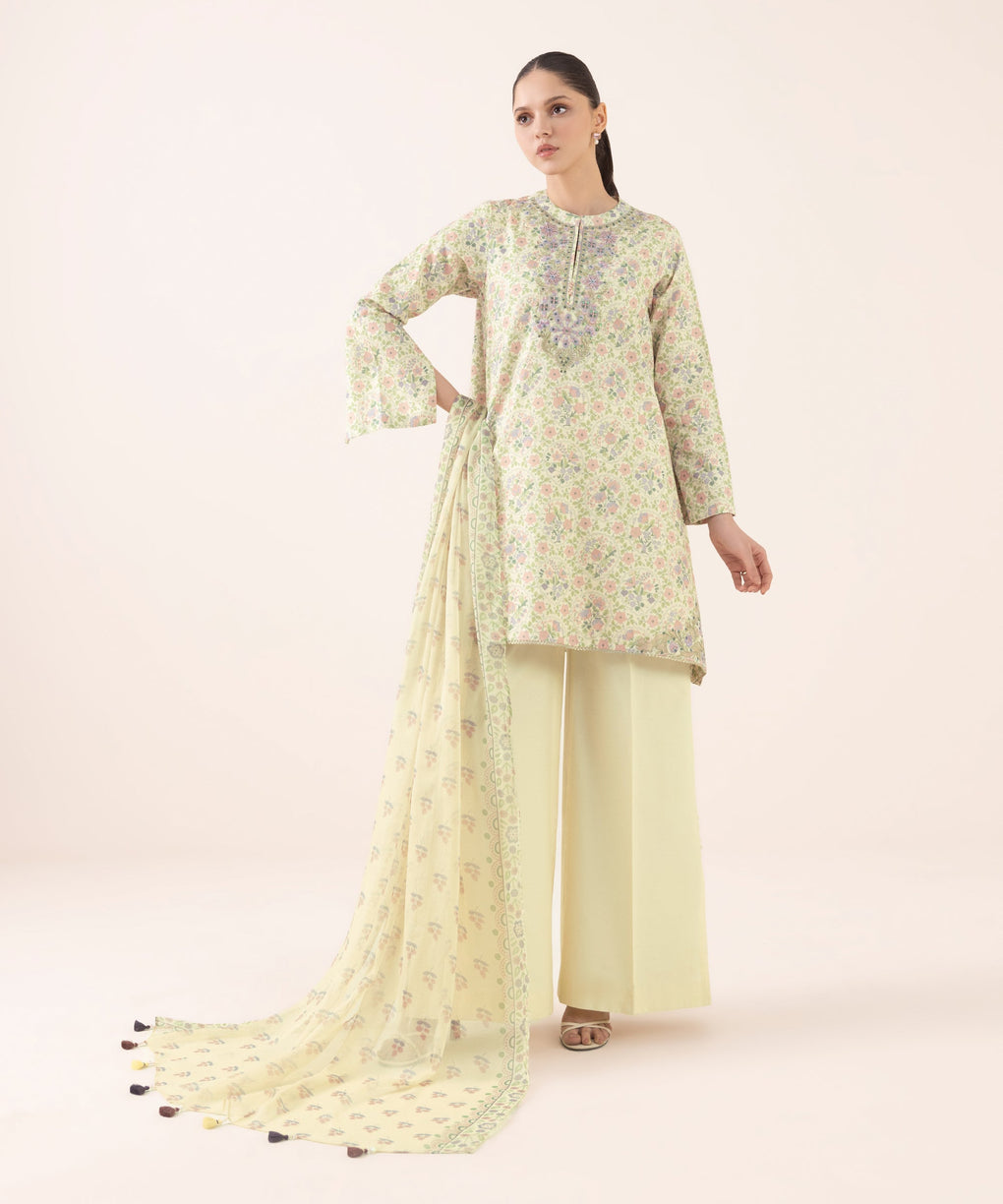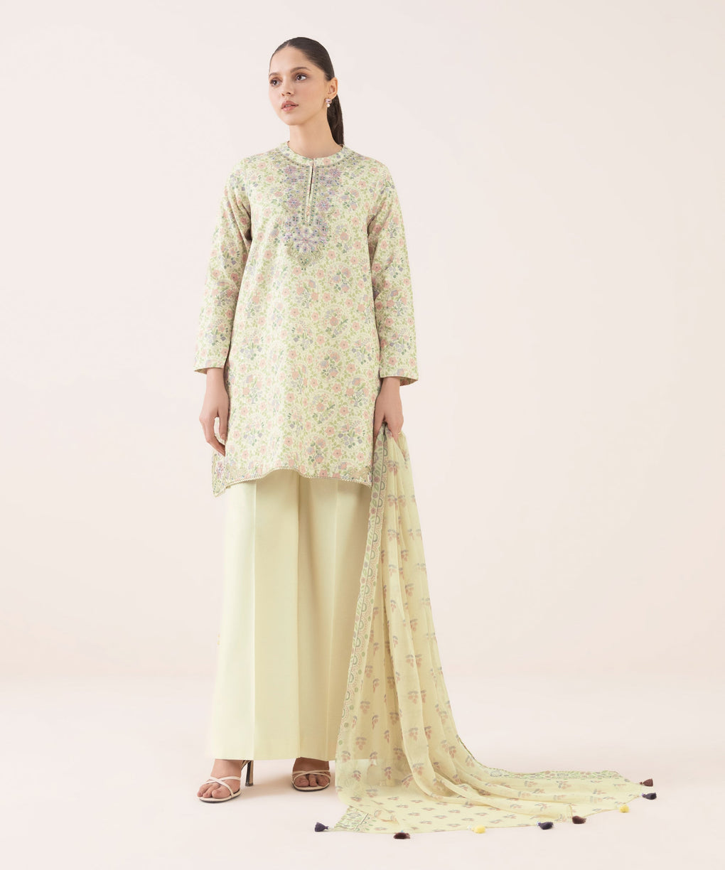 Make a statement with our three-piece embroidered light pink and off-white ensemble featuring a textured cotton shirt paired with a blended chiffon dupatta and cotton trousers.