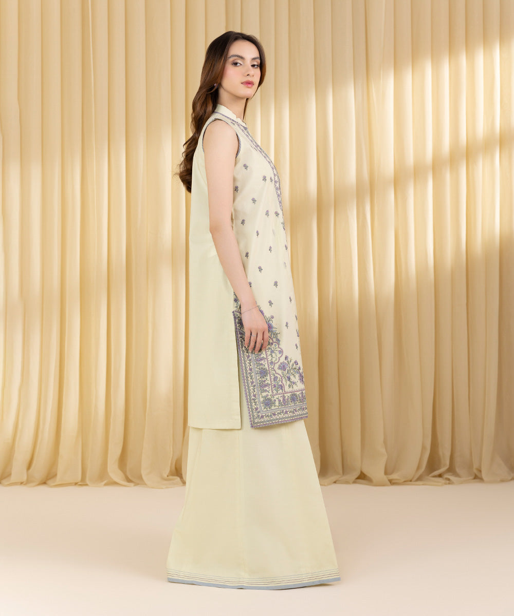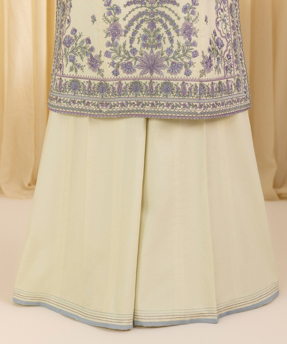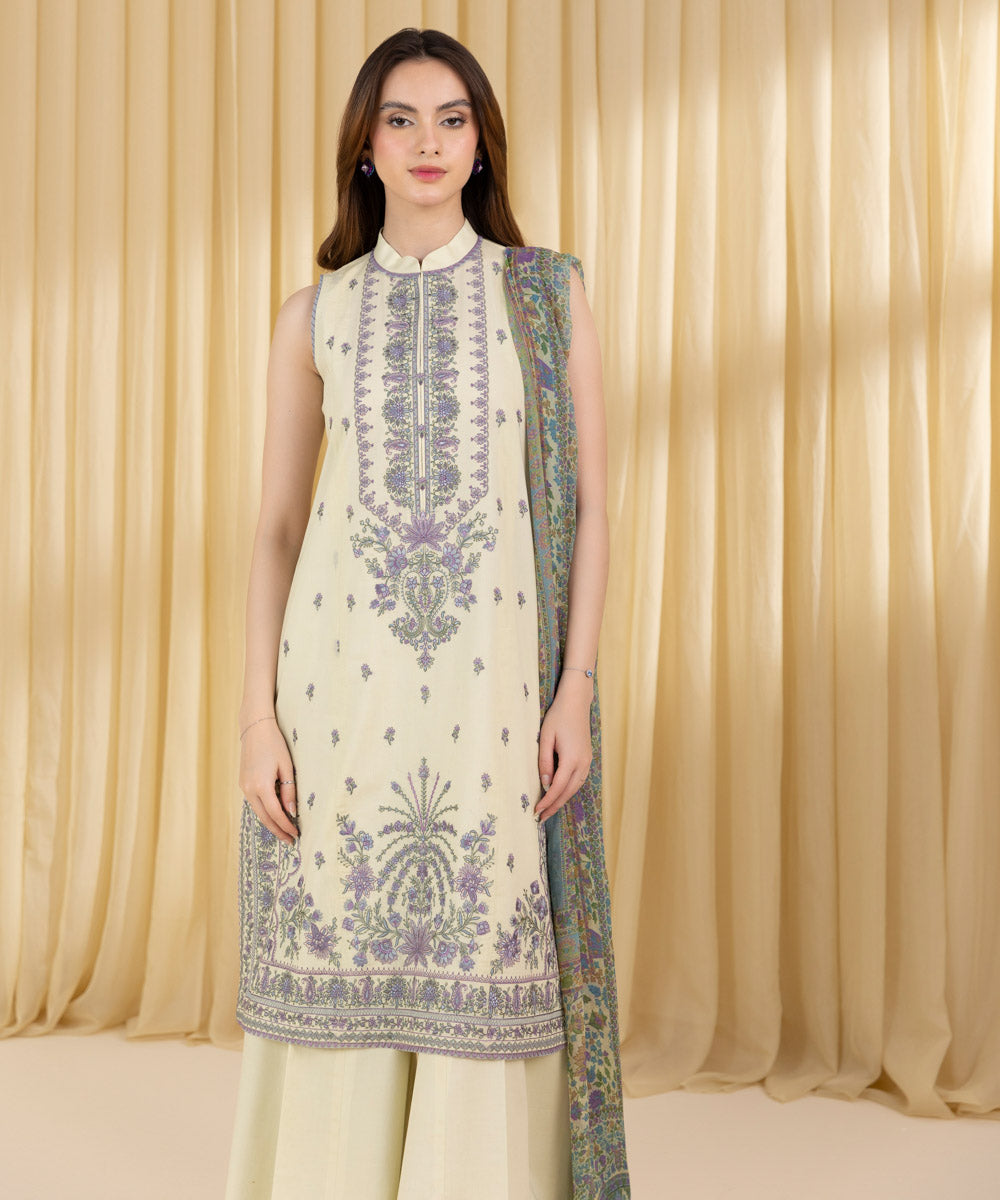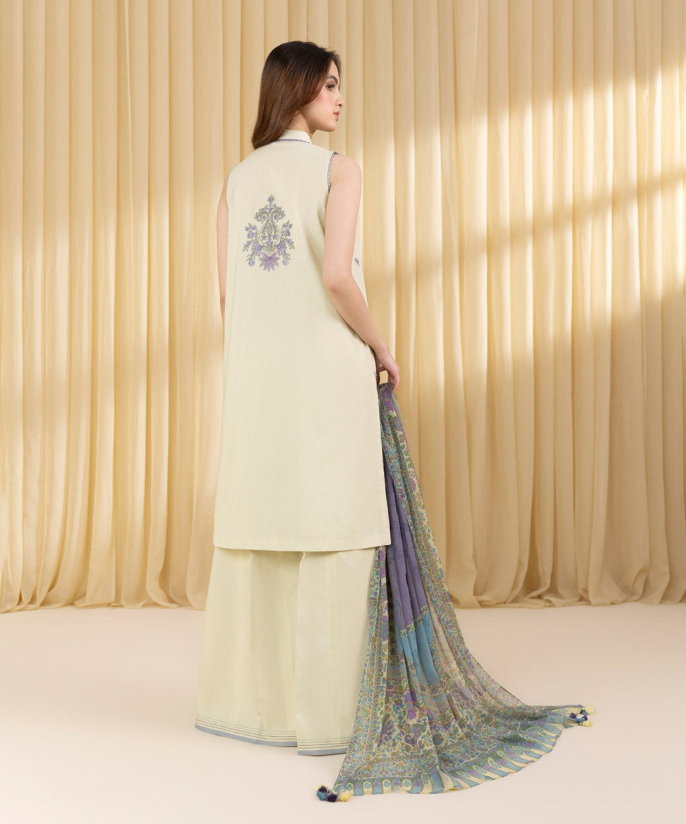 Make a statement in our embroidered off white textured lawn shirt and cotton trousers ensemble with a crinkle chiffon dupatta.