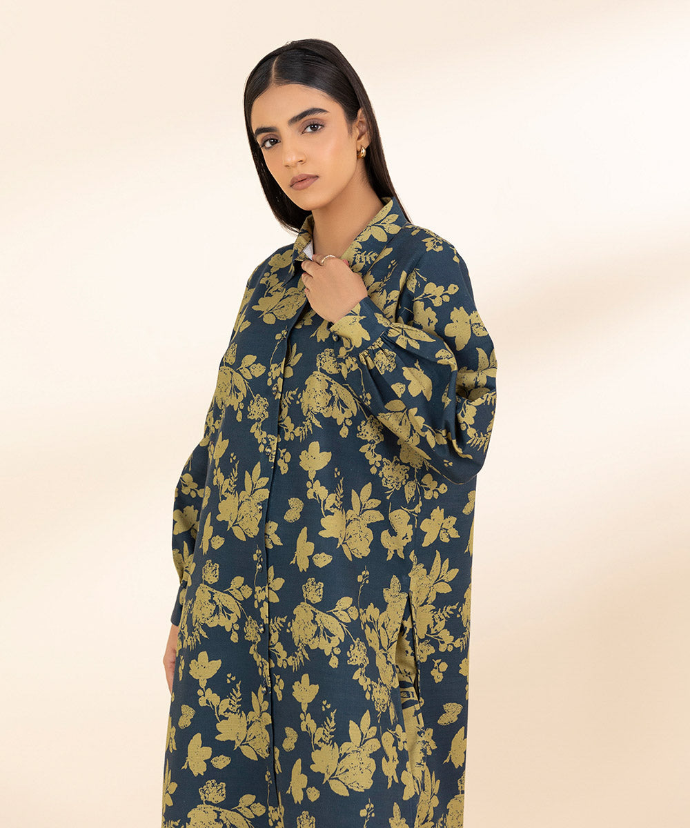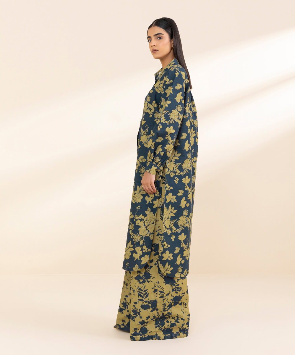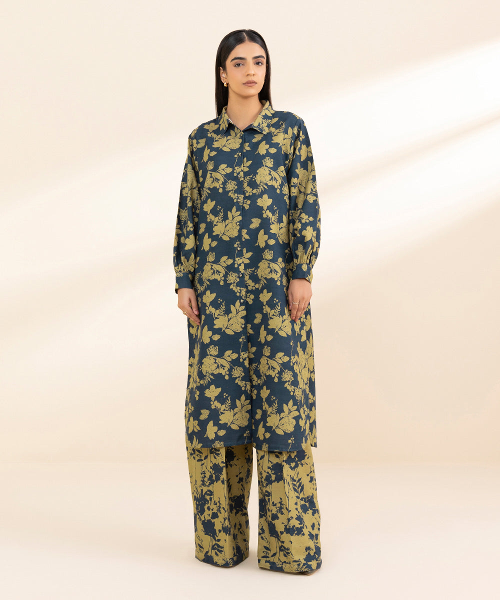 Make a statement with our olive and charcoal black two-piece printed light khaddar ensemble featuring floral prints.