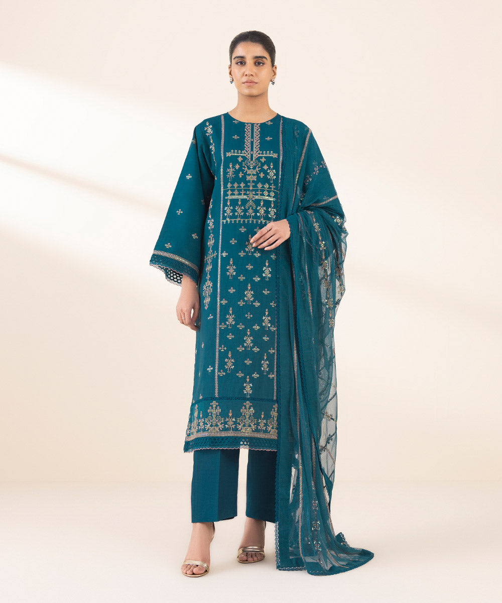 Make a luxurious statement with our three-piece dyed embroidered ensemble in teal blue featuring a viscose raw silk shirt and trousers paired with a blended net dupatta.