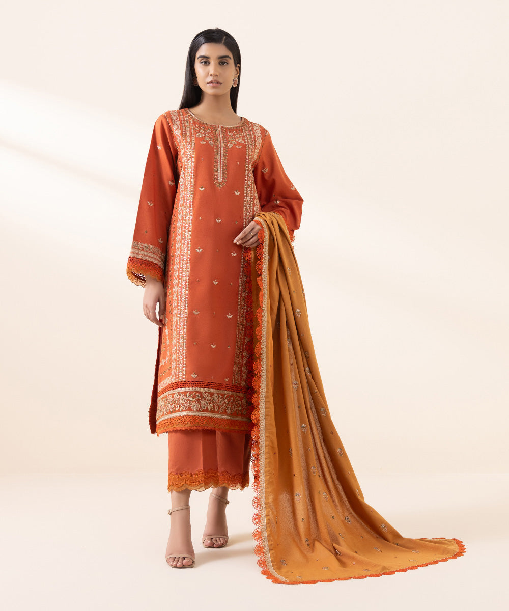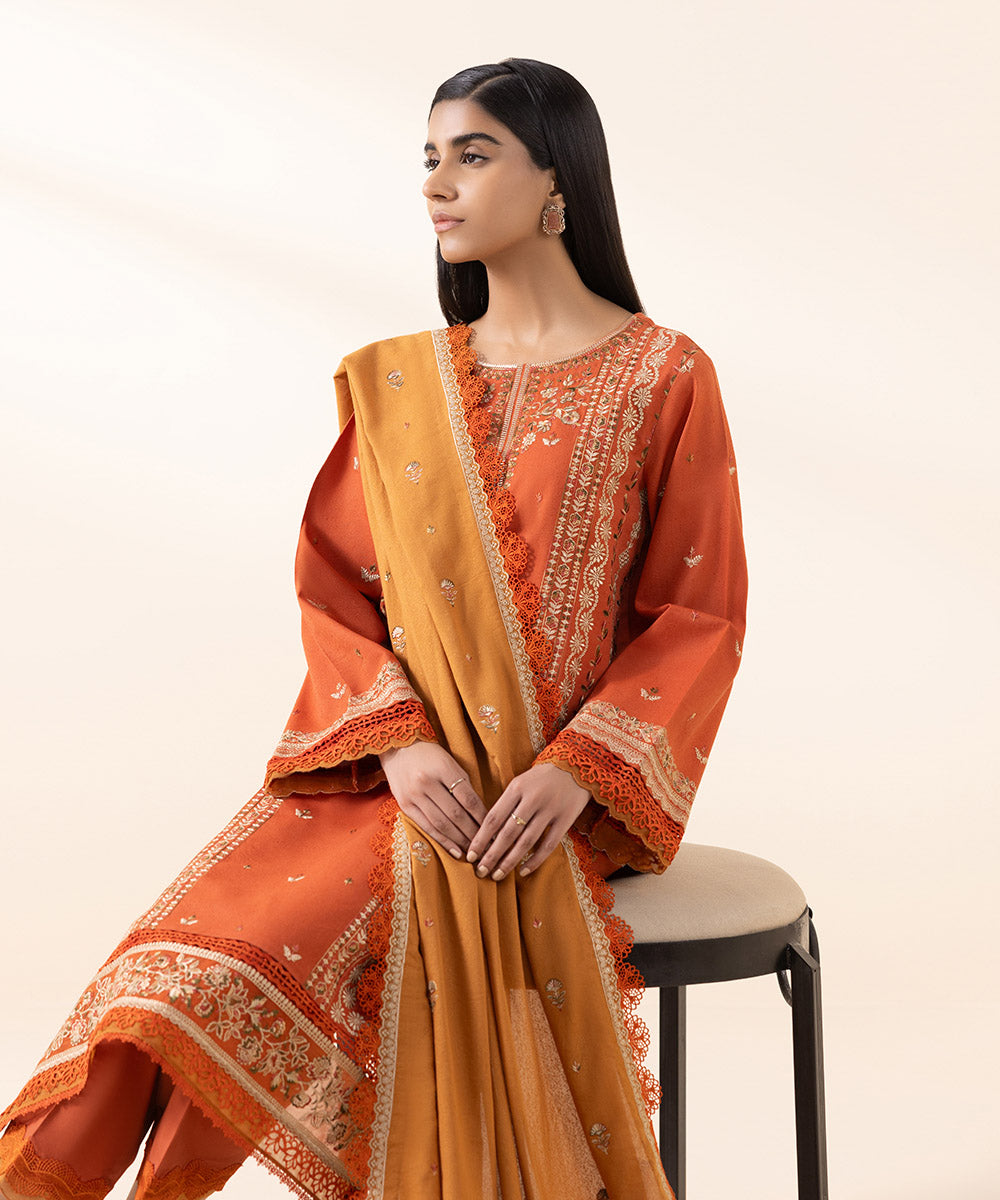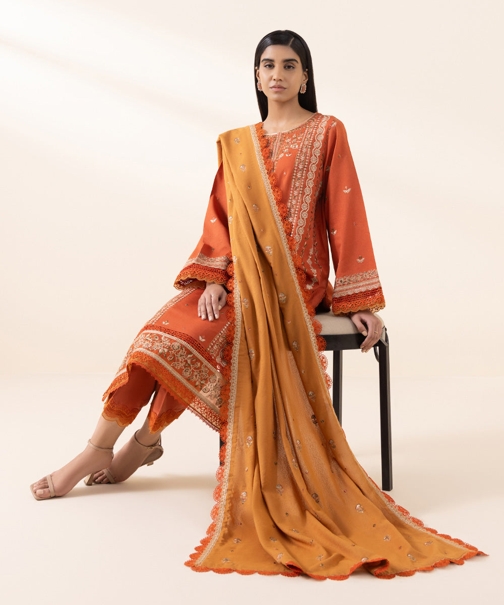 Upgrade your seasonal wardrobe in our apricot orange embroidered three-piece featuring a warm cotton karandi shirt, viscose shawl and cambric trousers.