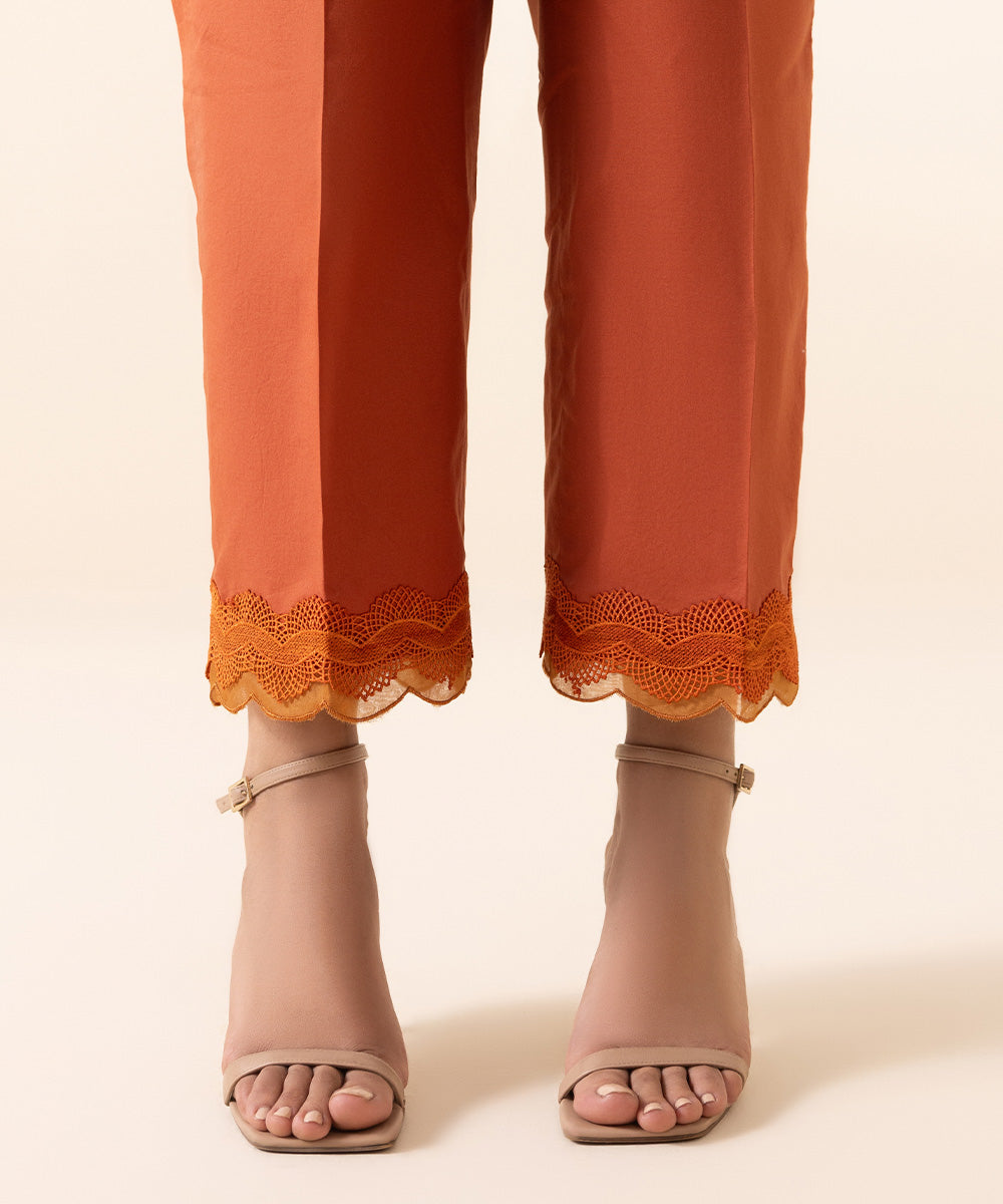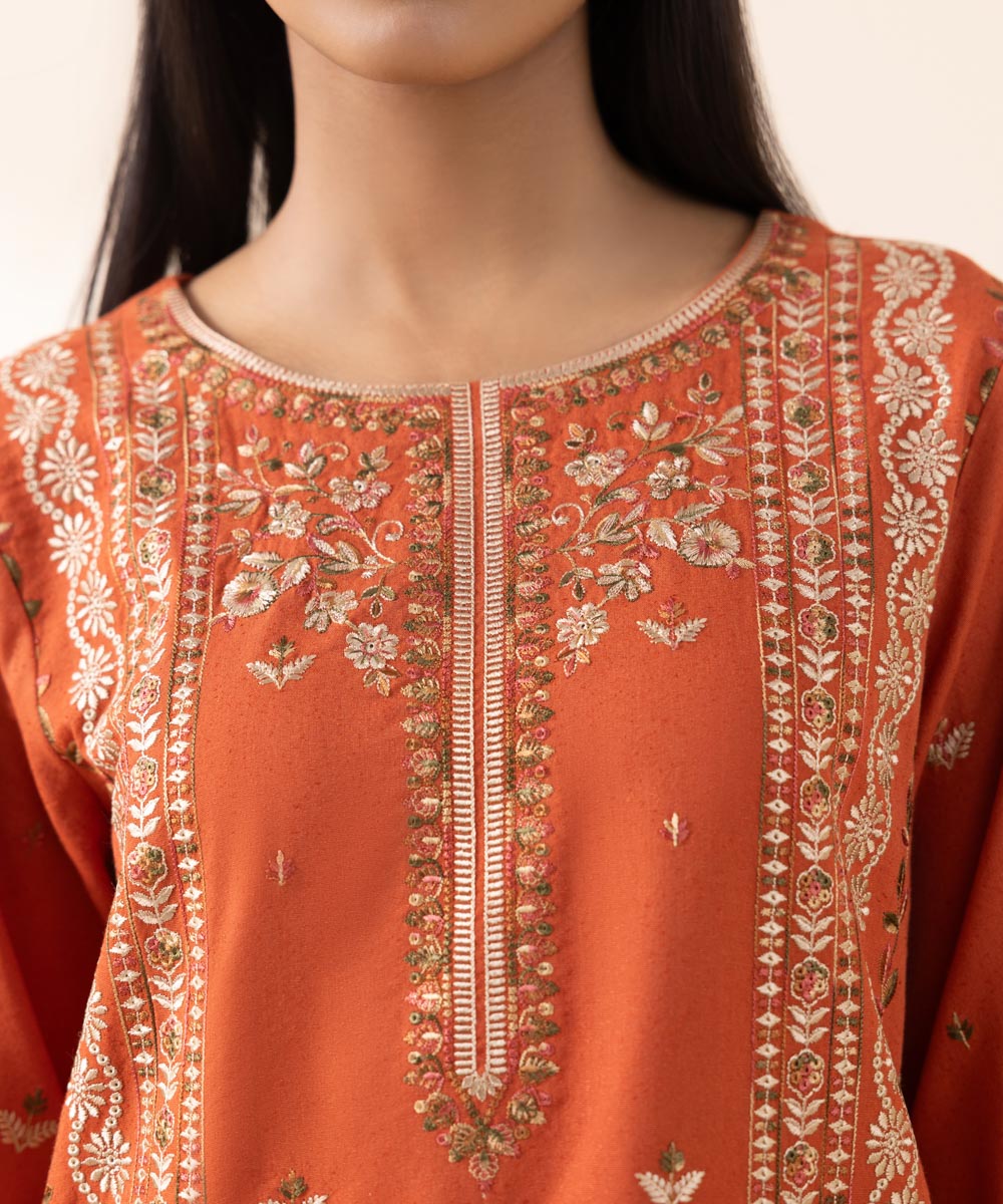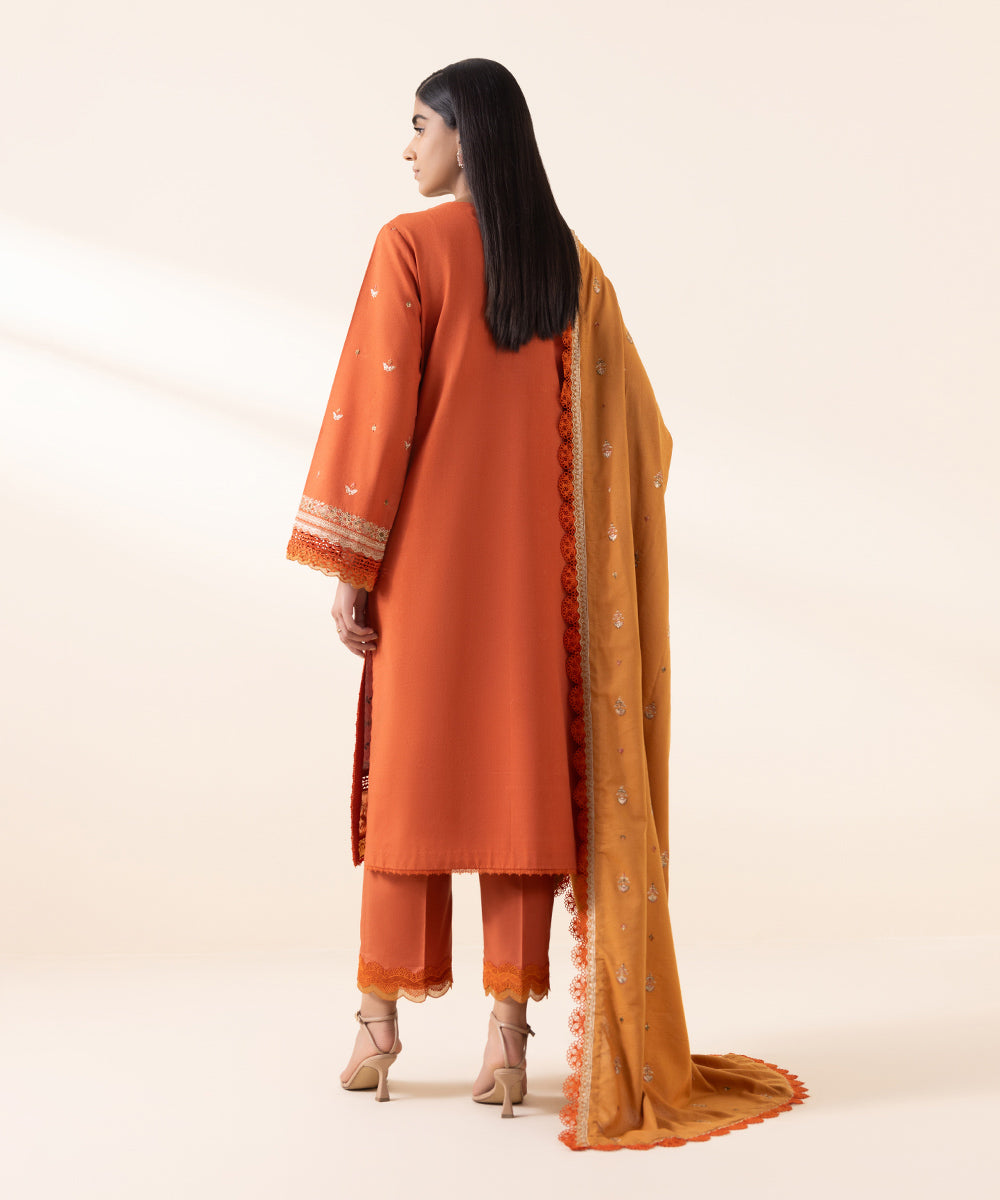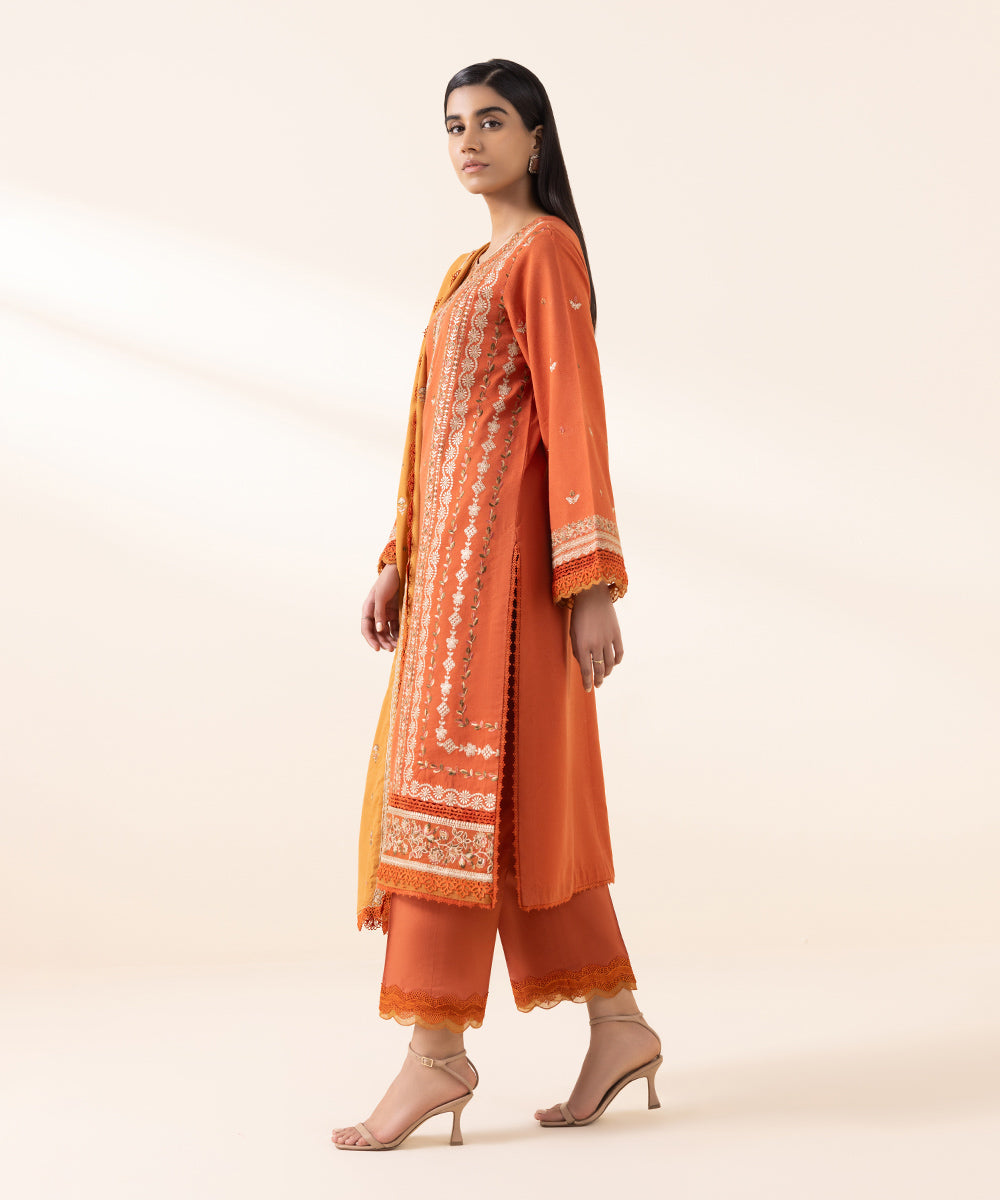 Upgrade your seasonal wardrobe in our apricot orange embroidered three-piece featuring a warm cotton karandi shirt, viscose shawl and cambric trousers.
