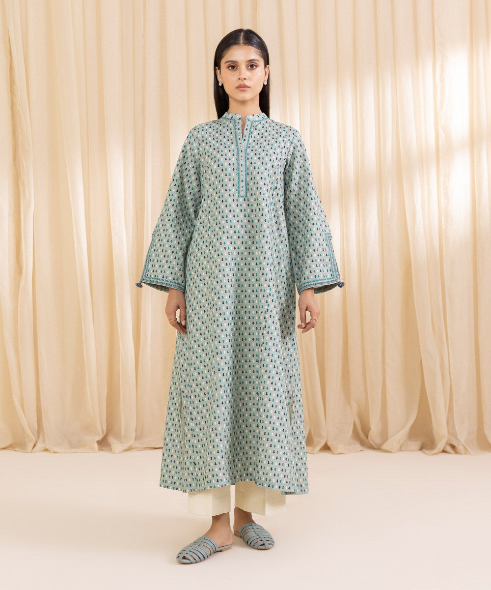 Perfect your winter style with our two-piece ensemble in tidewater blue featuring a printed khaddar shirt paired with matching dyed trousers.