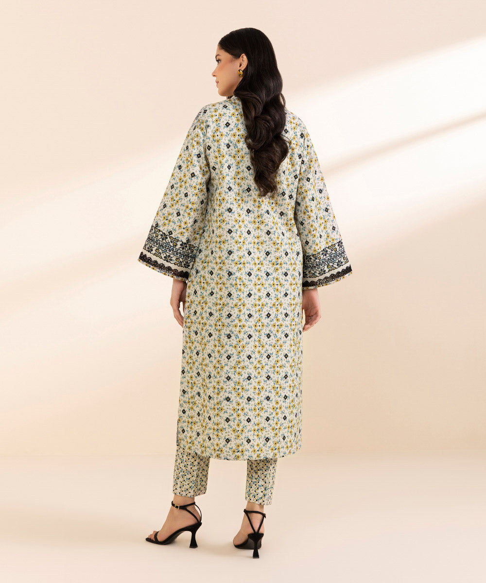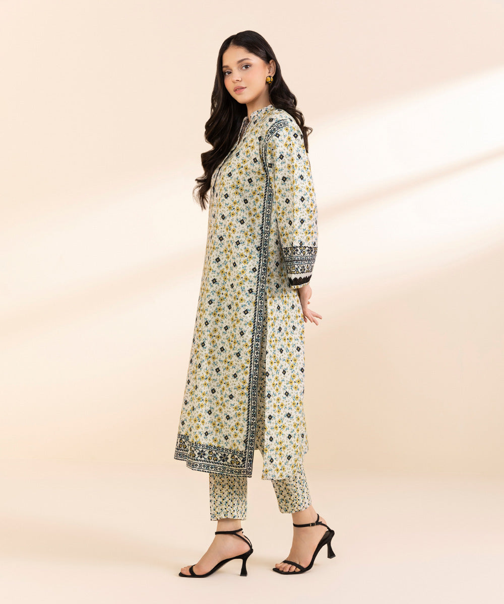 Embrace the subtle elegance of winter in our off-white and multi coloured printed two-piece featuring light khaddar shirt and trousers.