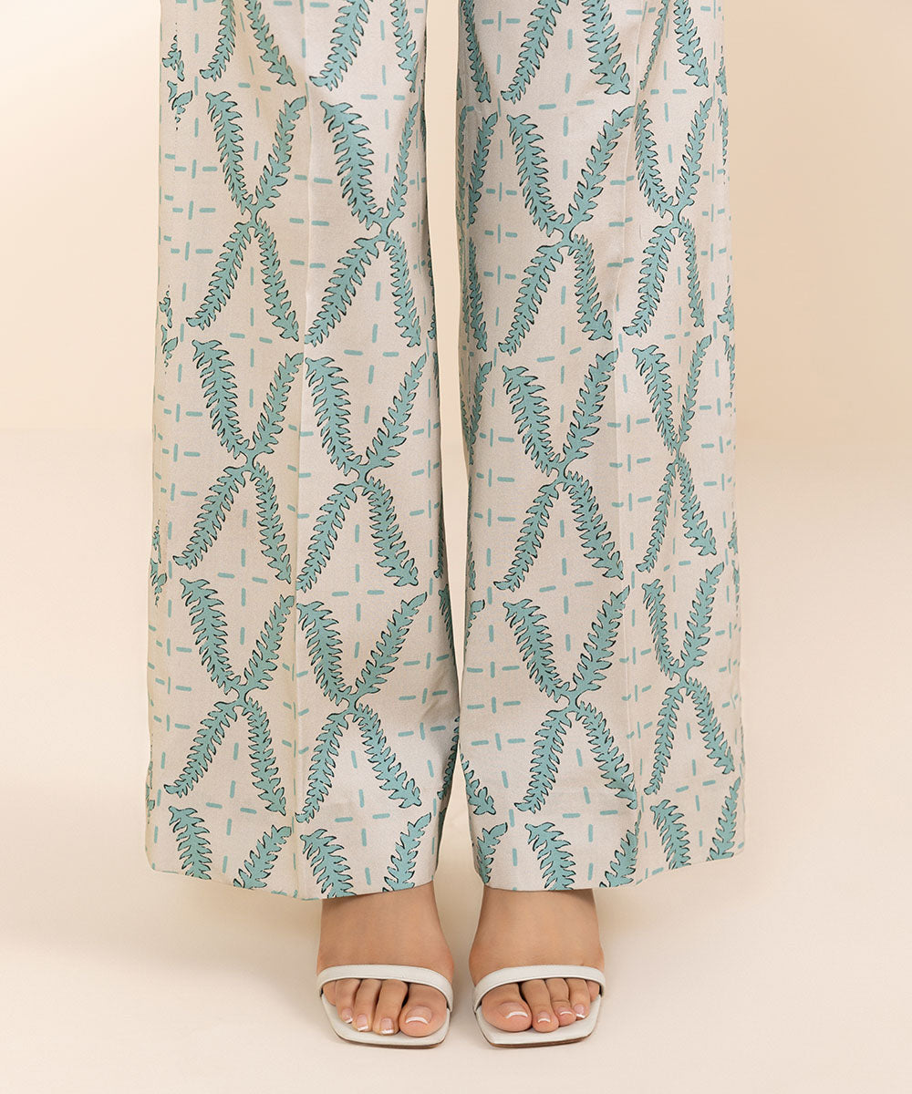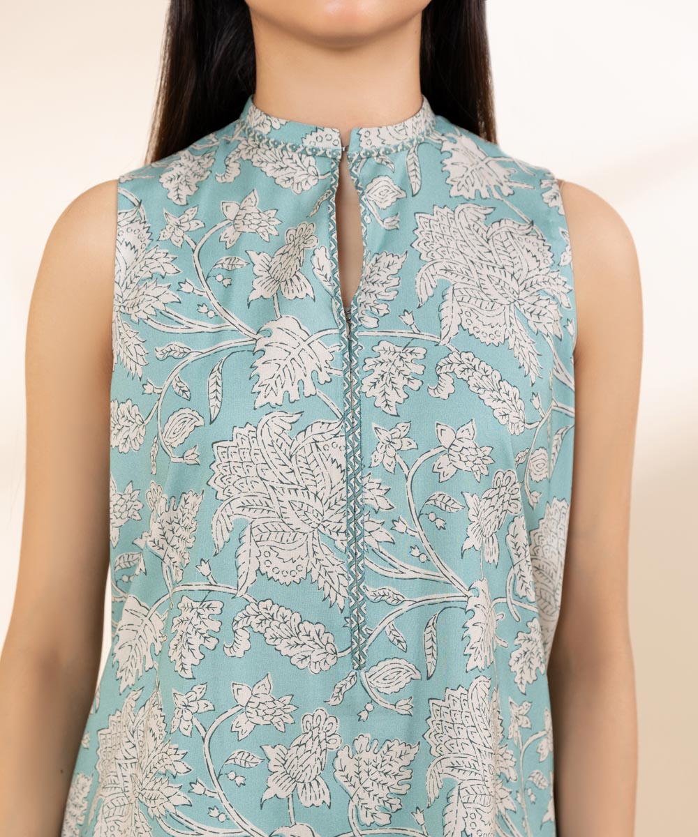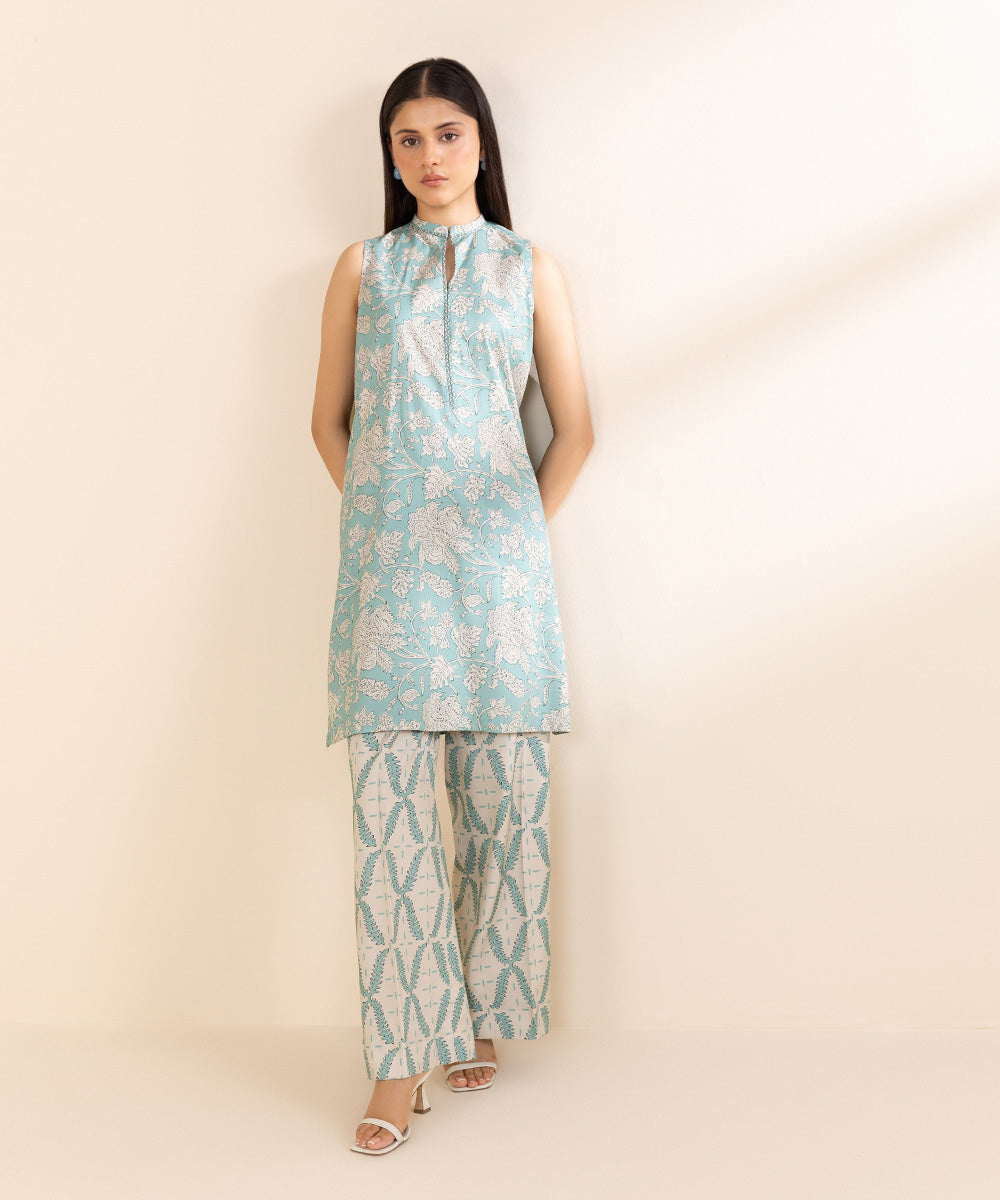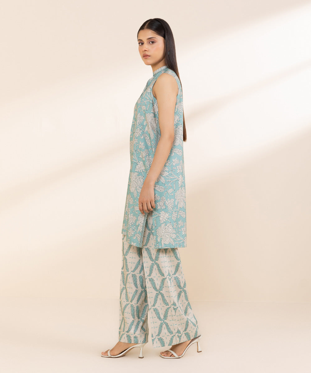 Make a standout statement with our turquoise, two-piece linen shirt and trouser illustrated with florals.