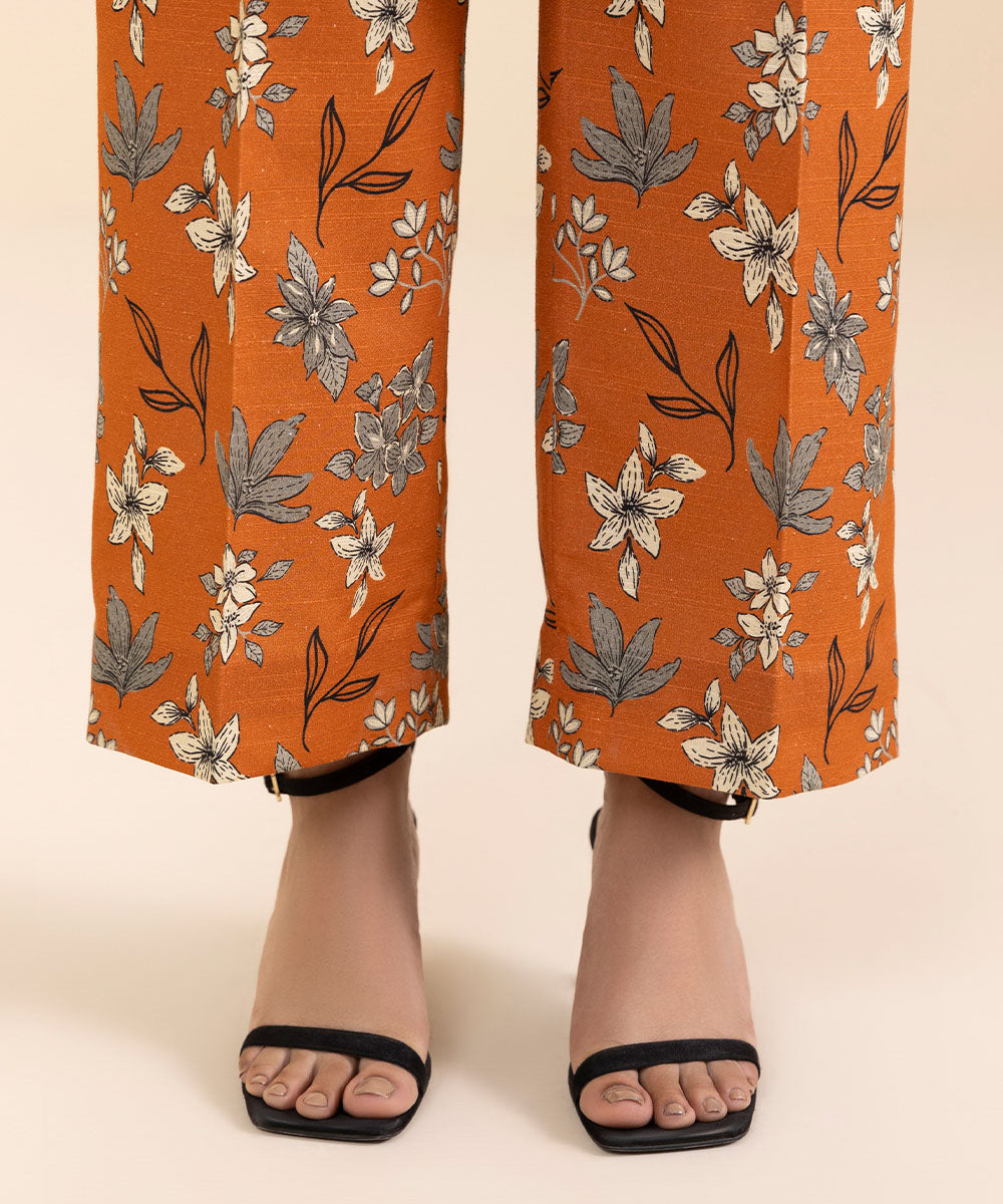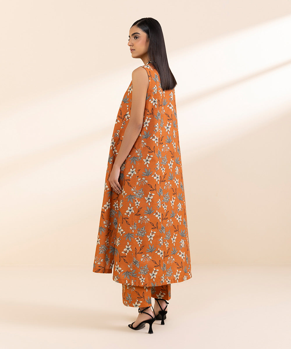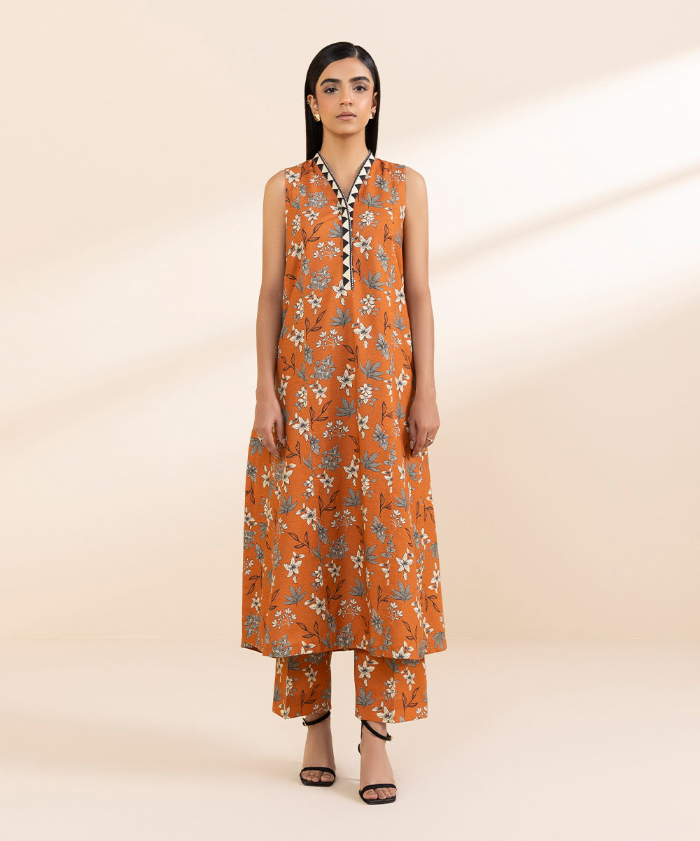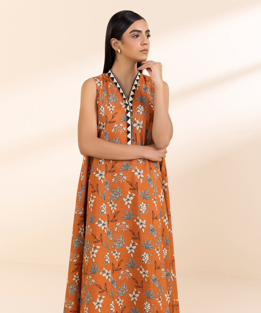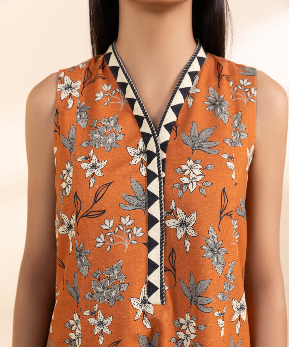Embrace the subtle elegance of winter in our orange floral printed two-piece featuring light khaddar shirt and trousers.