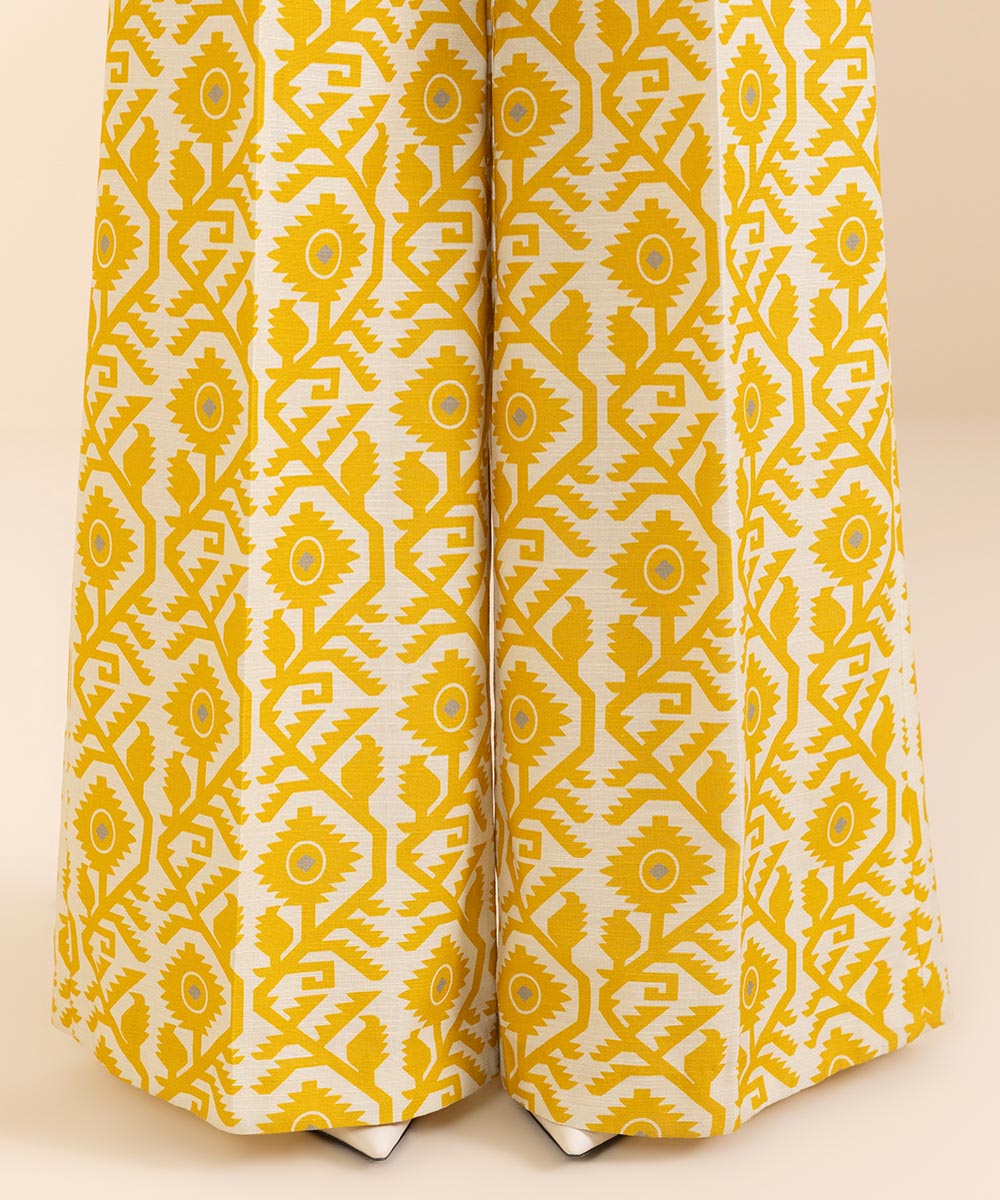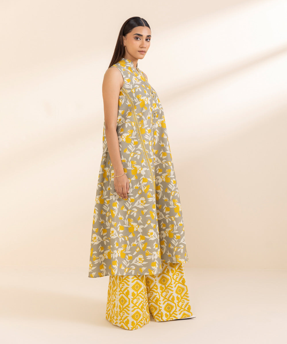 Amp up your winter fashion with our two-piece printed ivory, grey and yellow khaddar shirt and trousers.