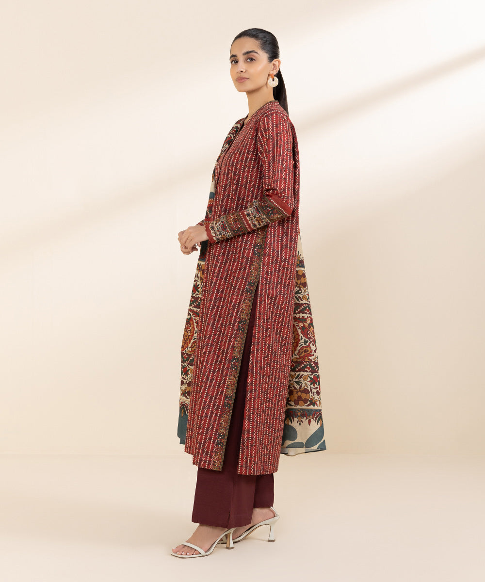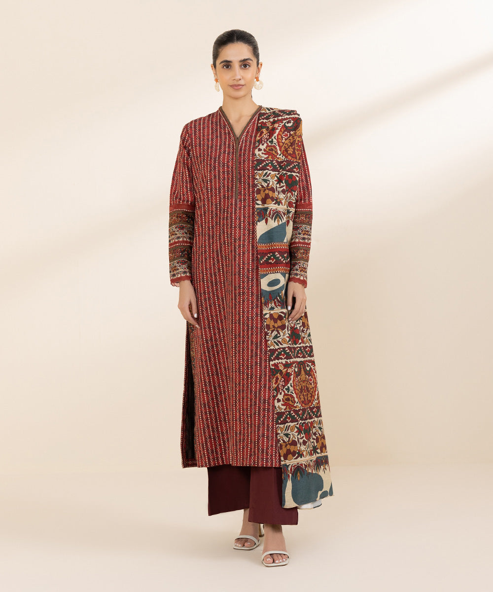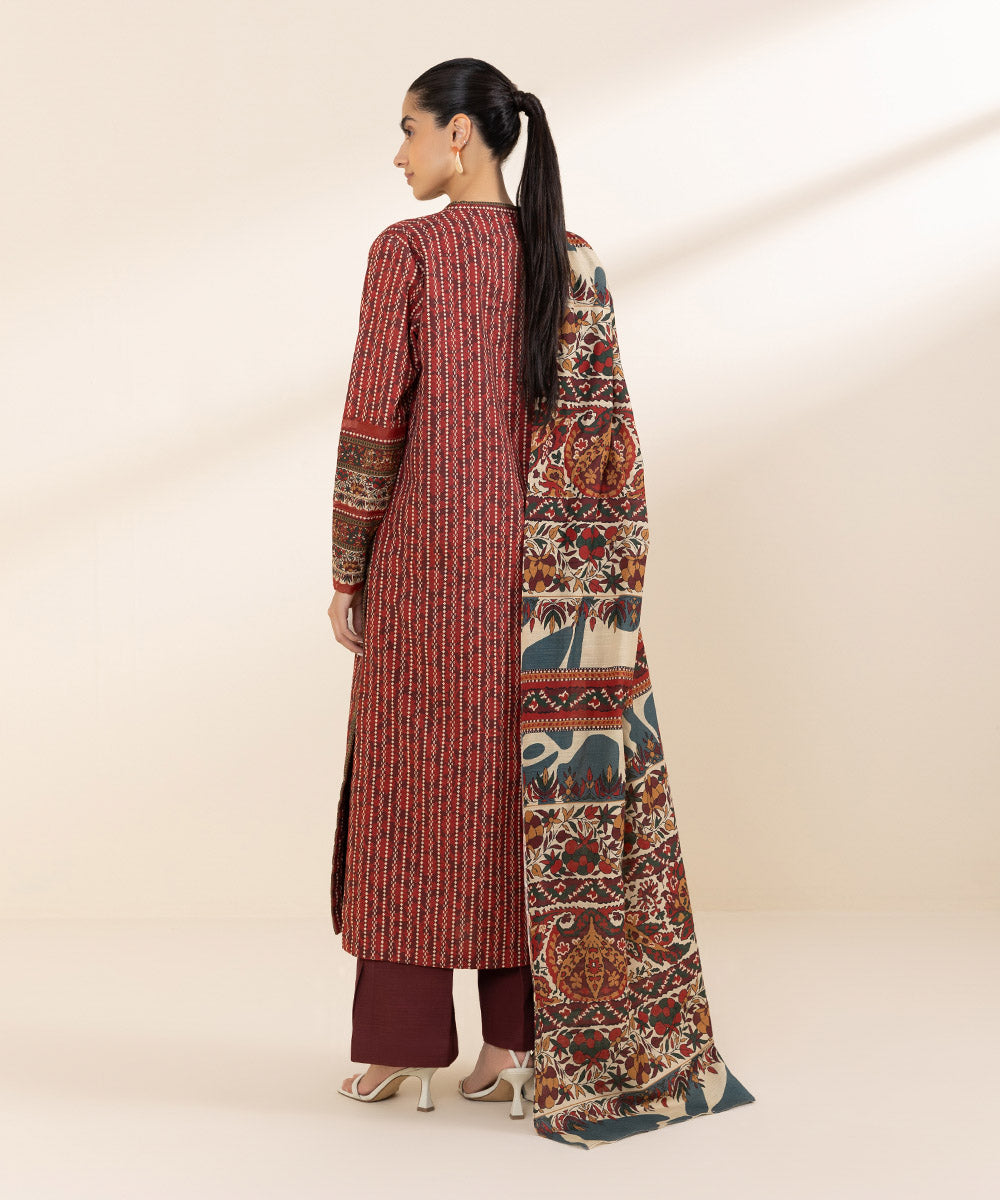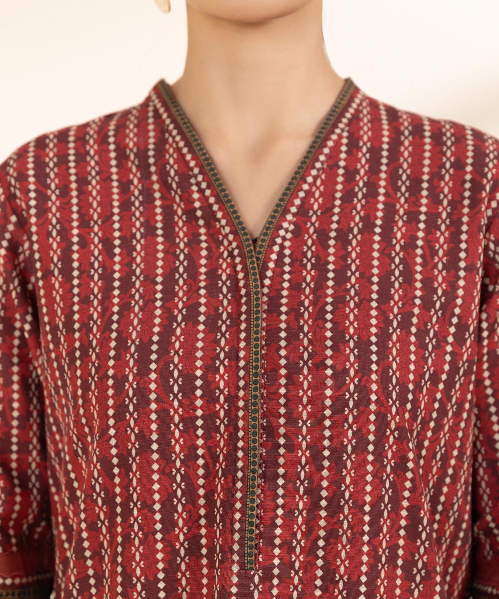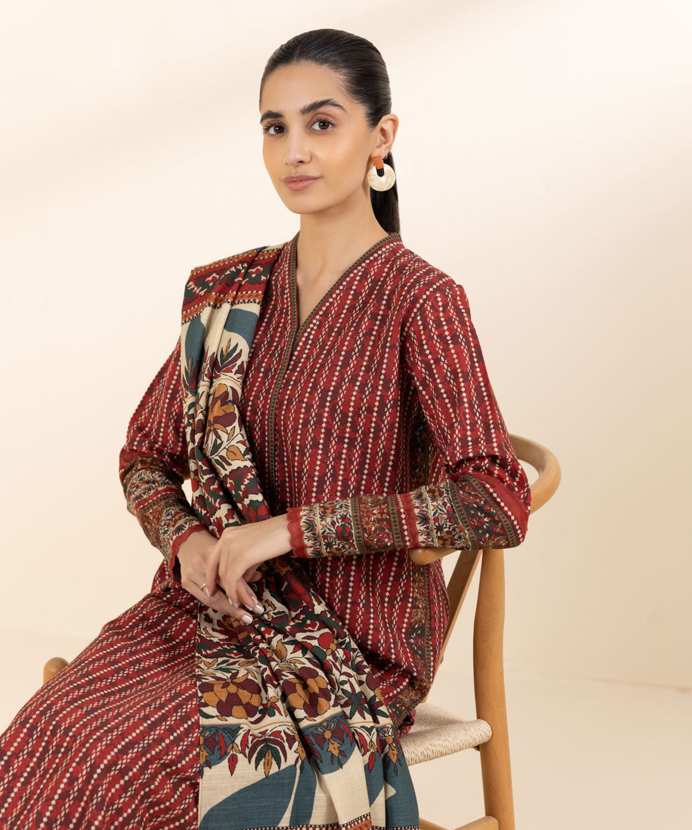 Step out confidently this fall in our printed multi coloured and blood red two-piece featuring a khaddar shirt and solid trousers.