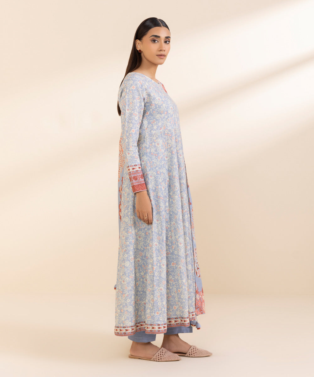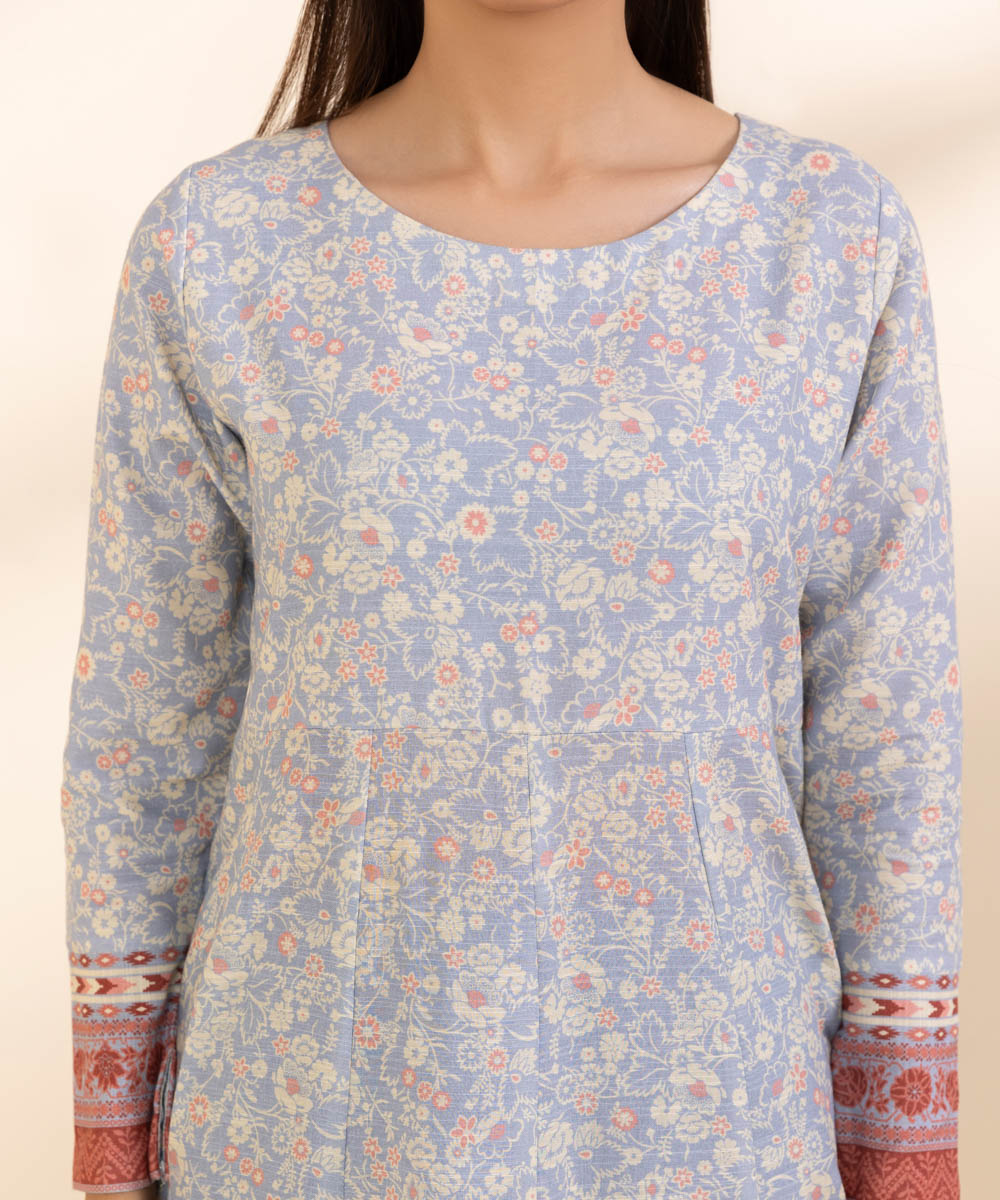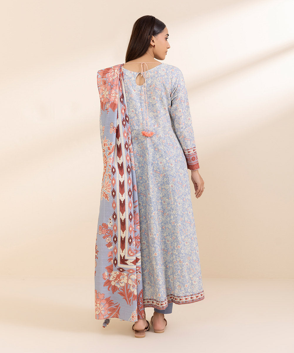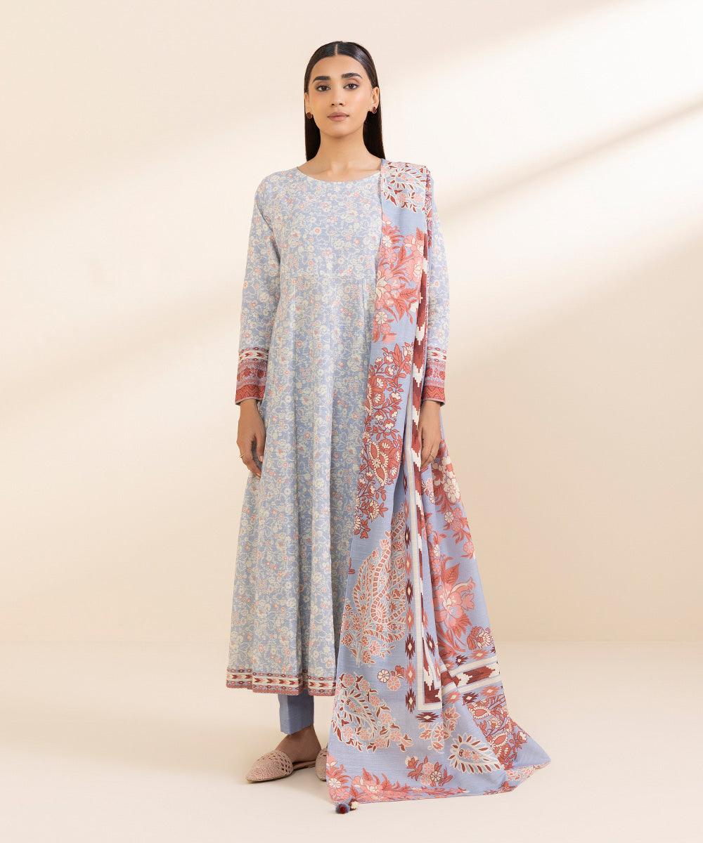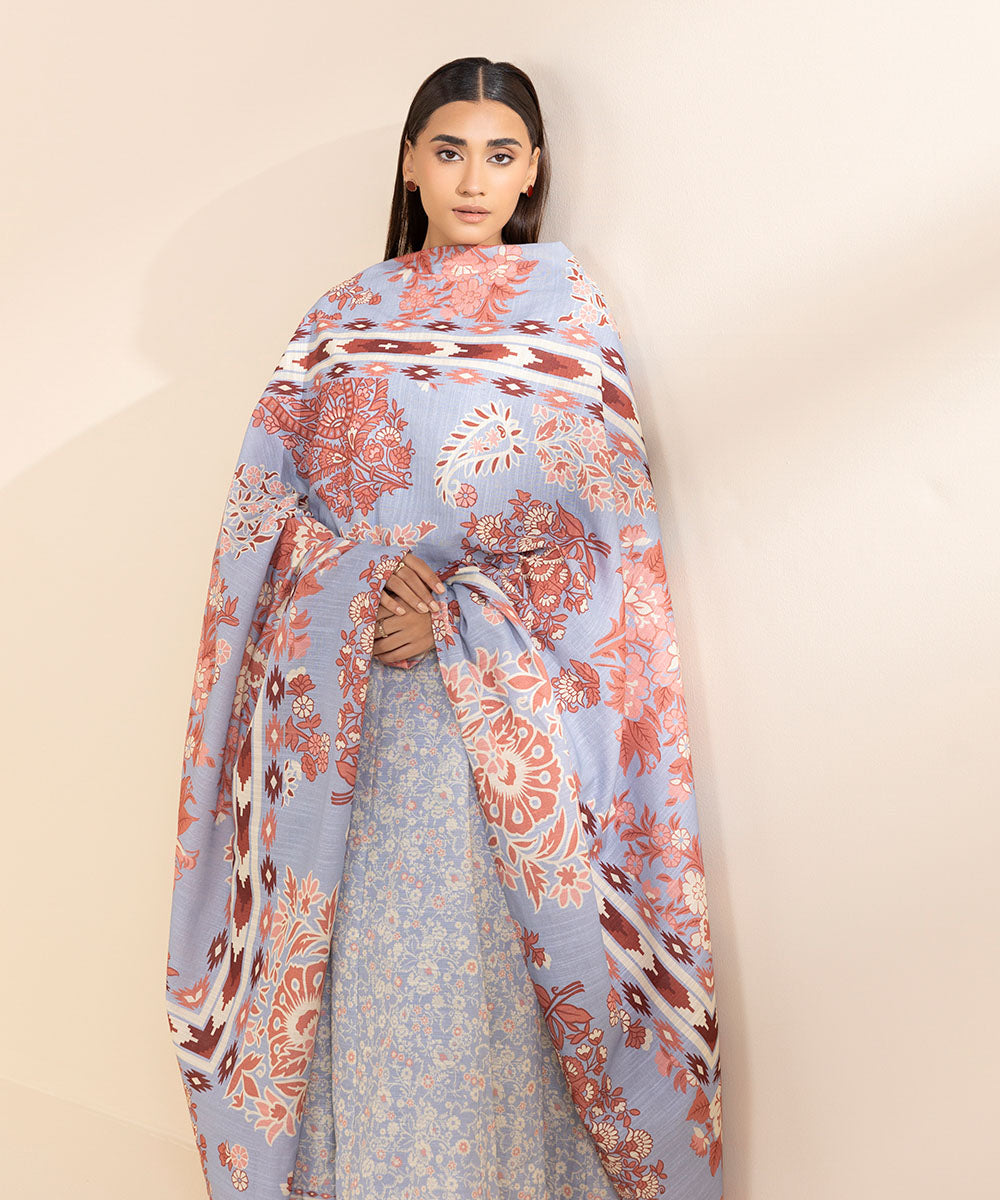 Make a striking statement this season with our printed three-piece ensemble in light blue featuring a khaddar shirt paired with dyed trousers and a multicoloured blended shawl.