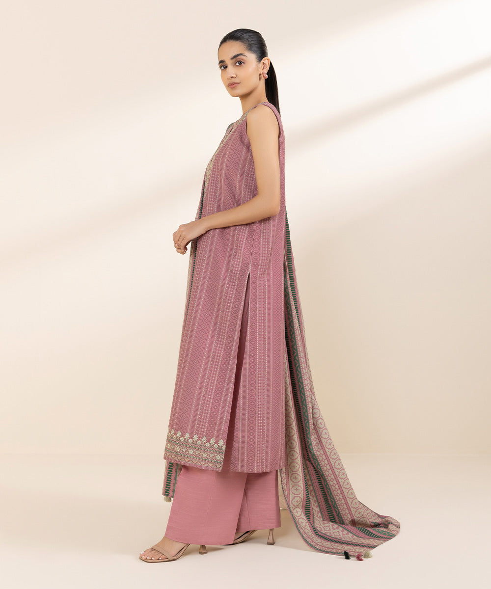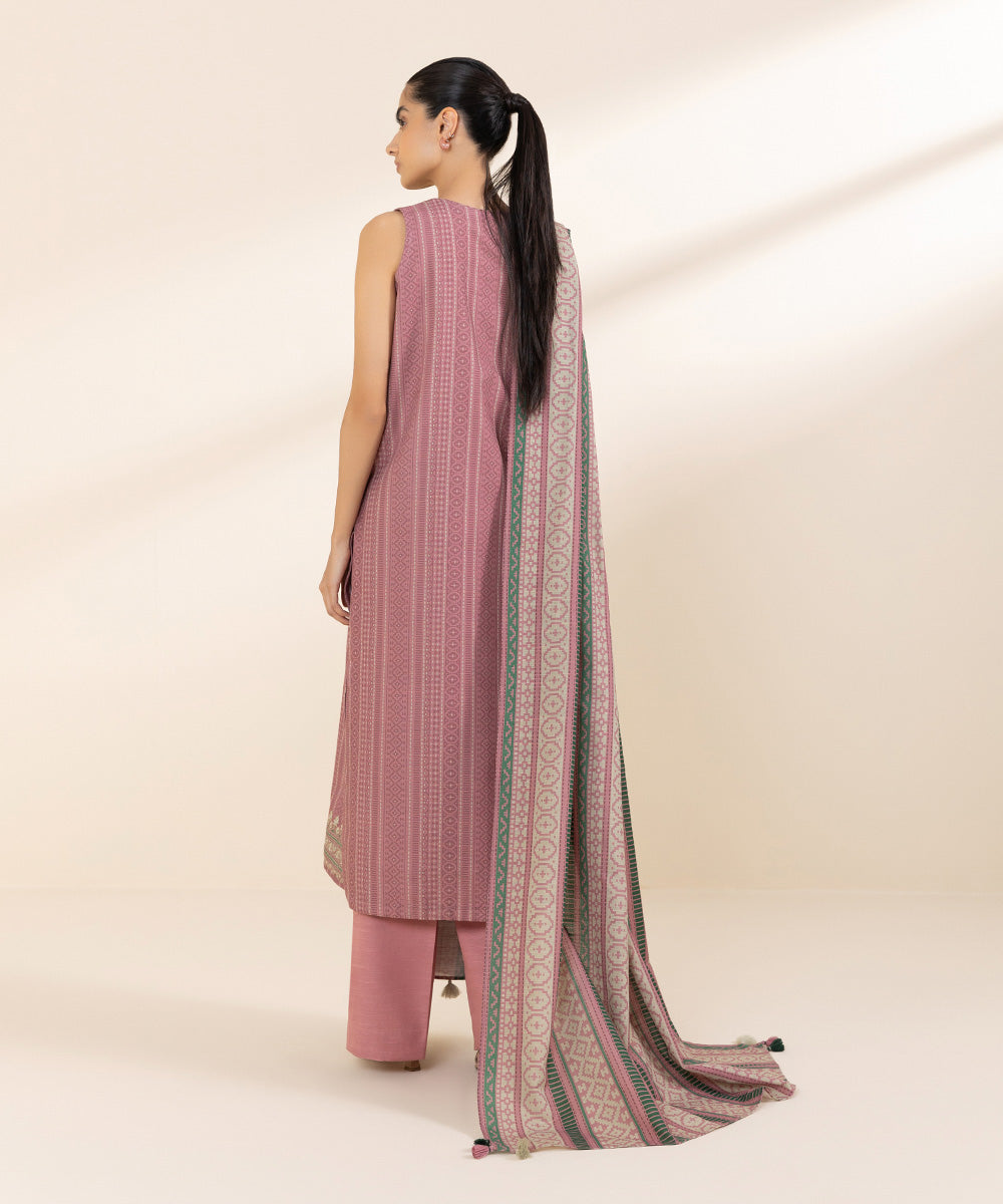 Step out confidently this fall in our printed tea pink two-piece featuring a light khaddar shirt and  solid trousers.