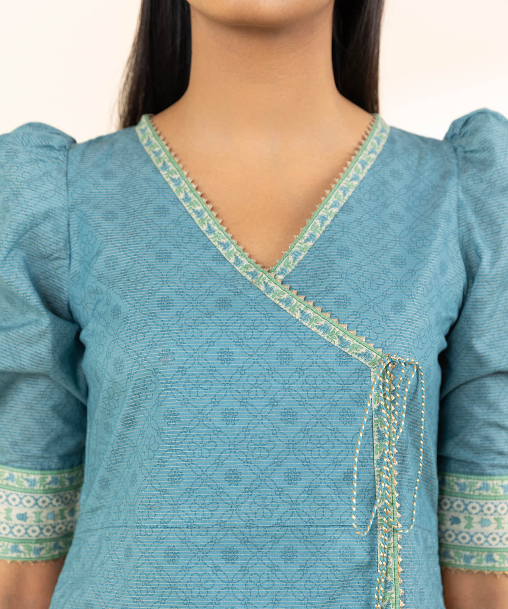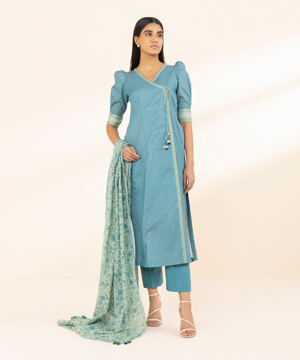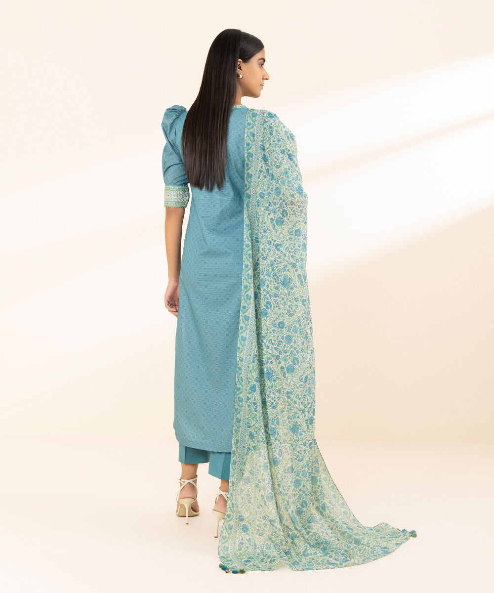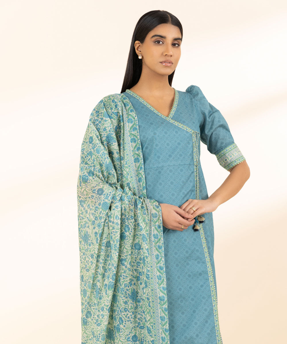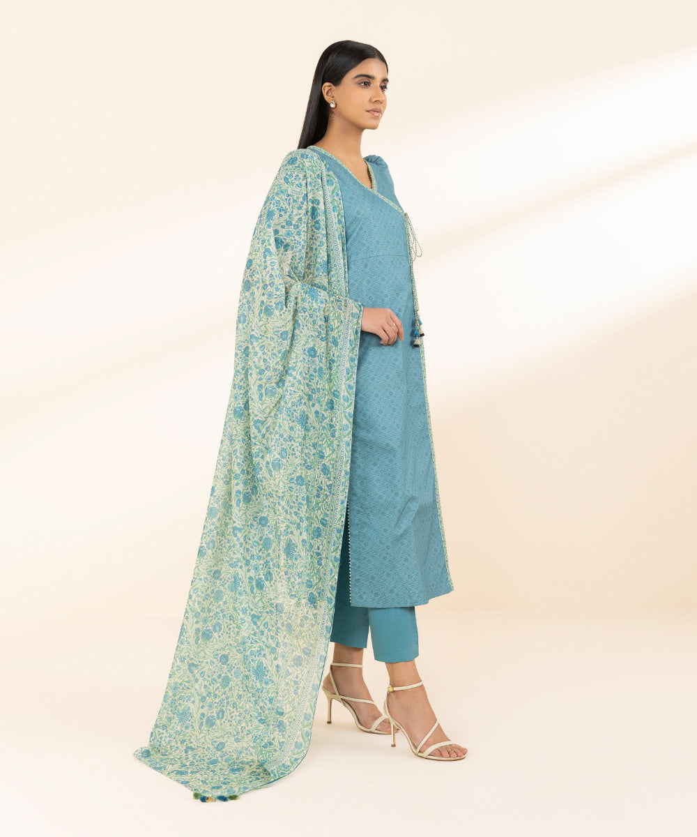 Make a statement in our blue and cream white printed shirt and voile dupatta ensemble.