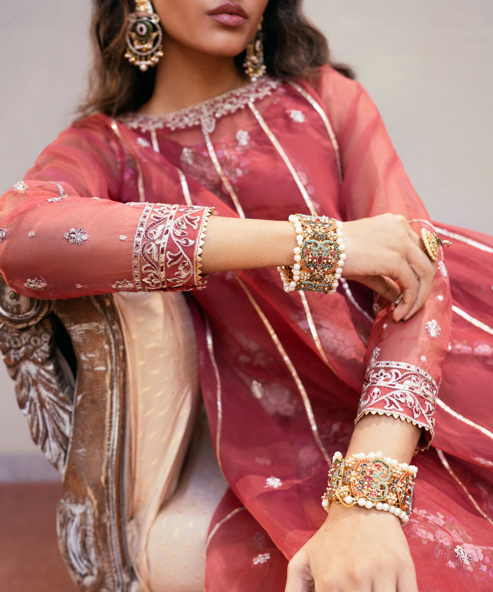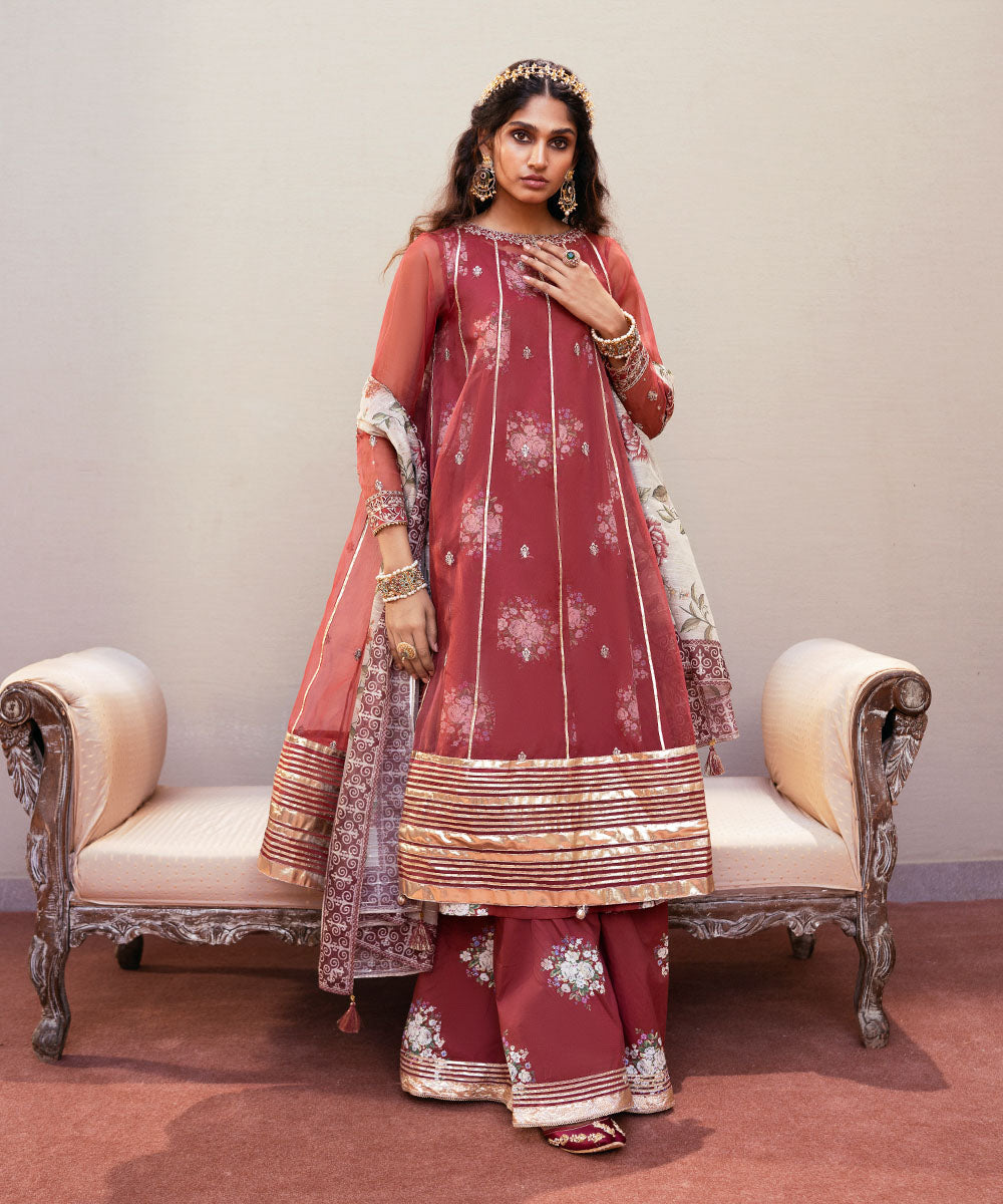 Elevate your festive wardrobe in our embroidered maroon, blended organza, flared A-line shirt with a round neckline.