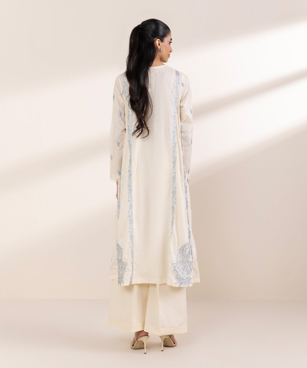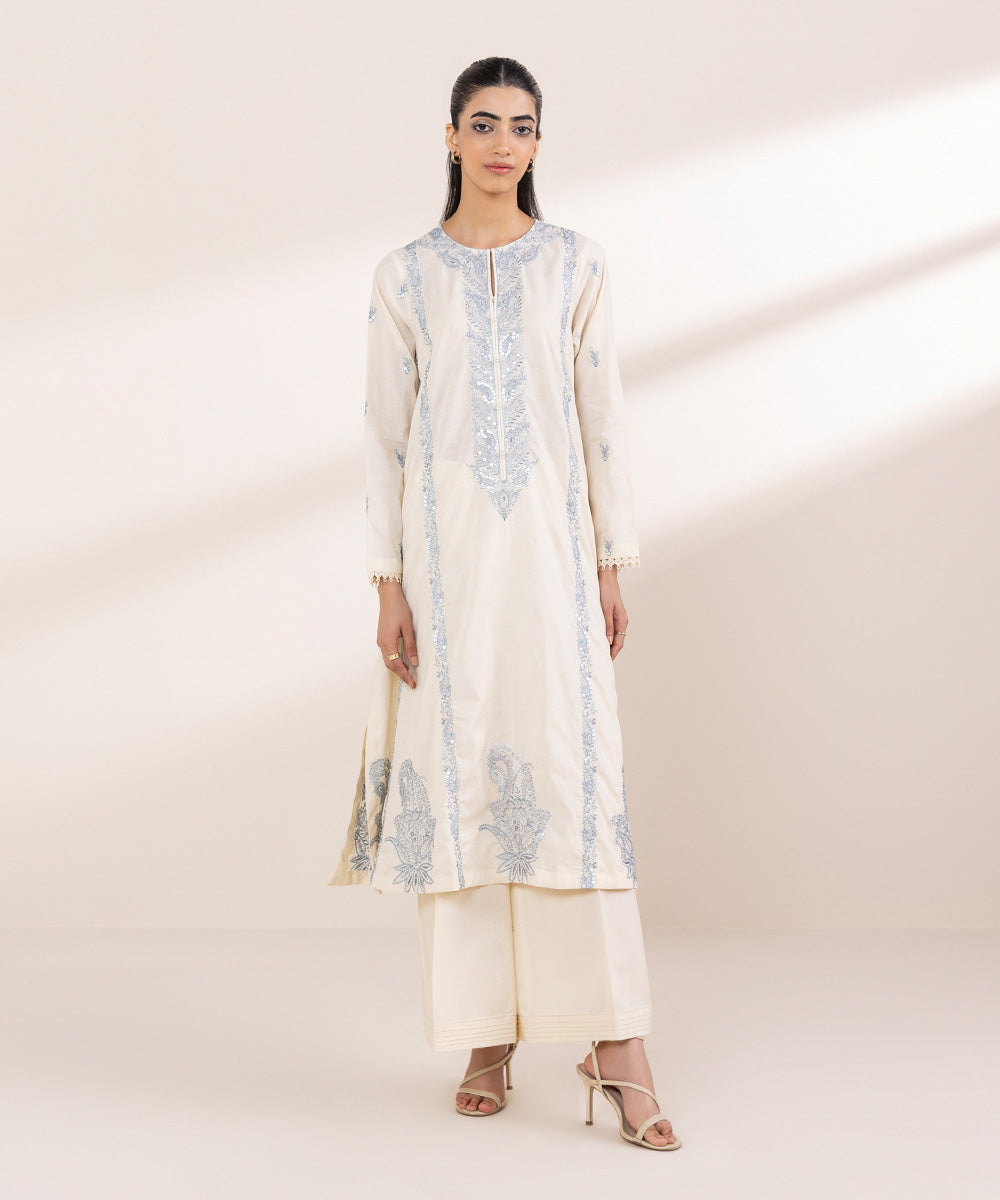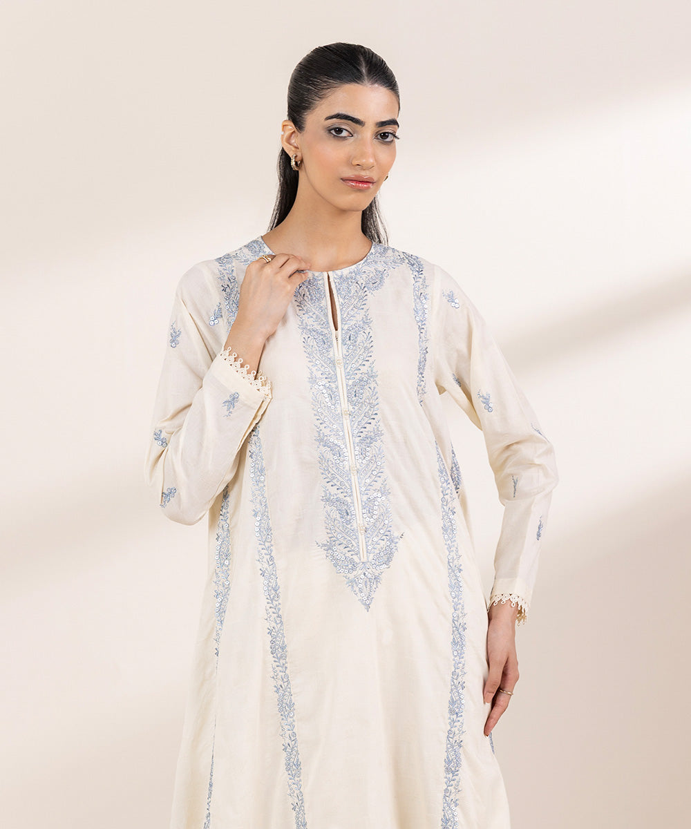Step out in style in our embroidered off white cotton jacquard A-line shirt with a round neckline and slit.