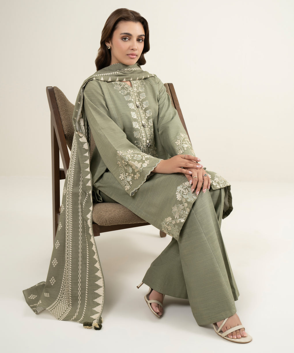 Make a statement with our three-piece embroidered ensemble featuring a khaddar shirt and trousers paired with a blended shawl.