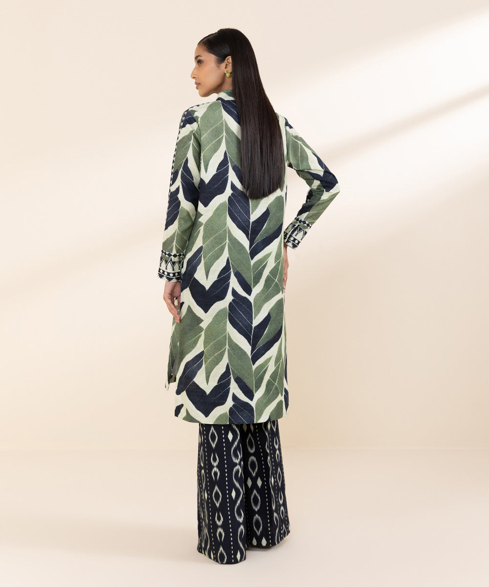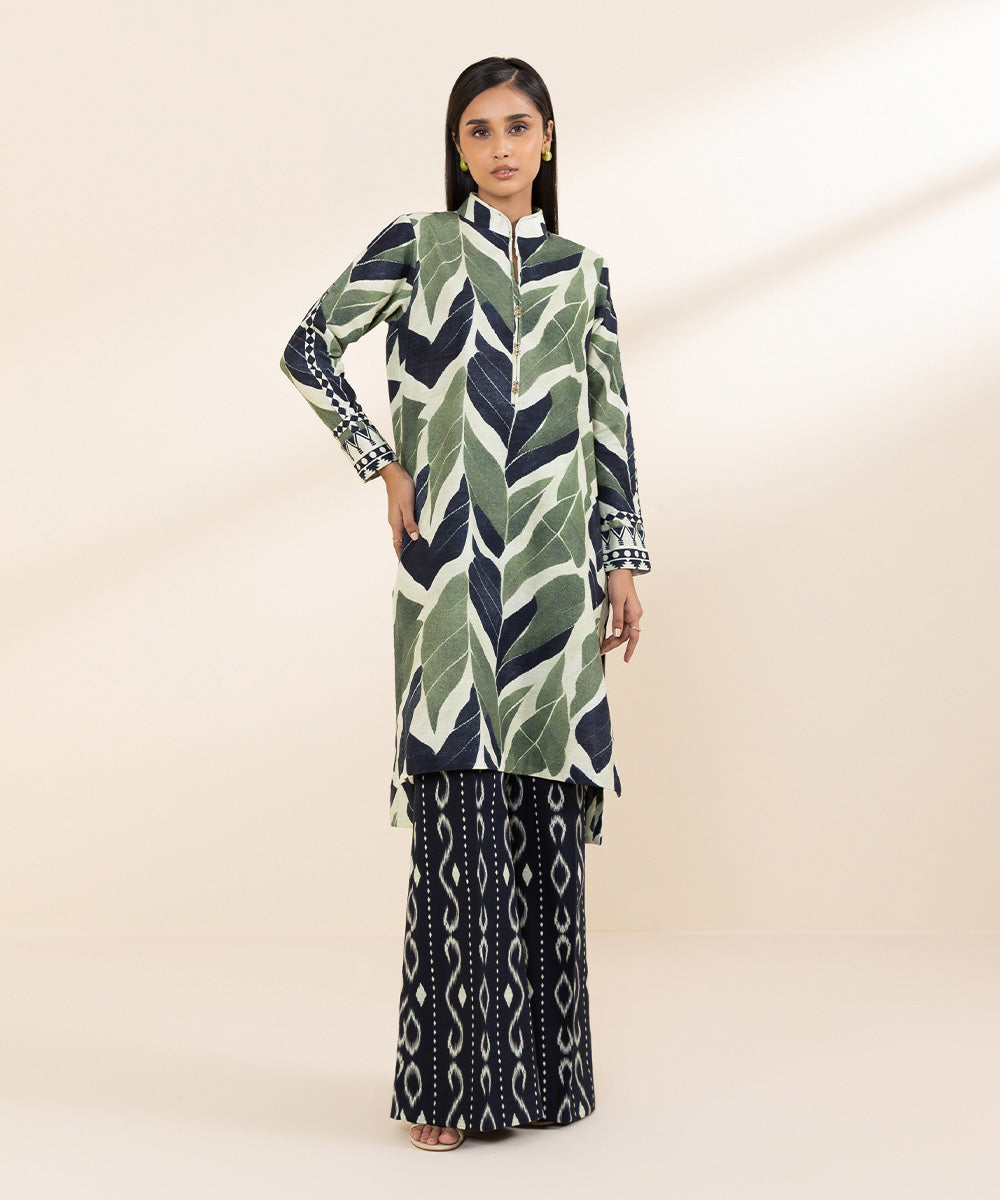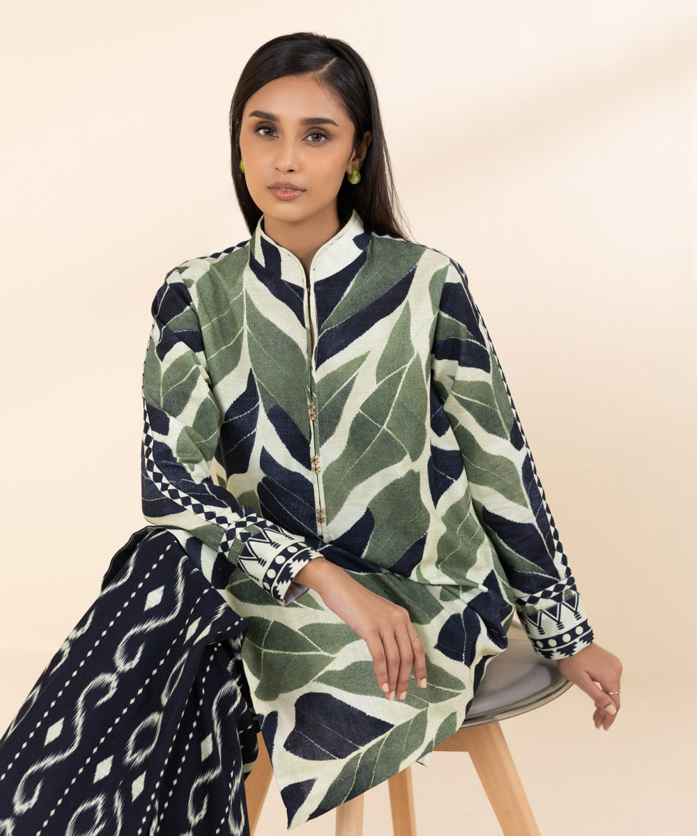 Nail the trendy winter look with our khaddar sage green and blue two-piece featuring printed shirt and trousers.