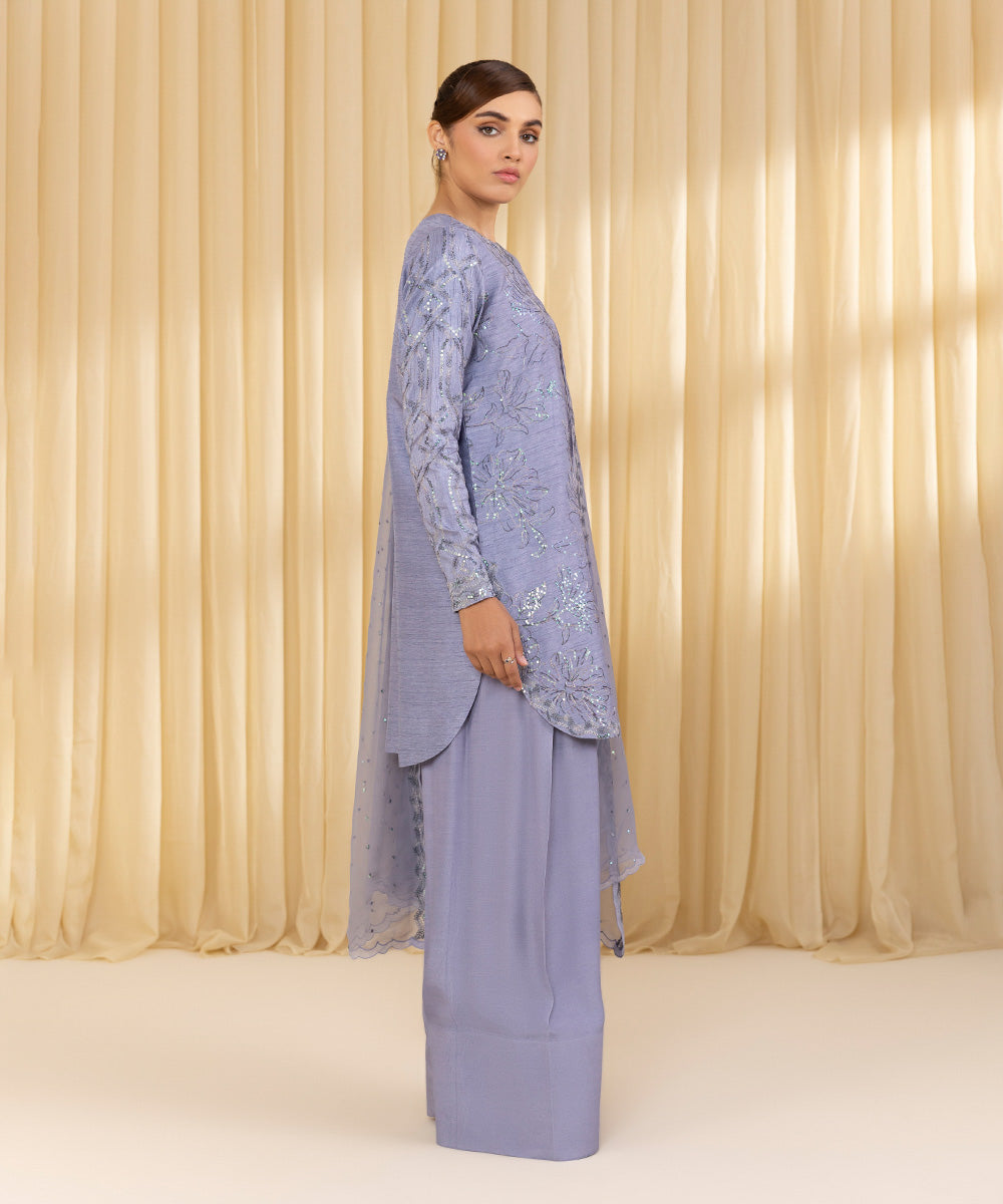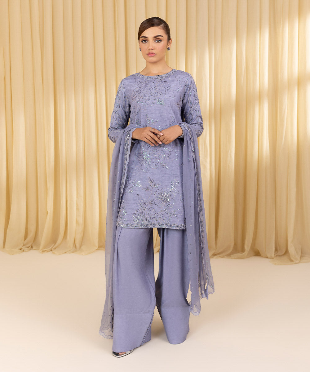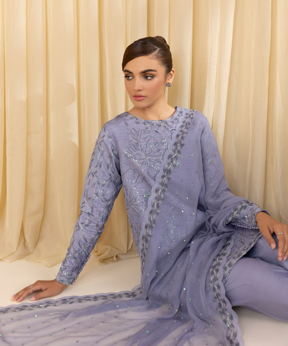 Make a statement in our embroidered light purple raw silk shirt and trousers ensemble with a crinkle chiffon dupatta.