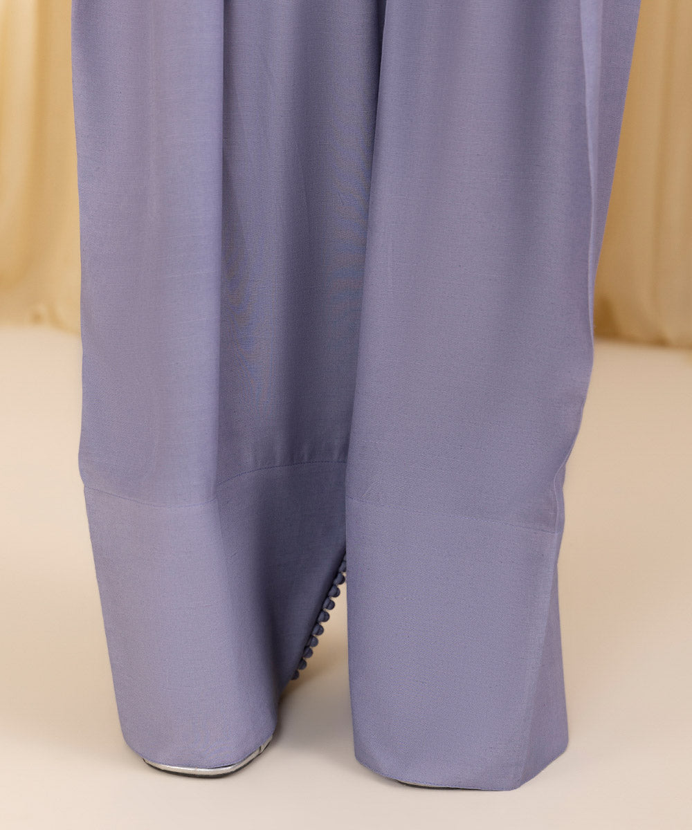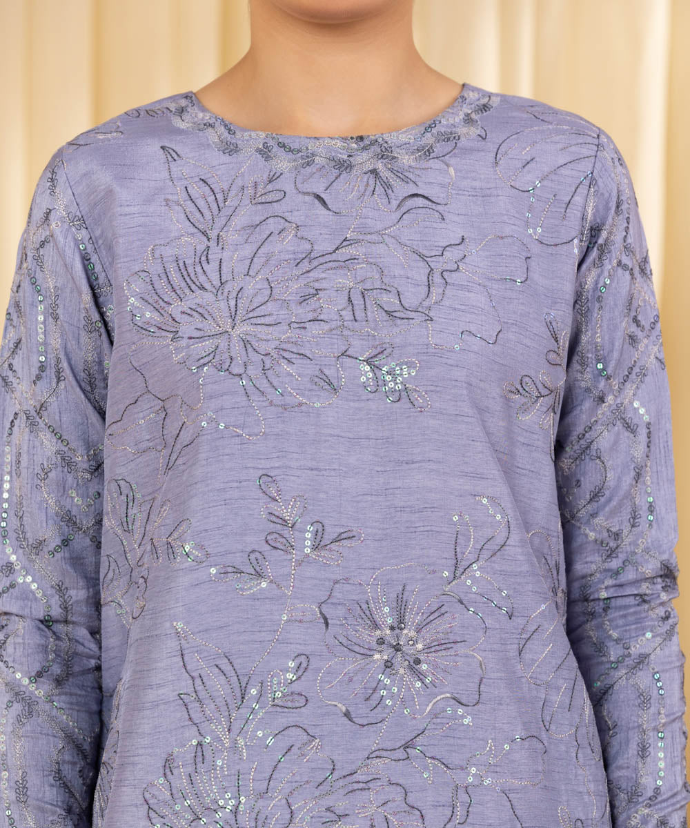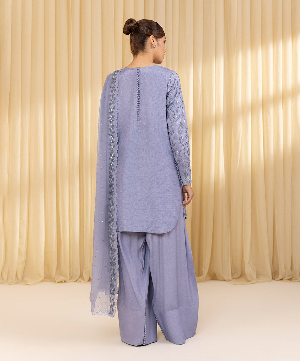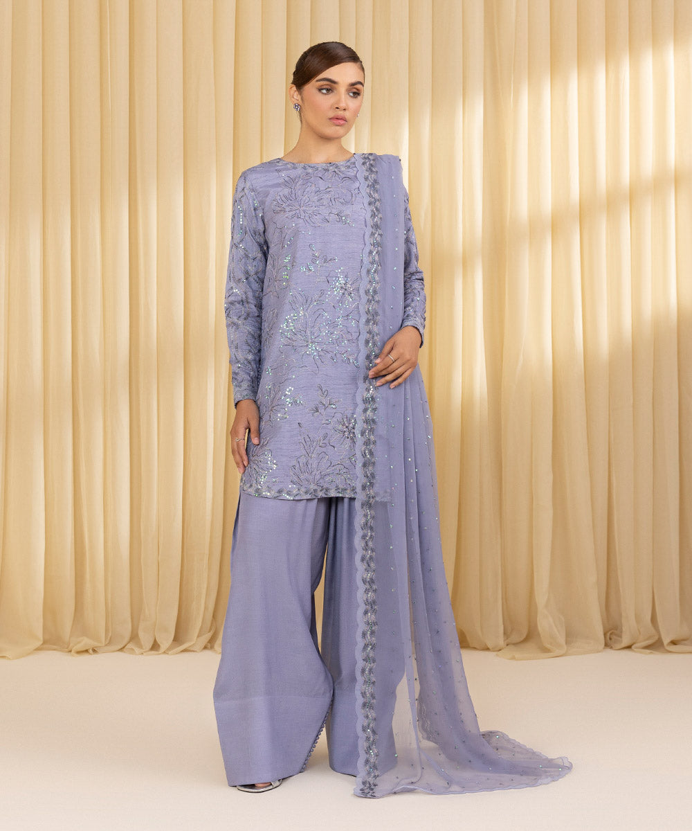 Make a statement in our embroidered light purple raw silk shirt and trousers ensemble with a crinkle chiffon dupatta.