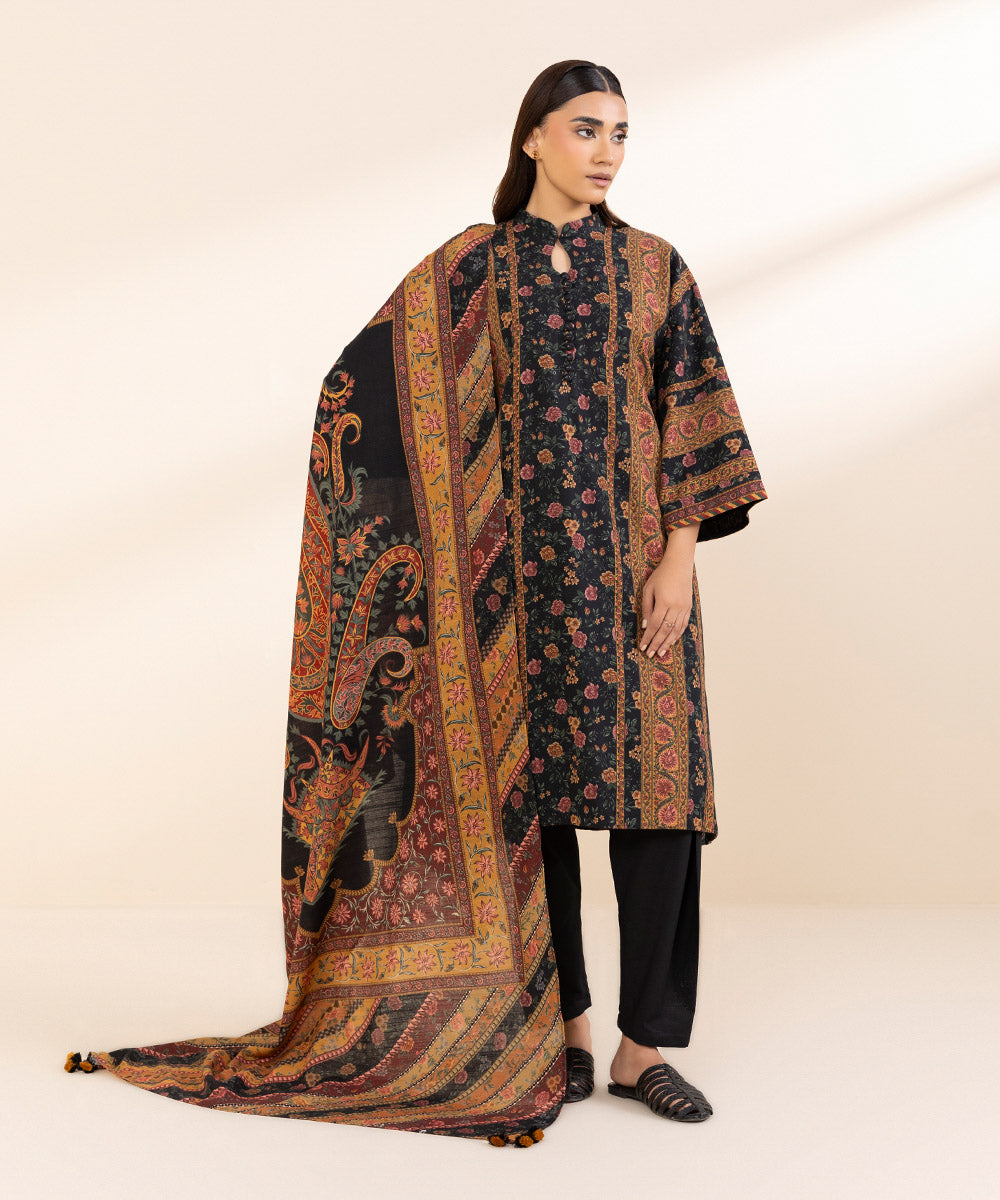 Embrace winter chill with our printed three-piece black light khaddar suit fabric with a matching dupatta.