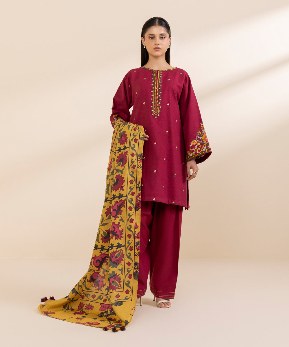 Make a statement this winter in our two-piece embroidered, fuchsia pink khaddar shirt with a trouser