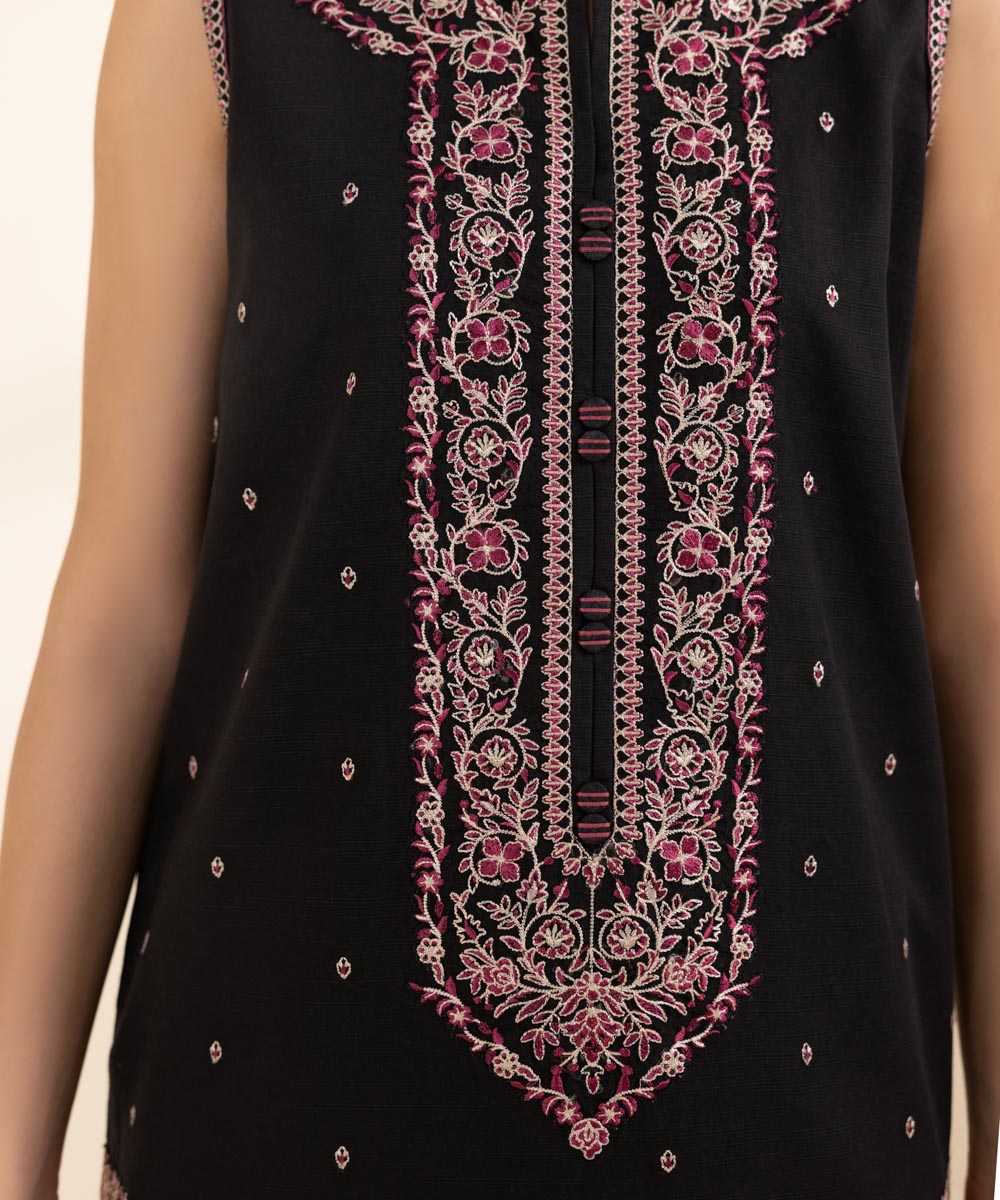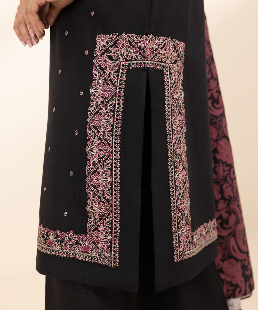 Step out confidently this fall in our pink and black two-piece including a khaddar solid embroidered shirt and solid trousers.