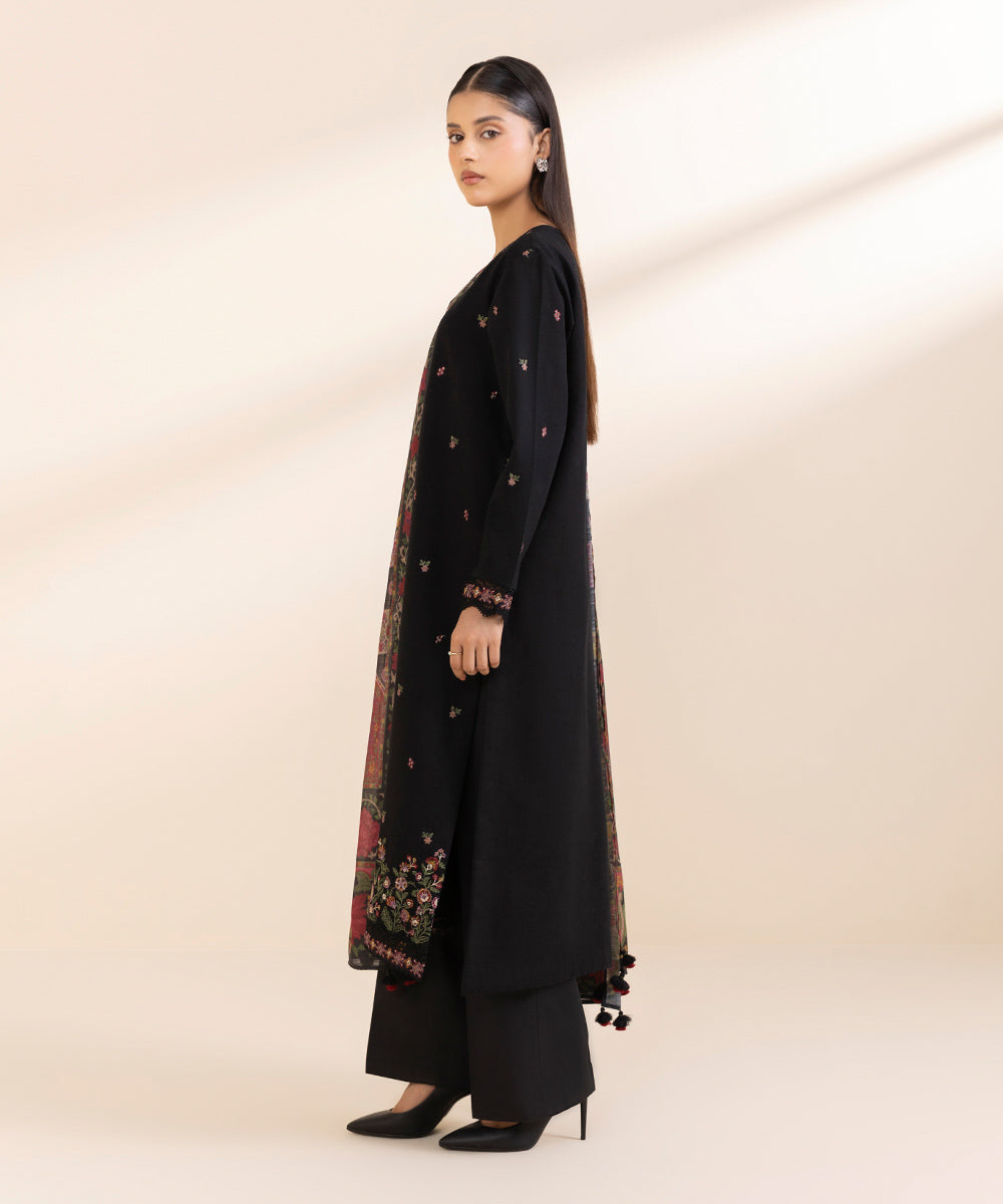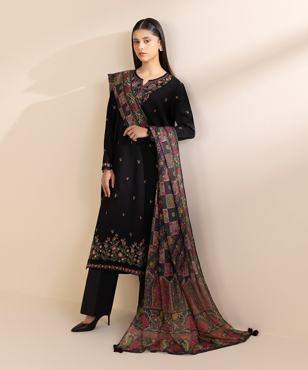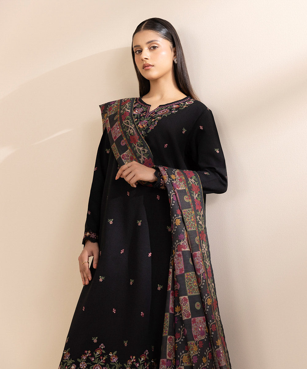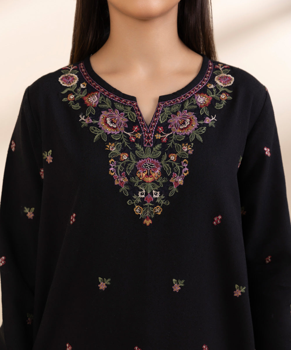 Make a statement this winter in our two-piece embroidered, black cotton karandi shirt with a dyed trouser