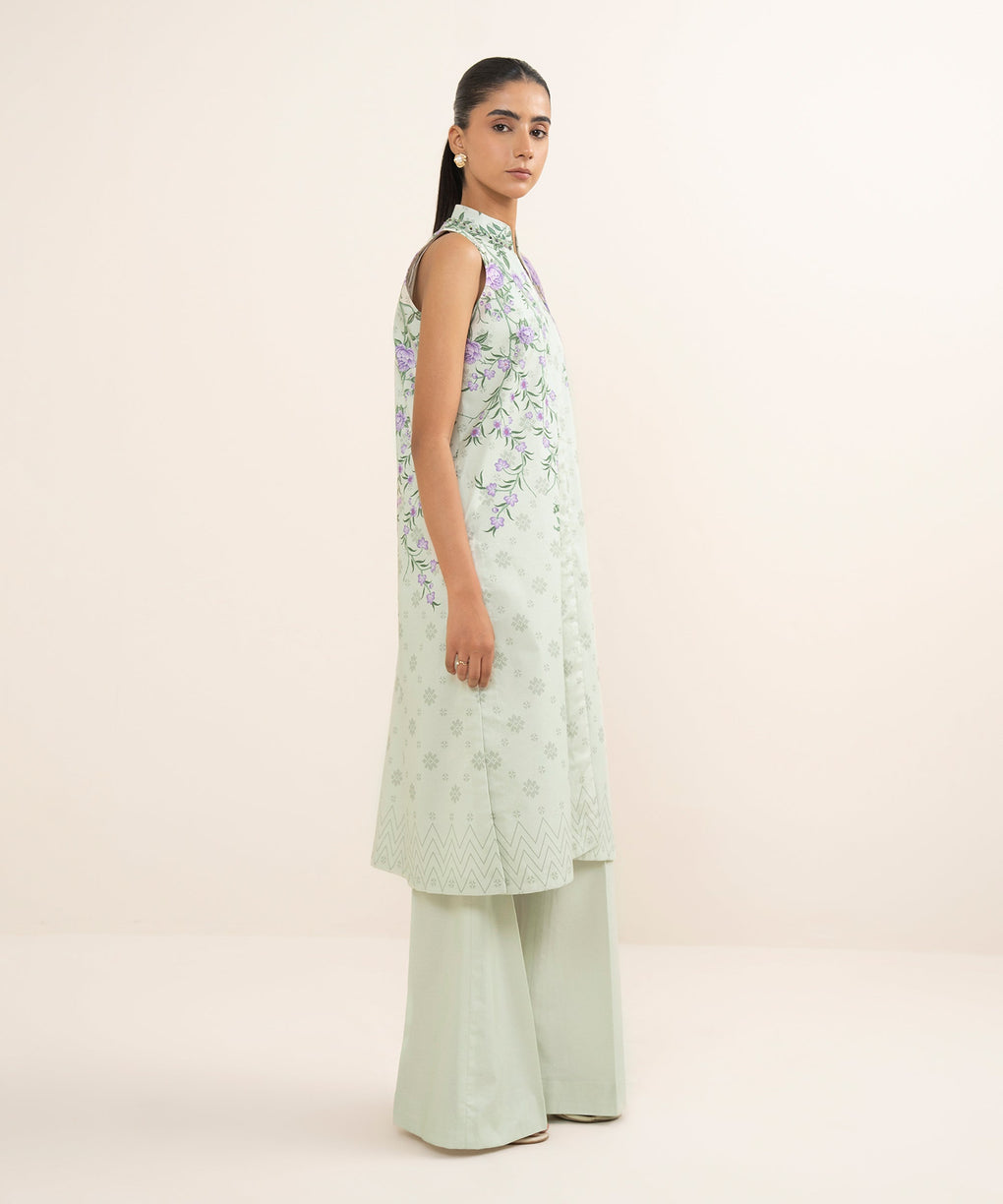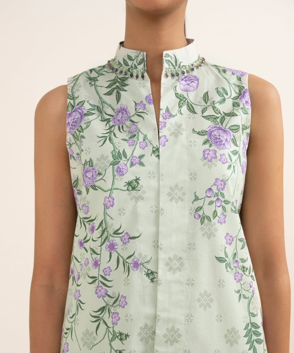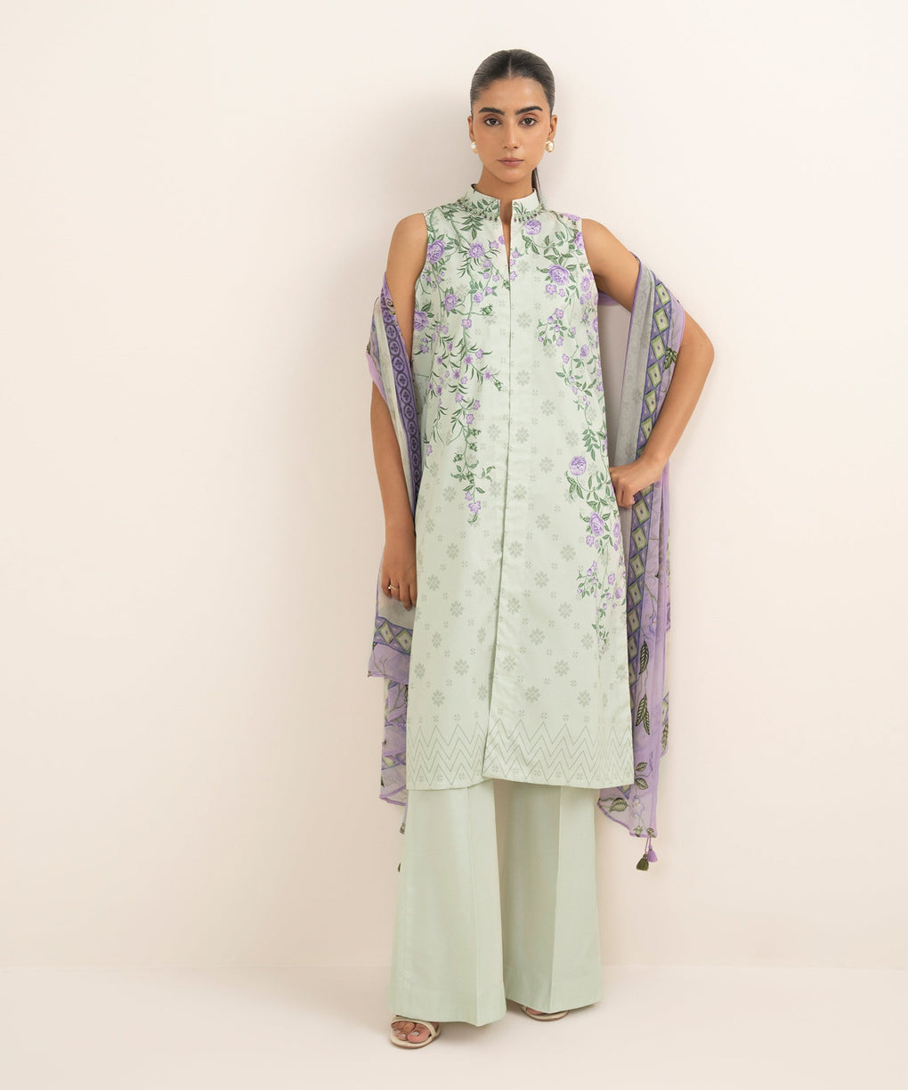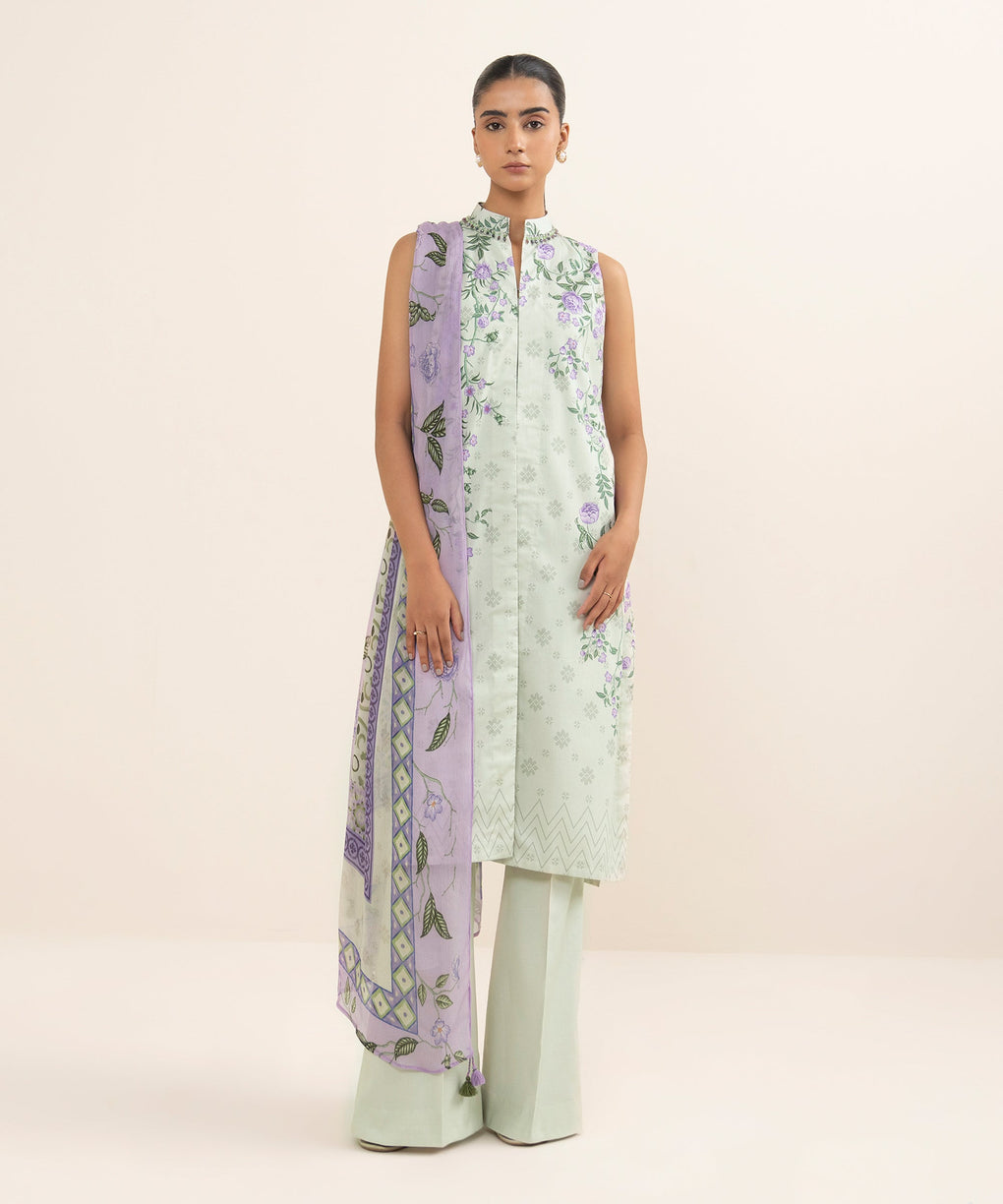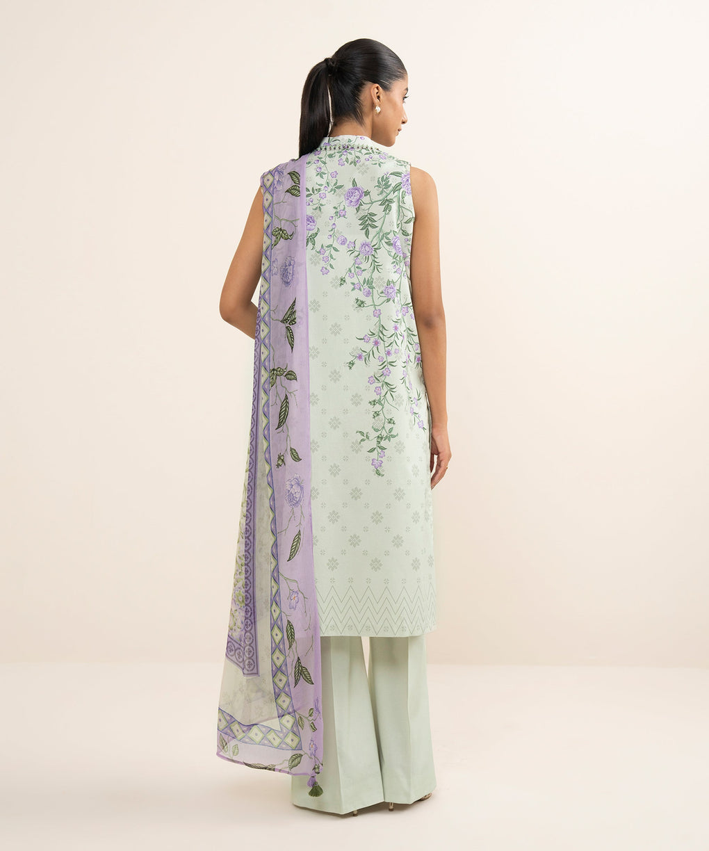 Make a statement with our three-piece printed beige and purple ensemble featuring a lawn shirt paired with a blended chiffon dupatta and cotton trousers.
